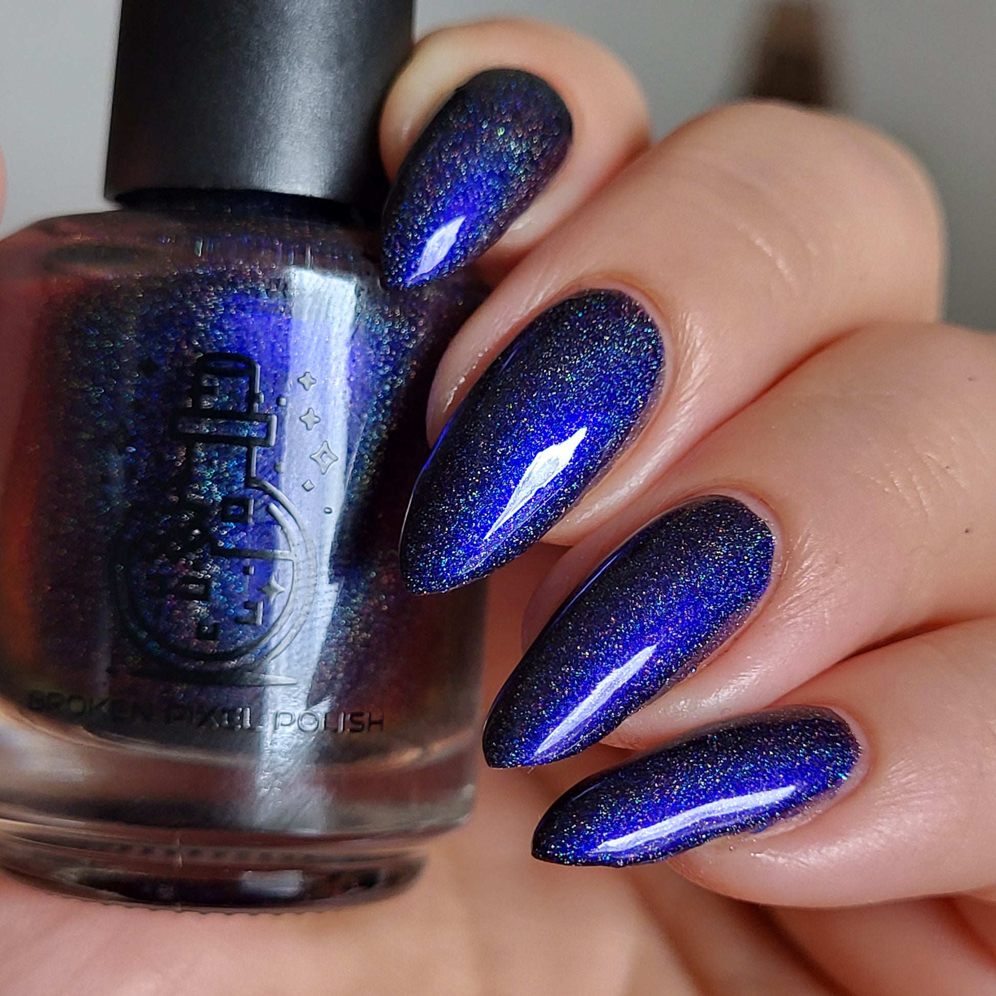 This is a pure blue-black multichrome polish packed with scattered holo. A blue sibling to Apocalypse with more concentrated holo.