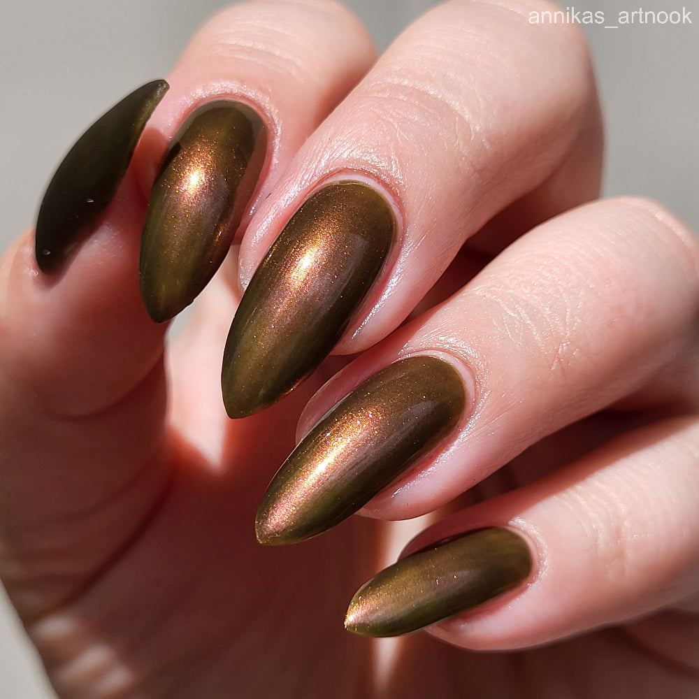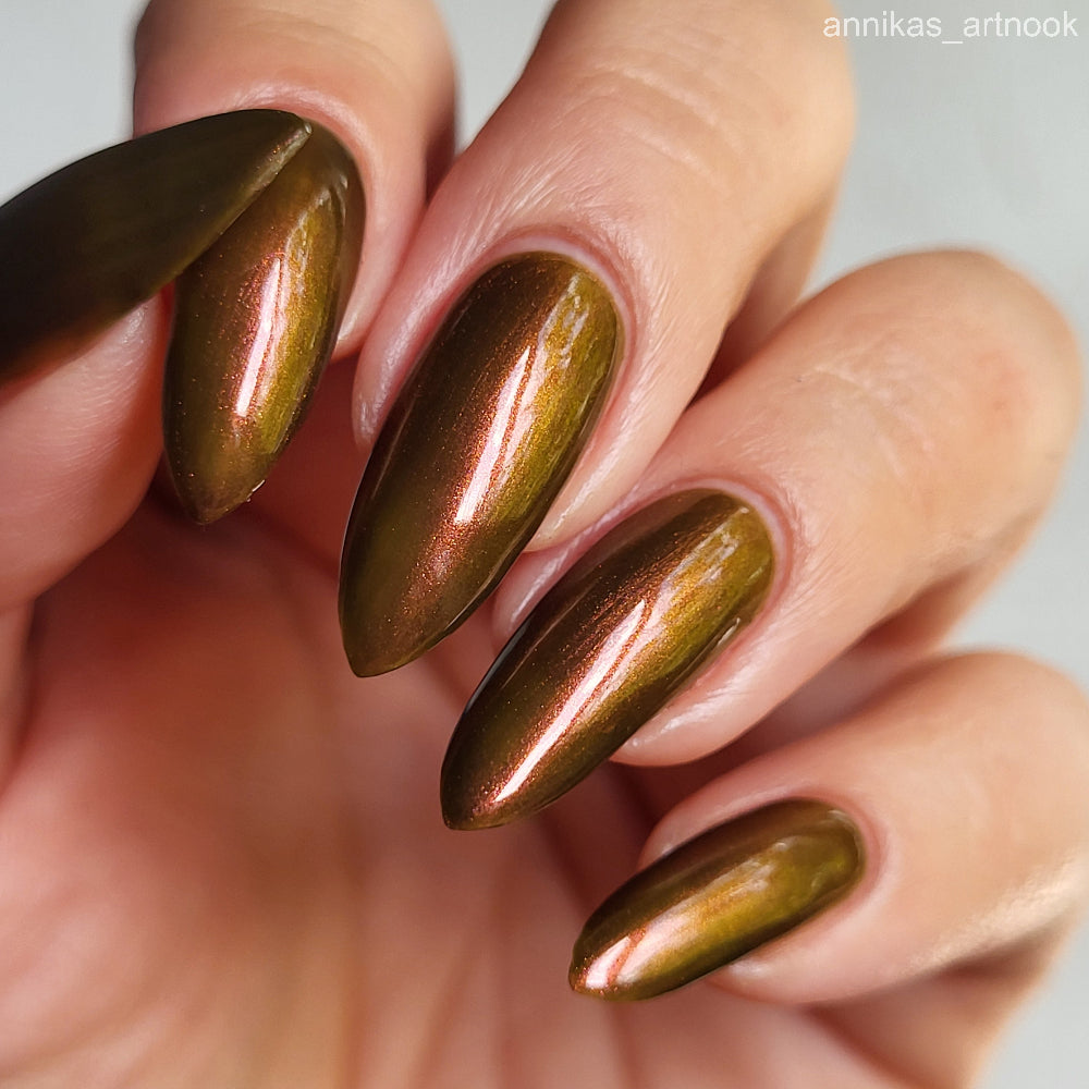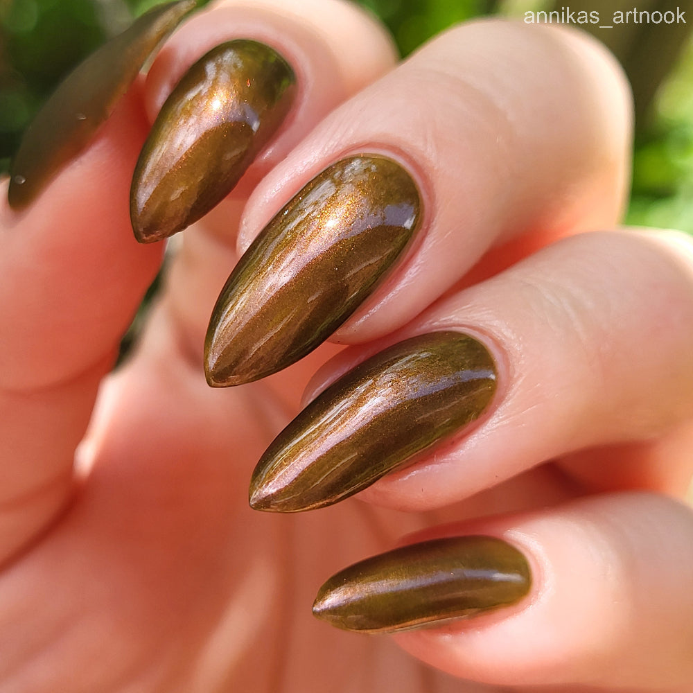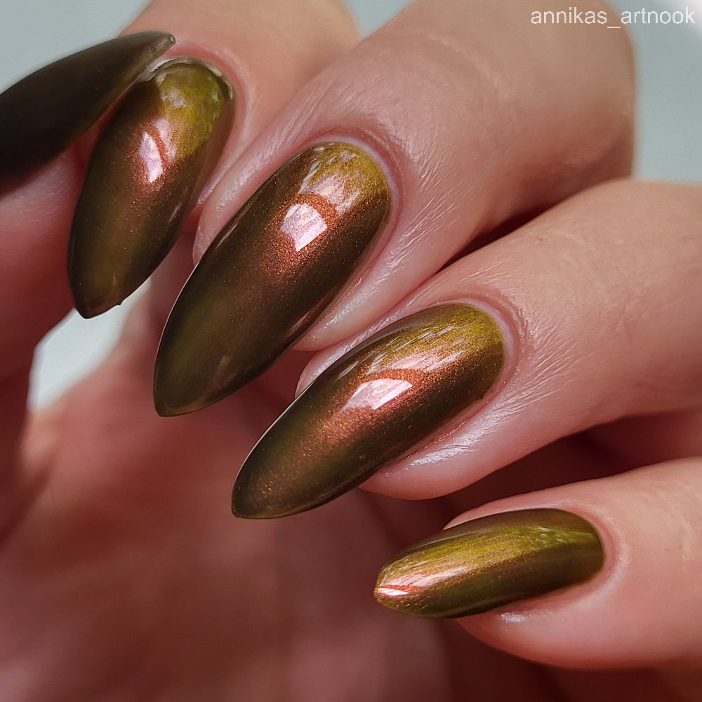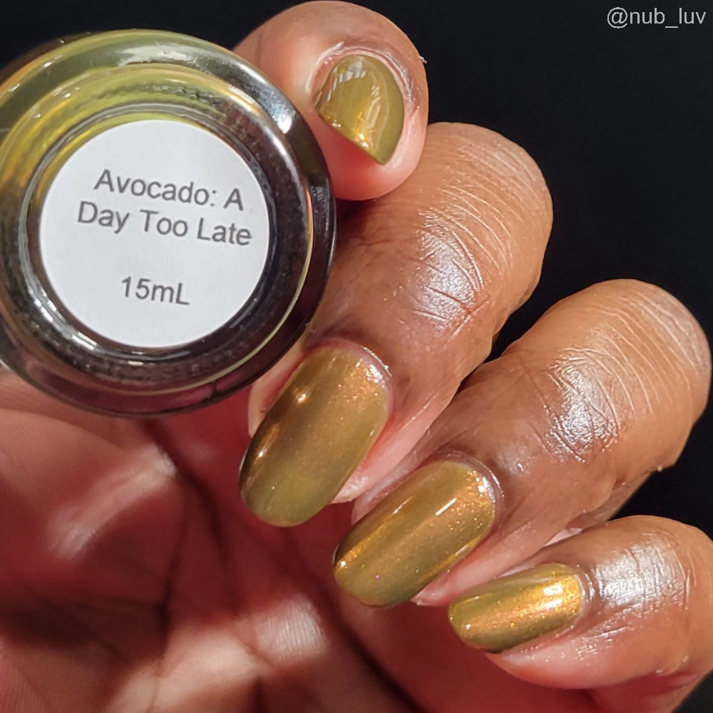 Blackened yellow base with red shimmer giving the appearance of an overripe avocado!