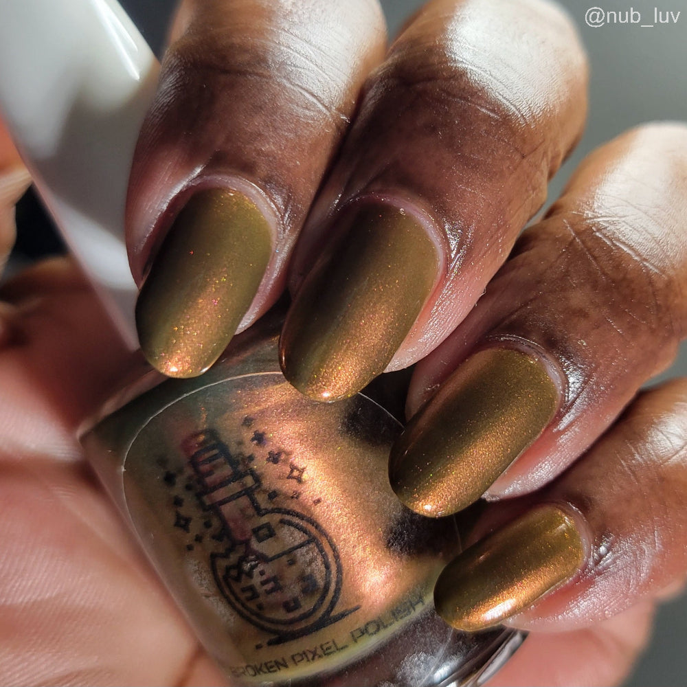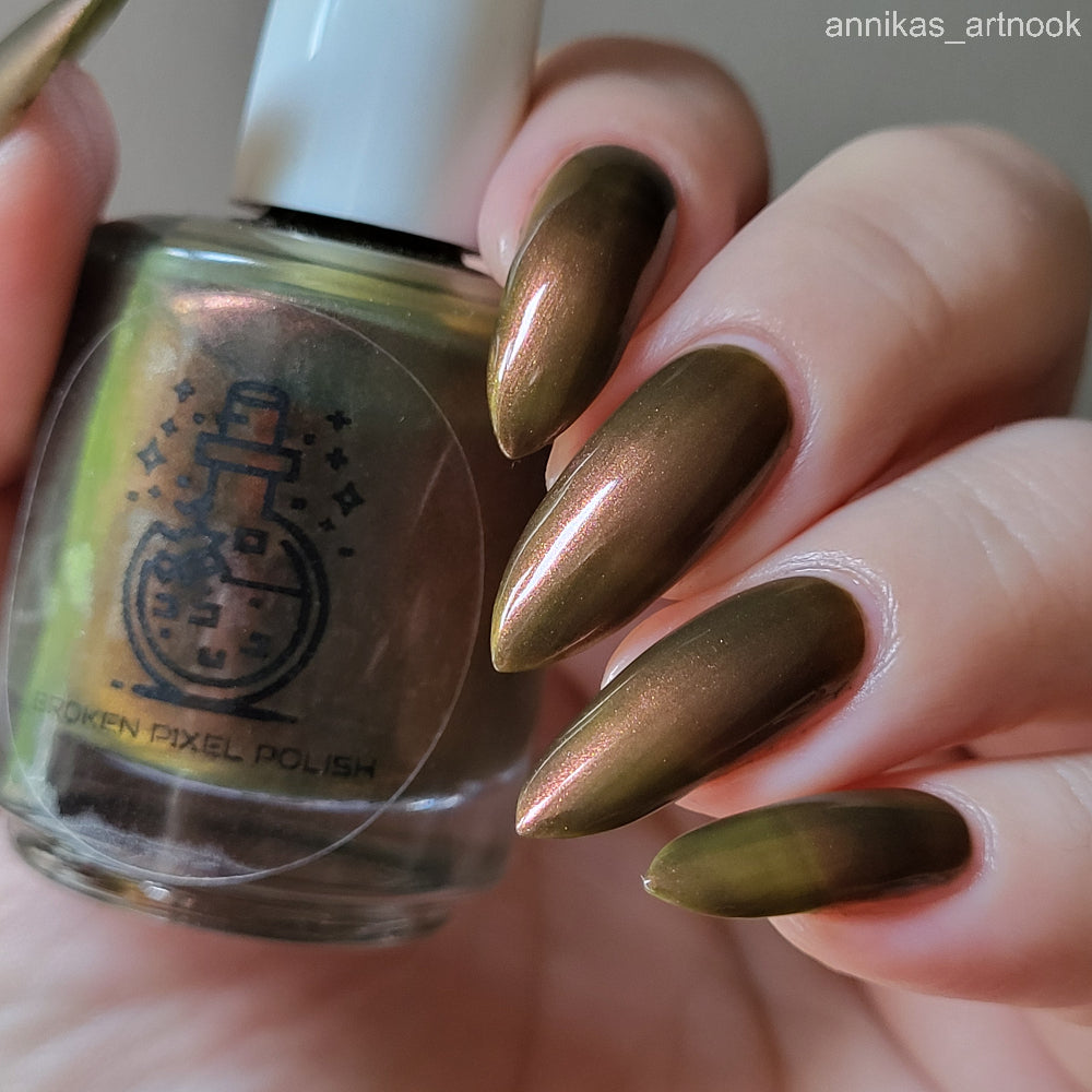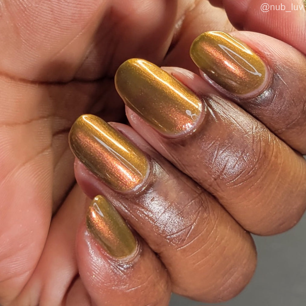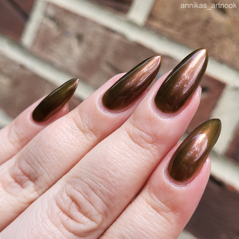 Blackened yellow base with red shimmer giving the appearance of an overripe avocado!