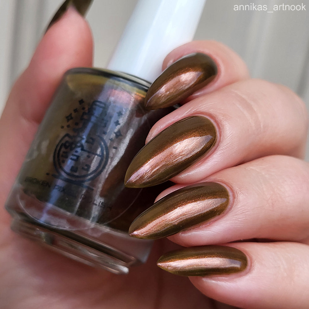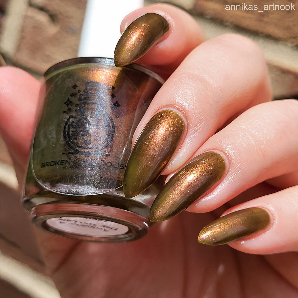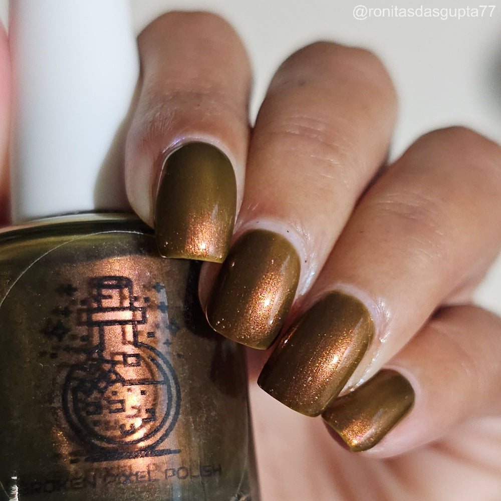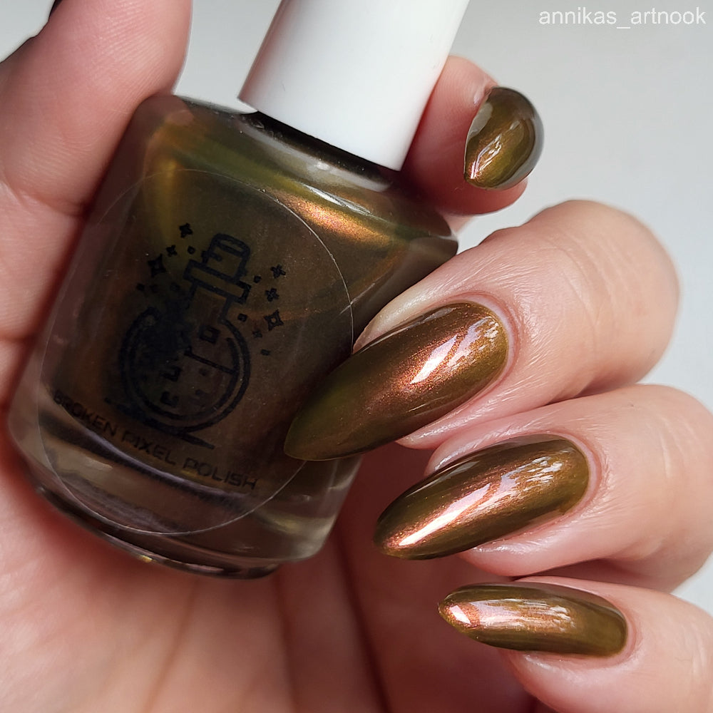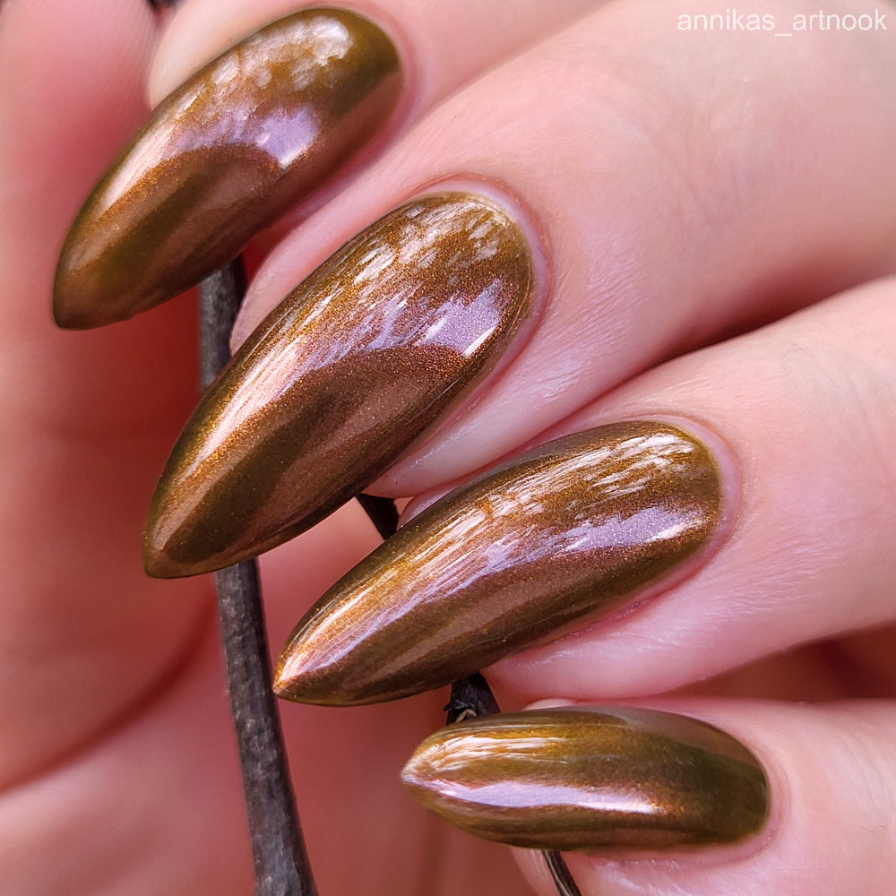 Blackened yellow base with red shimmer giving the appearance of an overripe avocado!