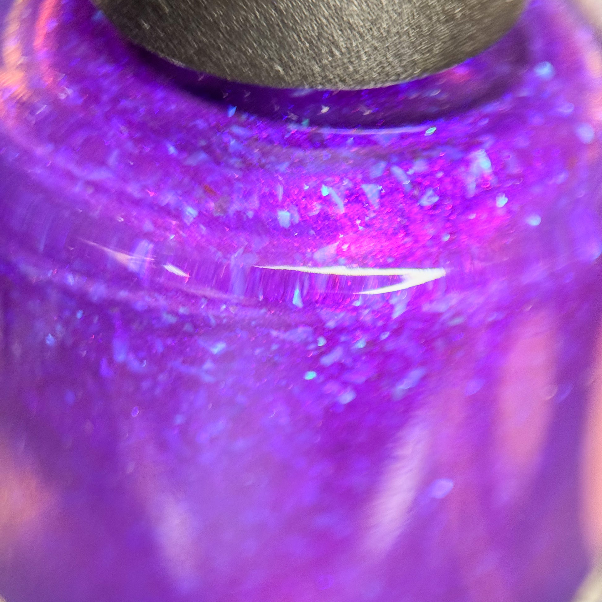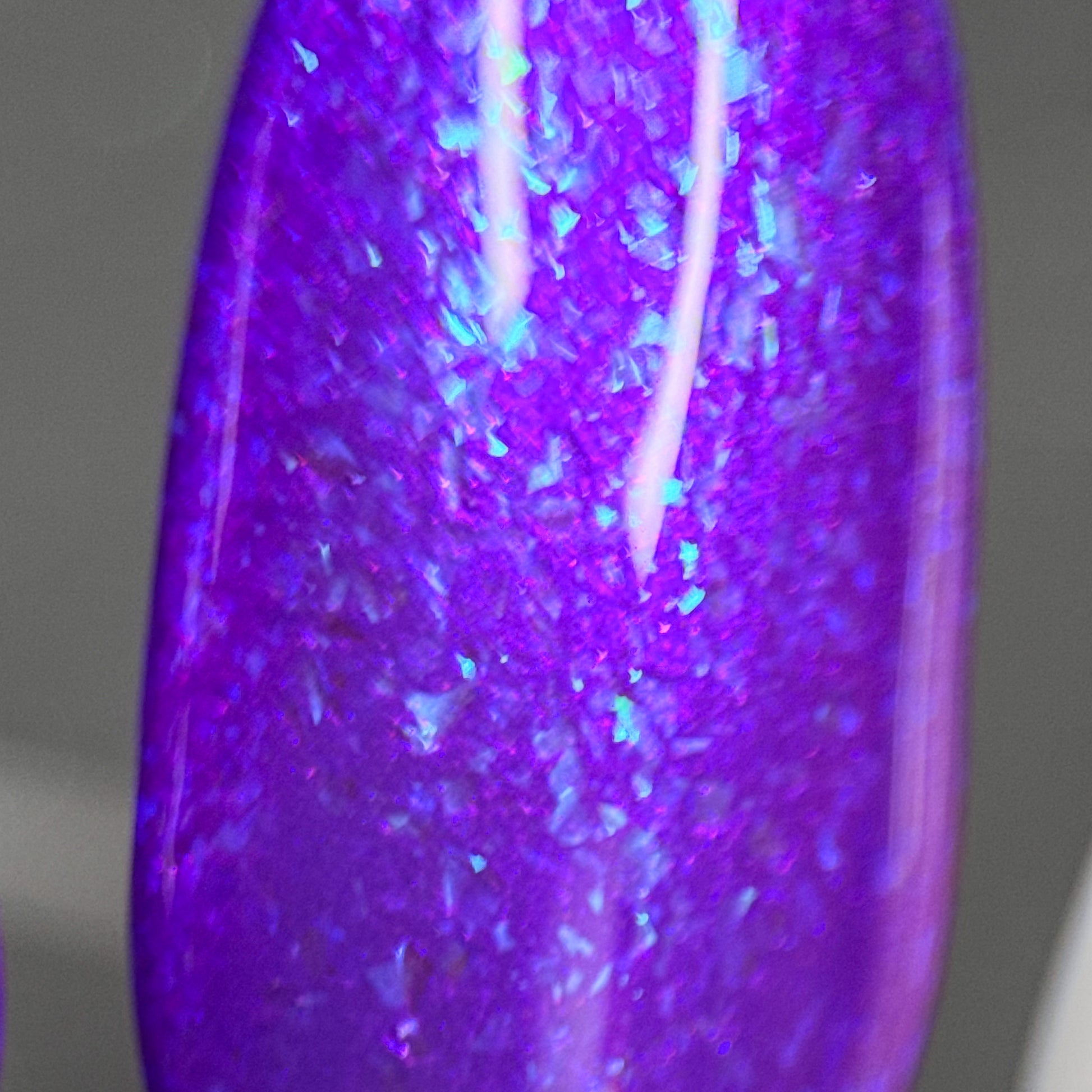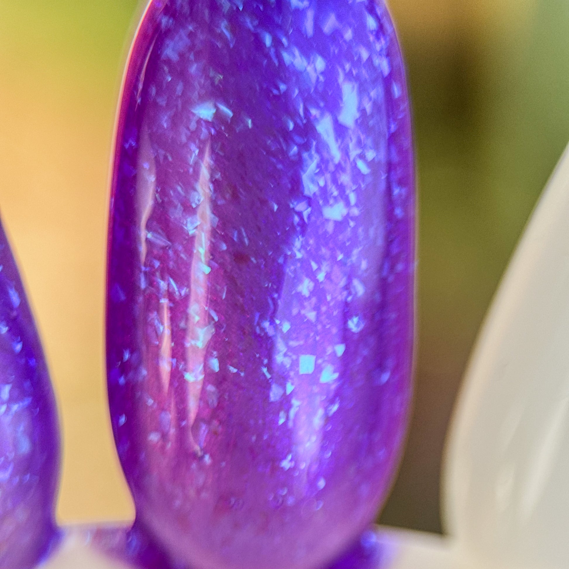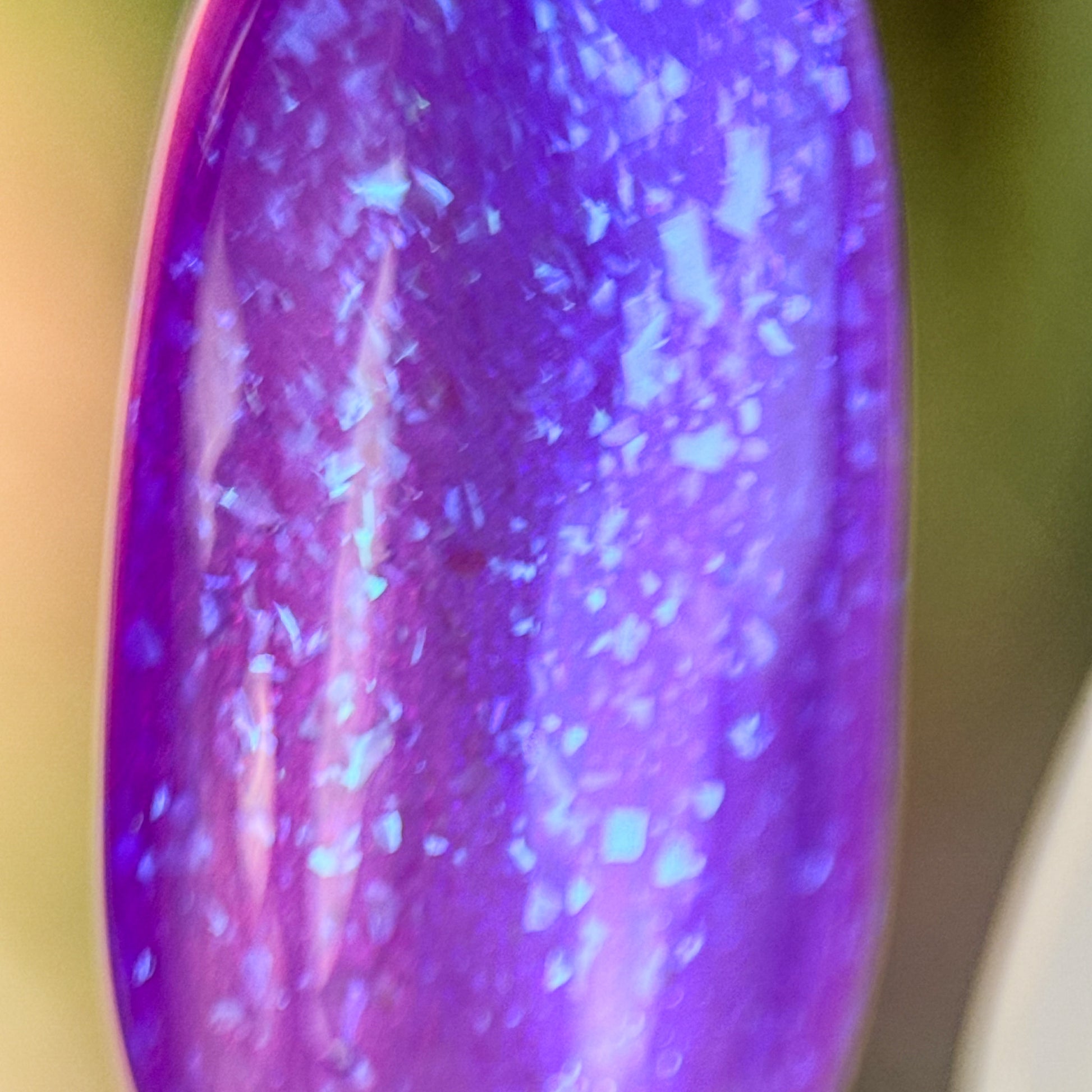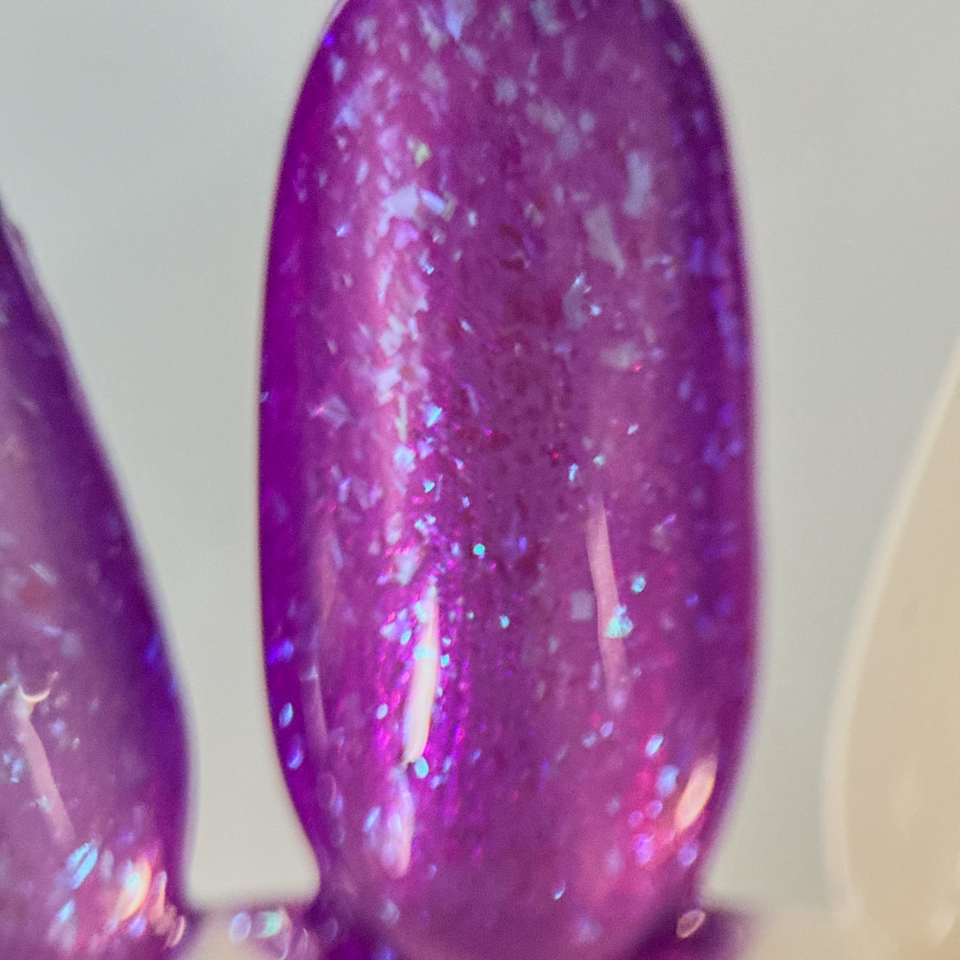 We turned lemons into lemonade, or rather berries! A pigment mishap was transformed into this beautiful purple polish that features a glowing purple shimmer and ethereal blue-purple-green shifting flakes.