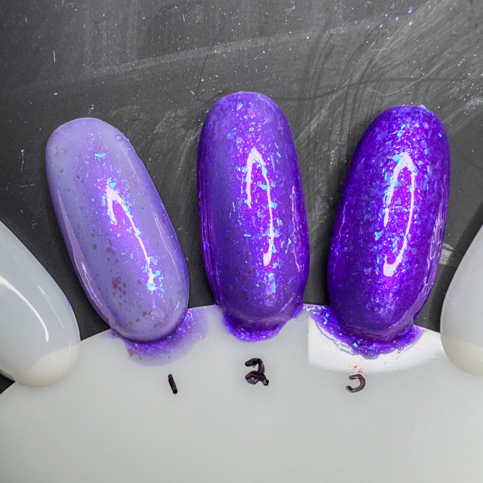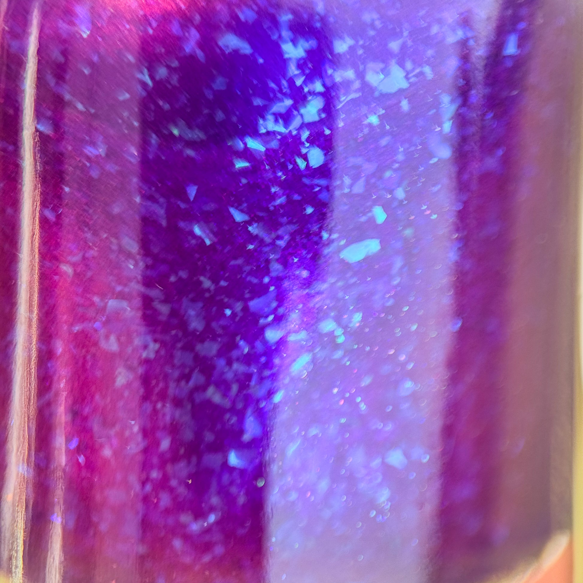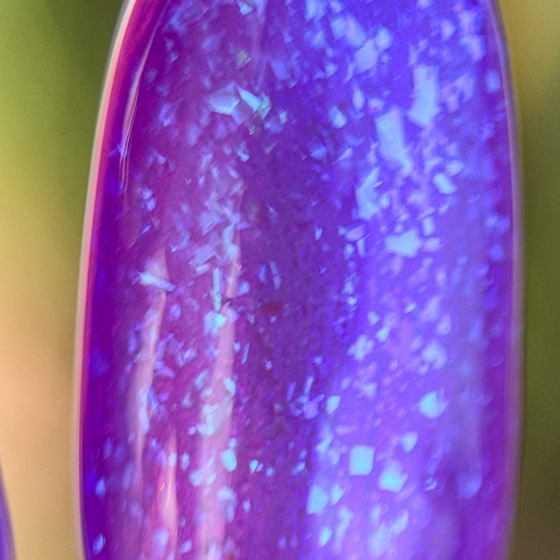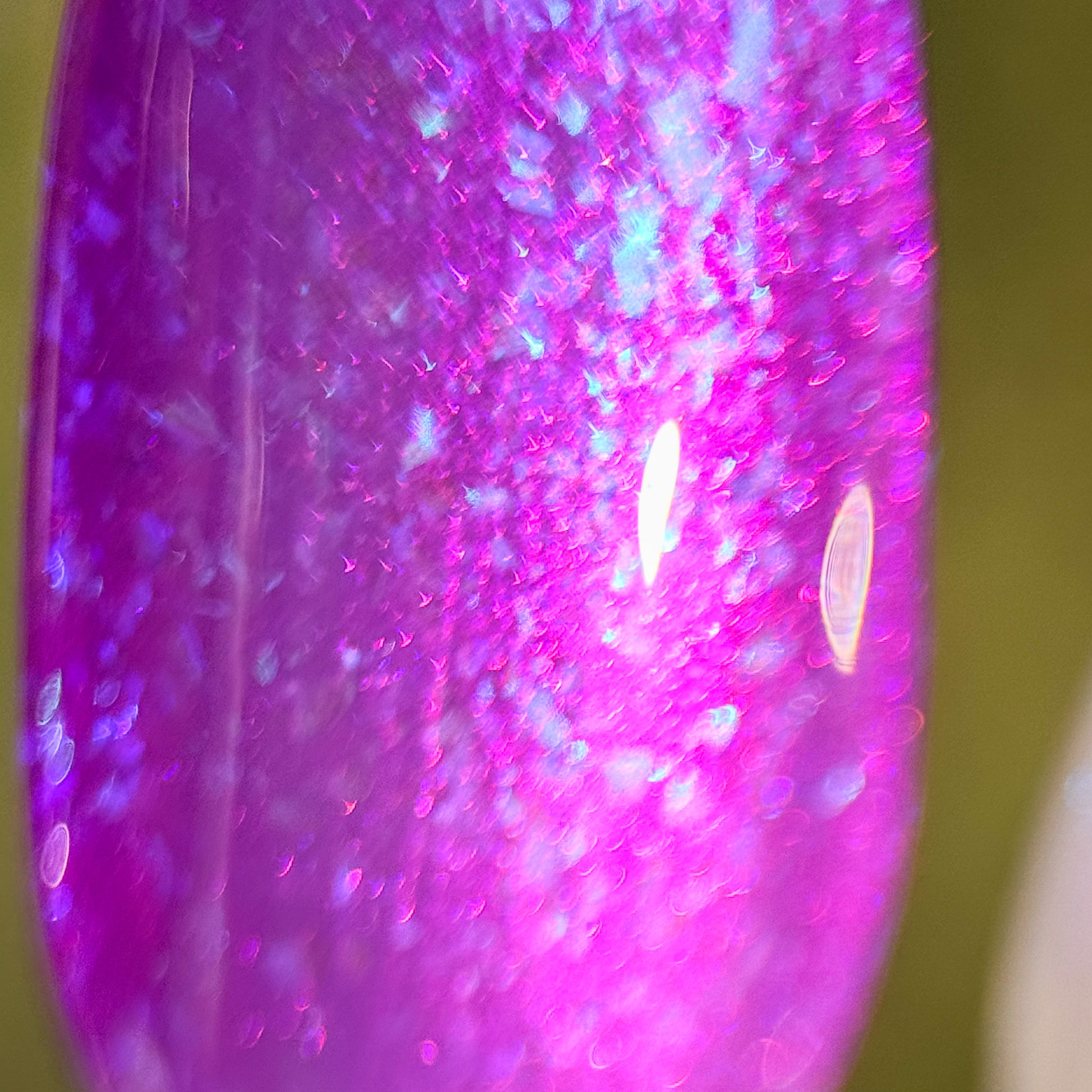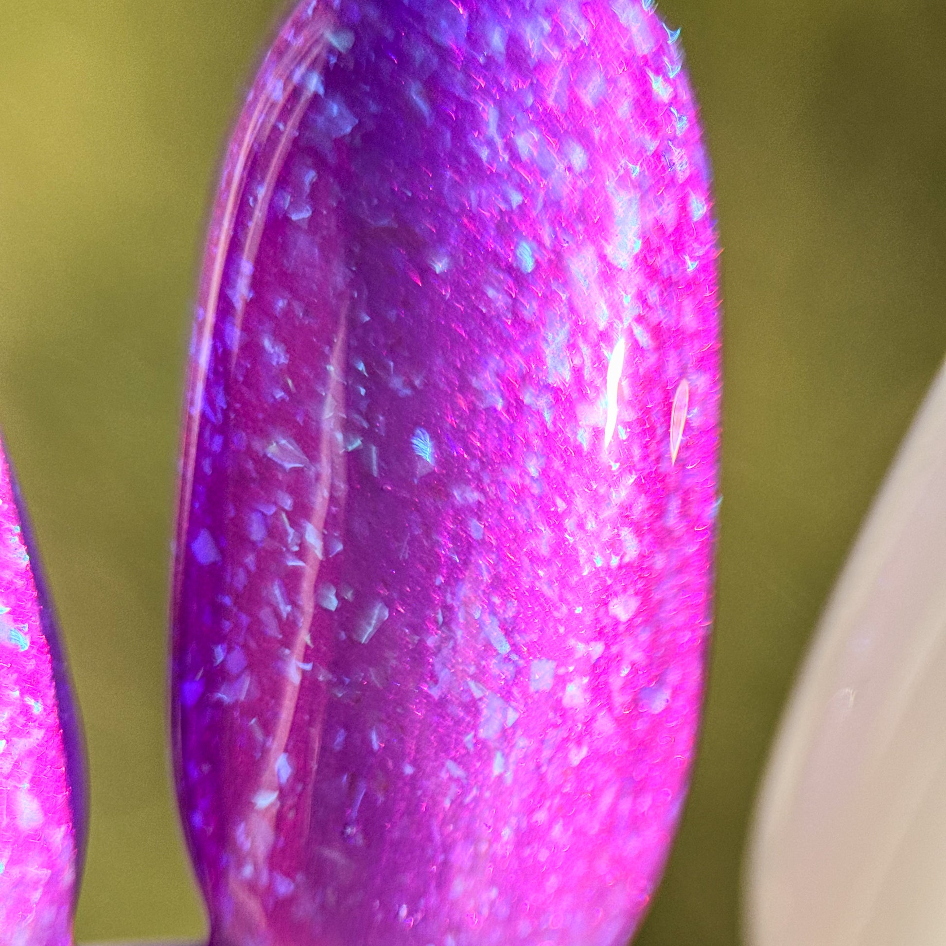 We turned lemons into lemonade, or rather berries! A pigment mishap was transformed into this beautiful purple polish that features a glowing purple shimmer and ethereal blue-purple-green shifting flakes.