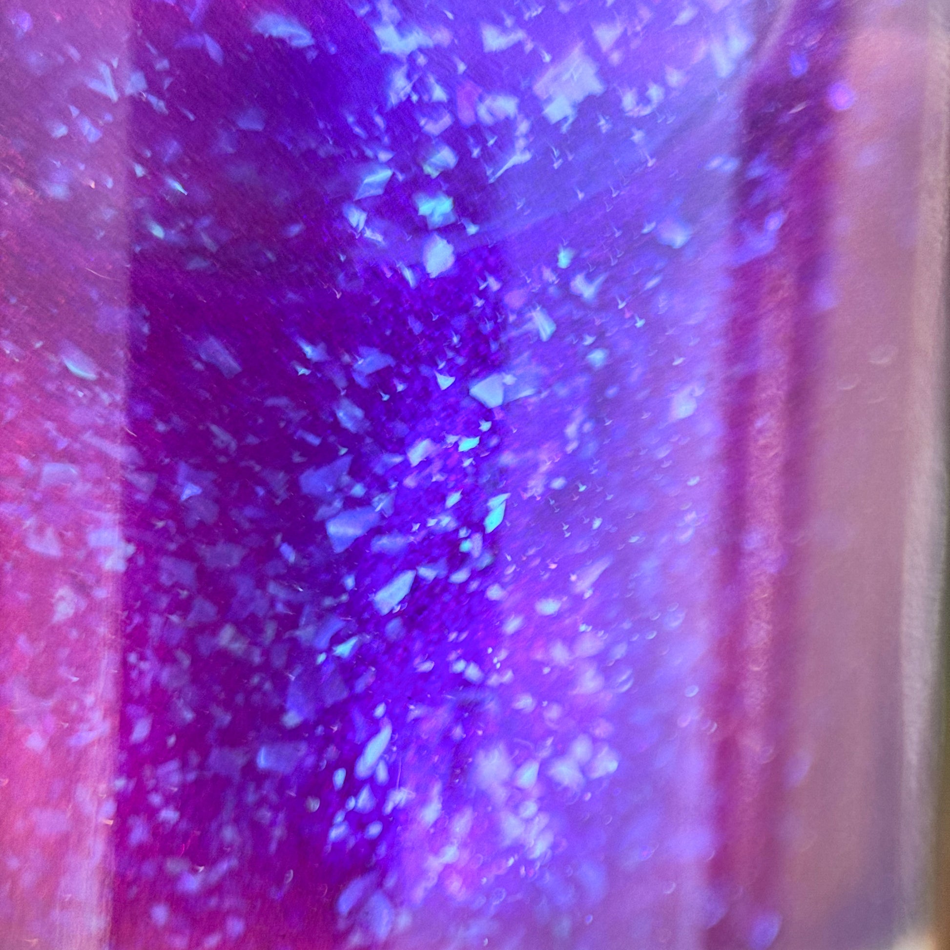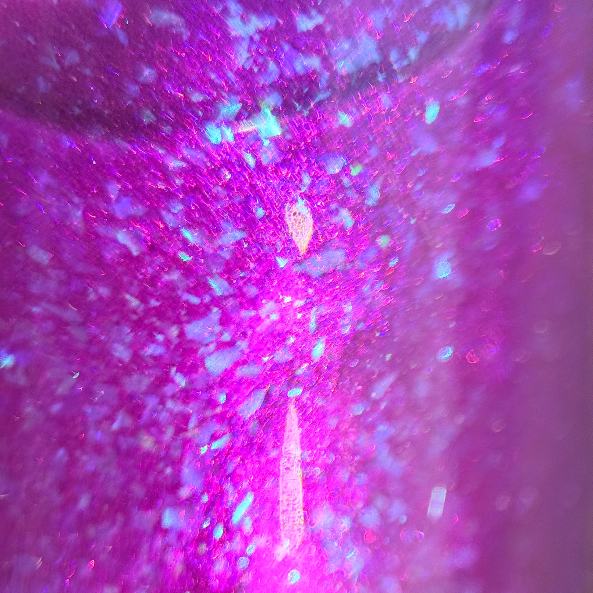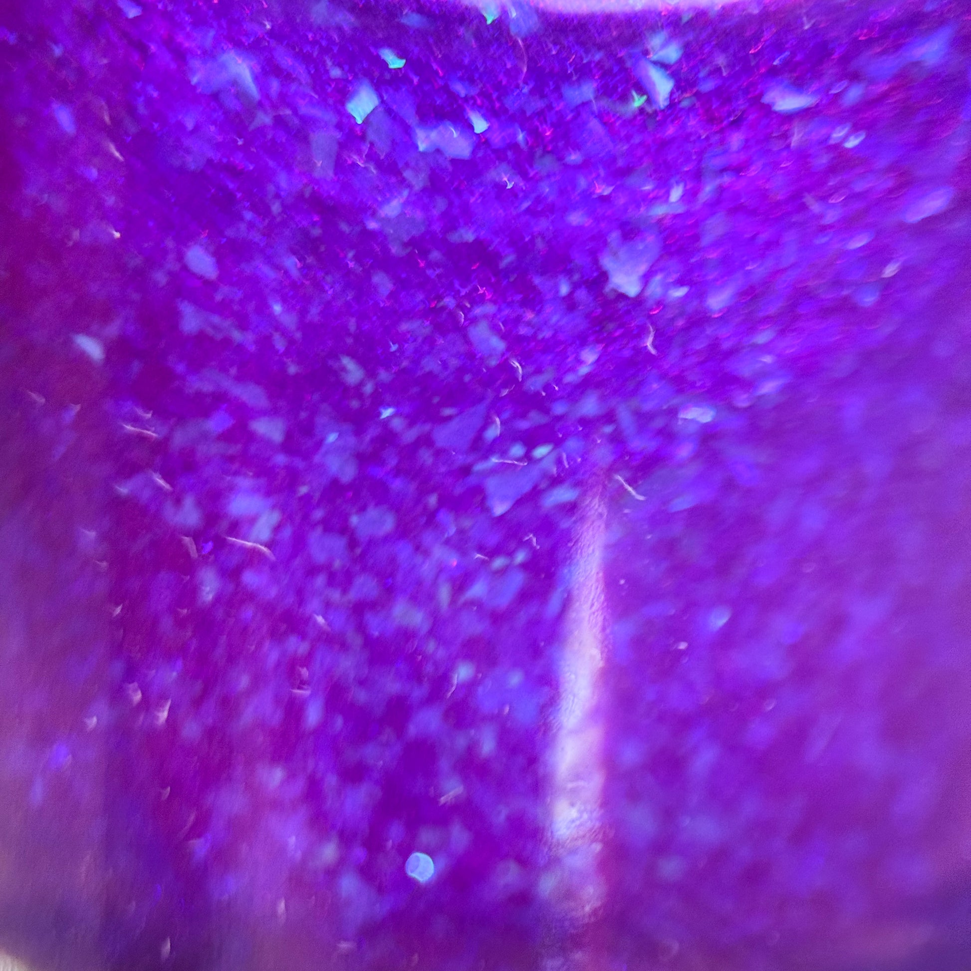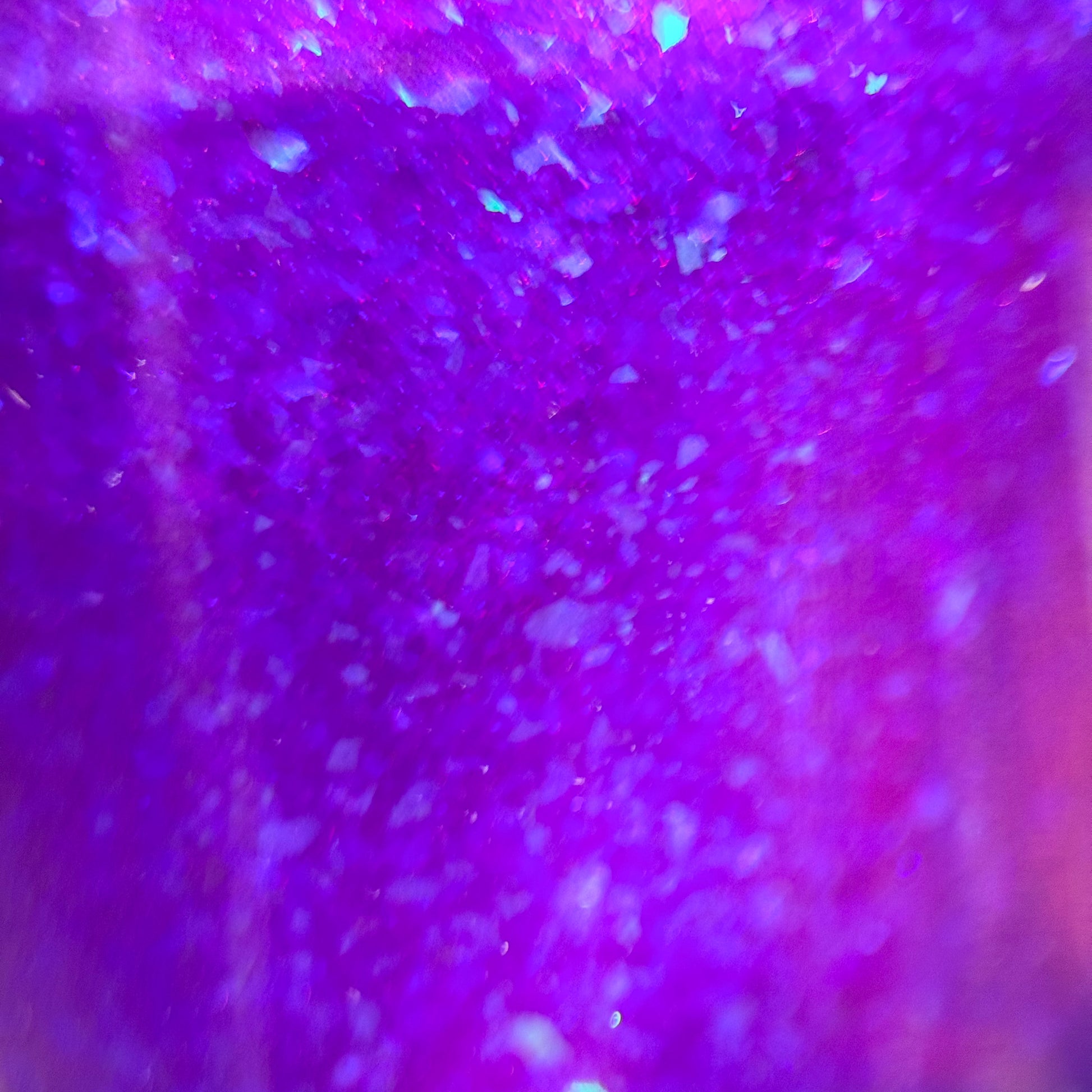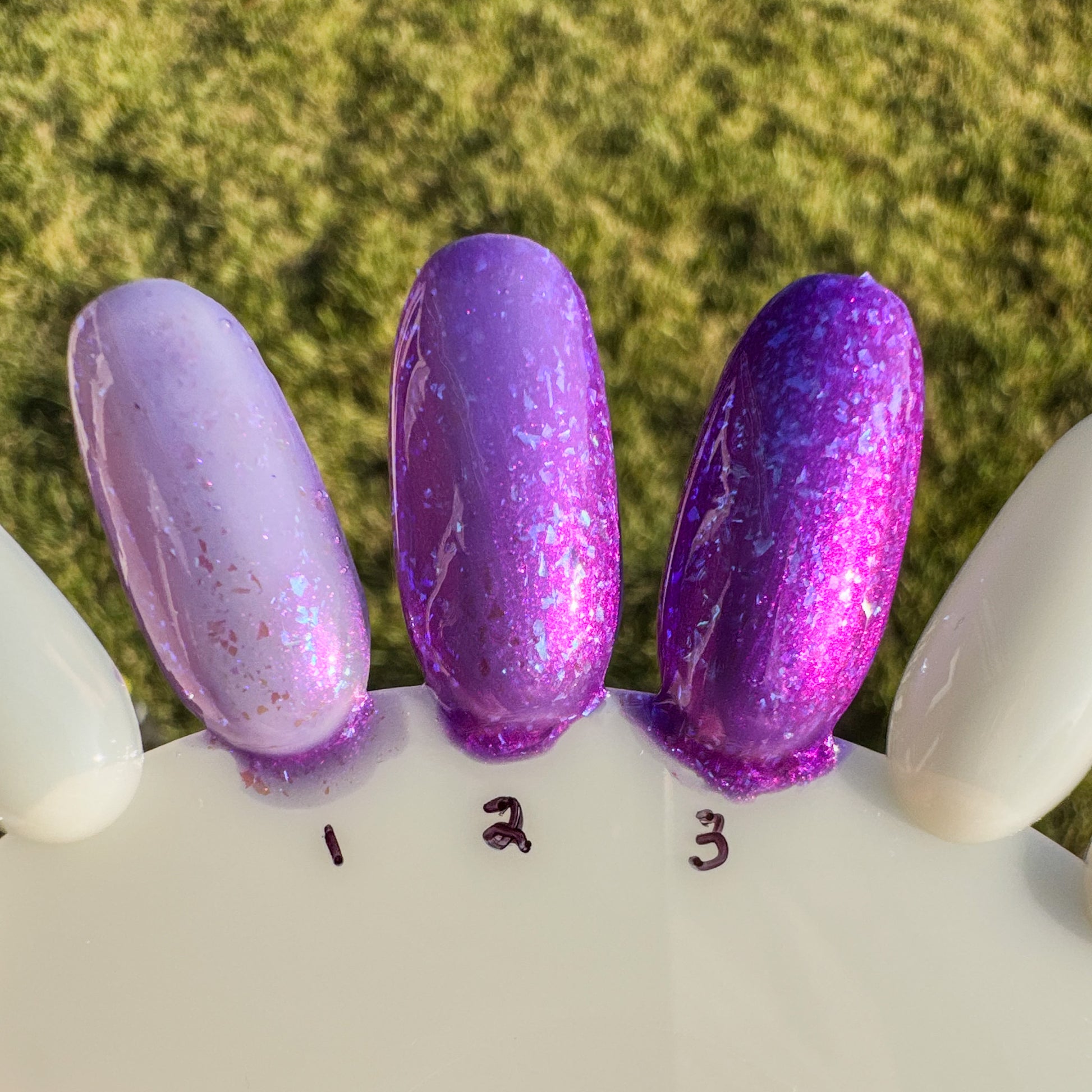 We turned lemons into lemonade, or rather berries! A pigment mishap was transformed into this beautiful purple polish that features a glowing purple shimmer and ethereal blue-purple-green shifting flakes.