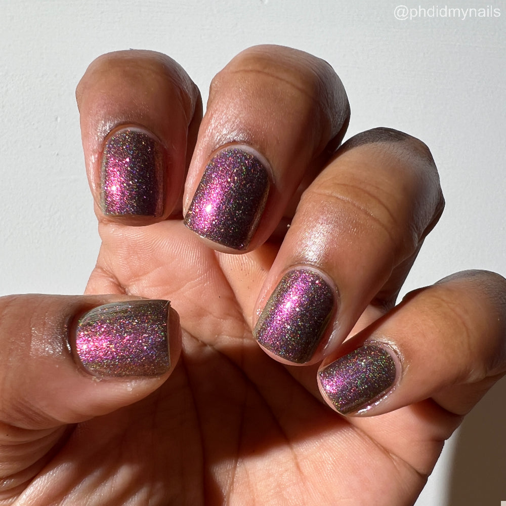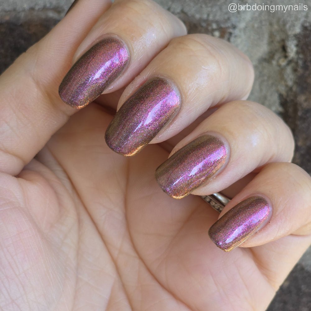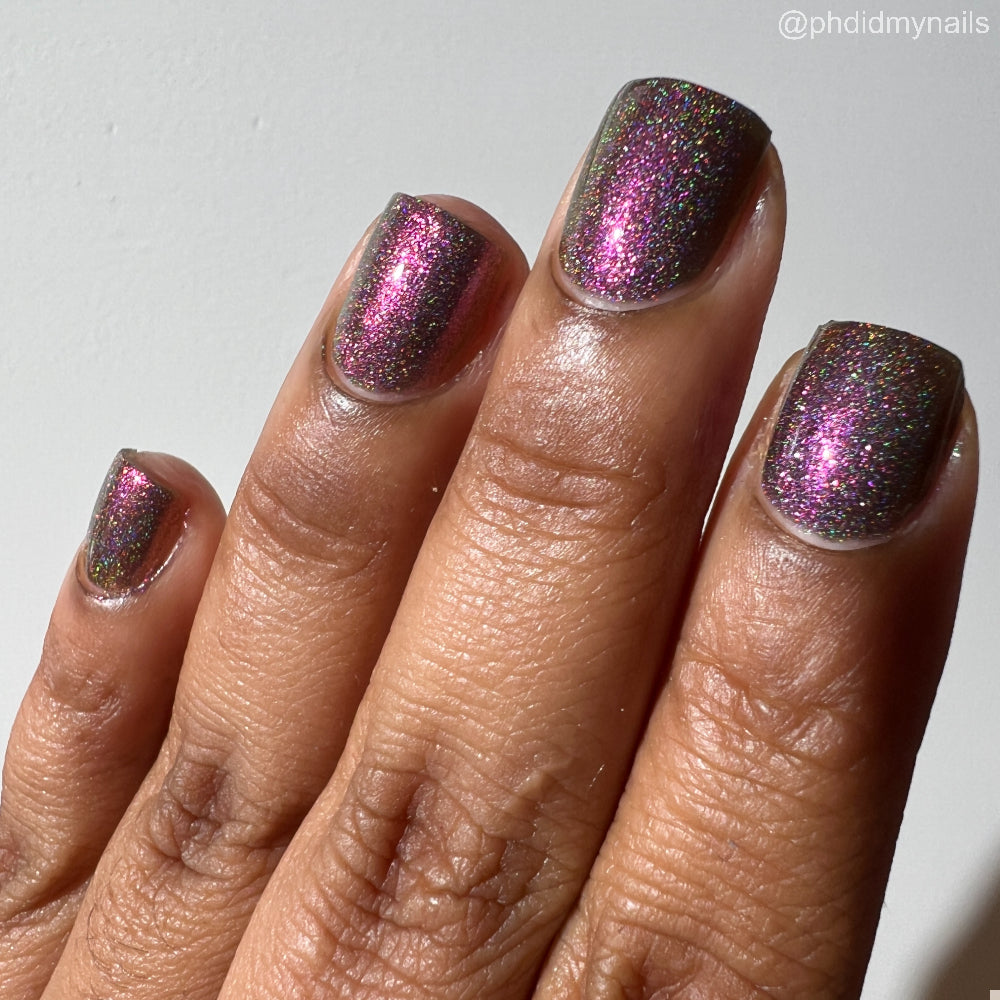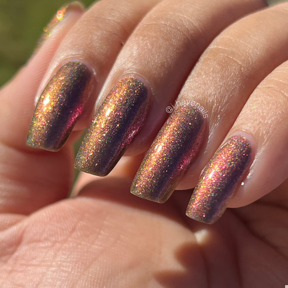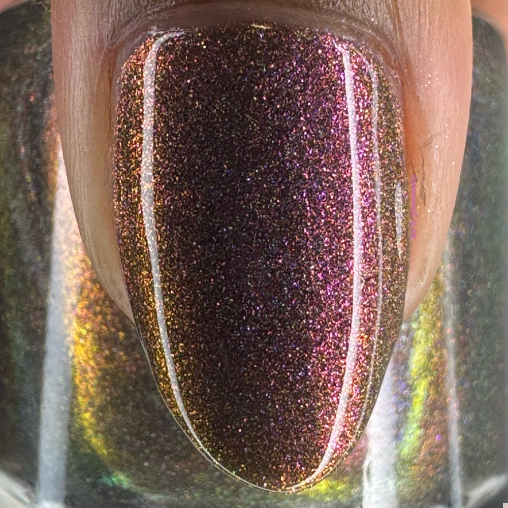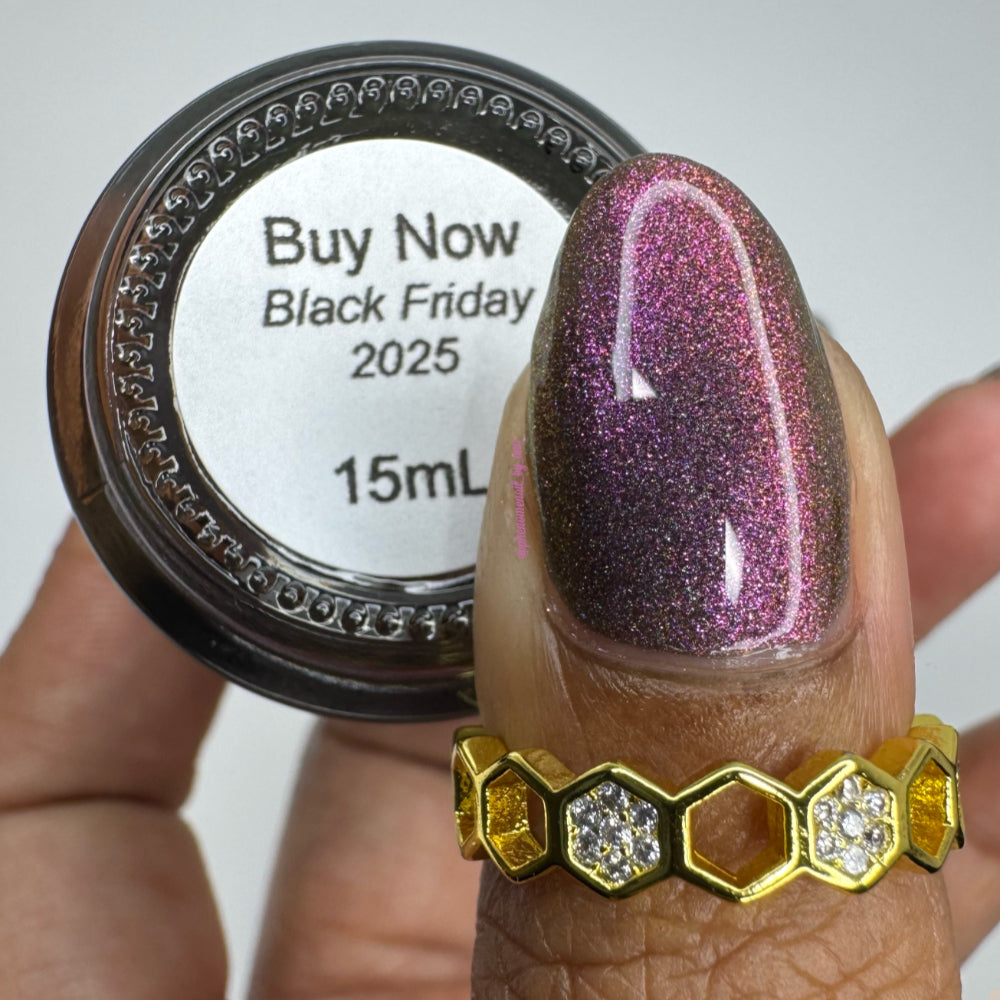 Buy Now is a black-based linear holographic polish with a violet-green-gold shift. The initial “Ooooh and ahhhh” that draws you in.