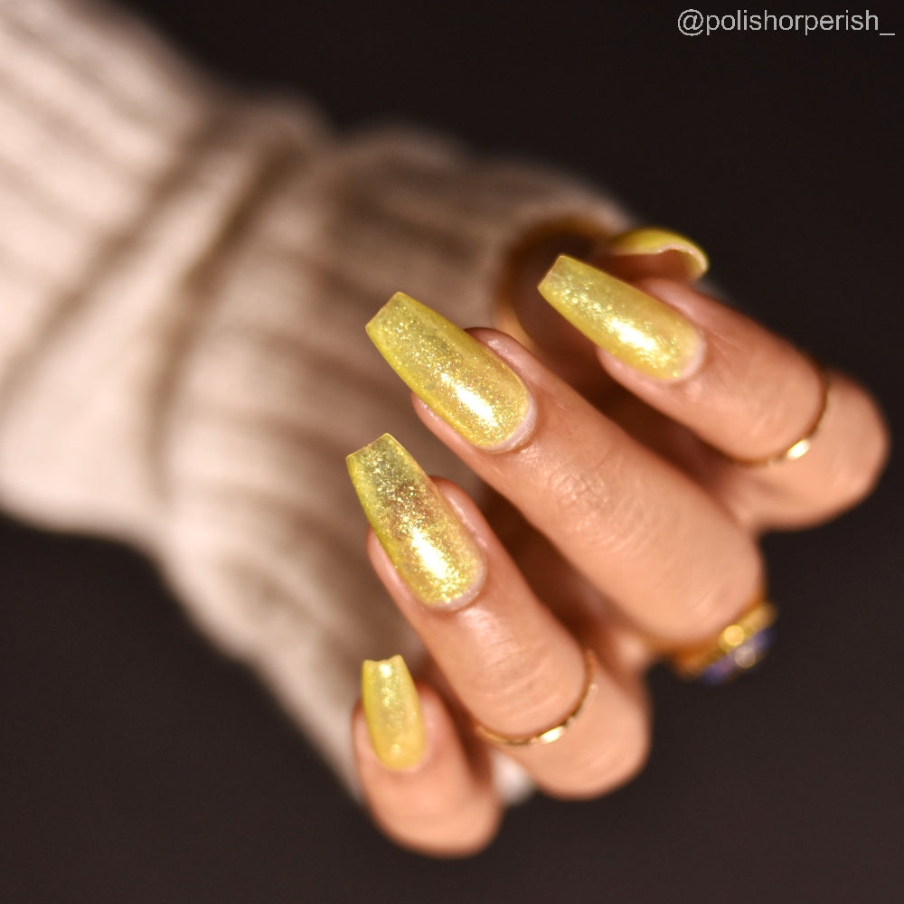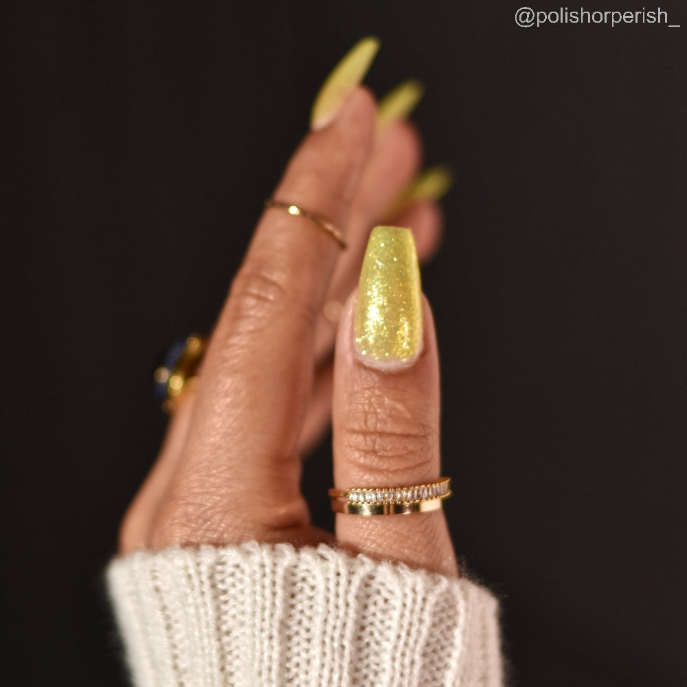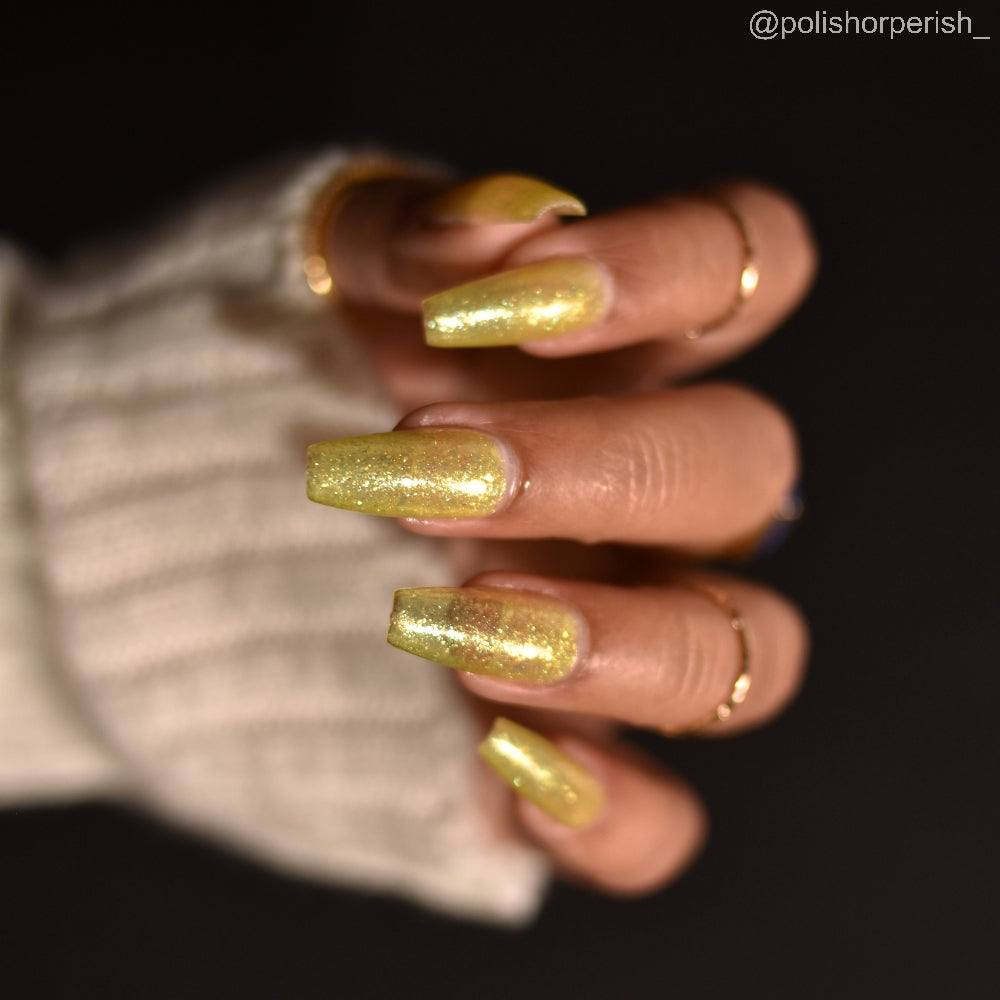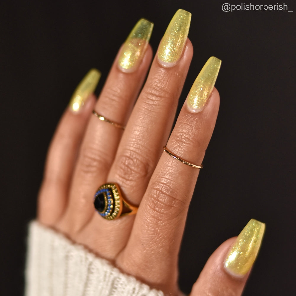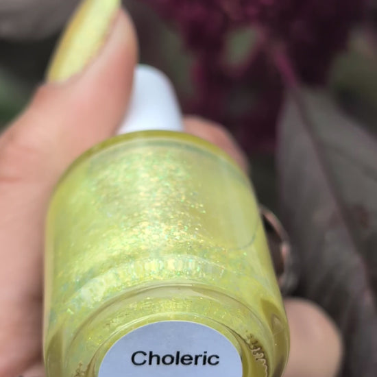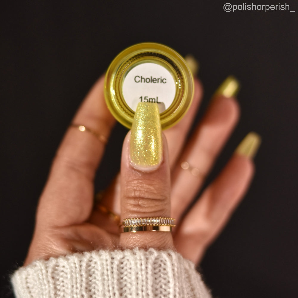 Choleric has a bright yellow jelly base with shimmering gold flakes, iridescent green shimmer, and small sized green-gold iridescent glitter.