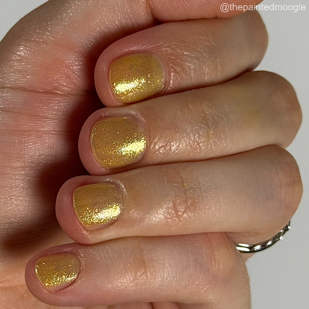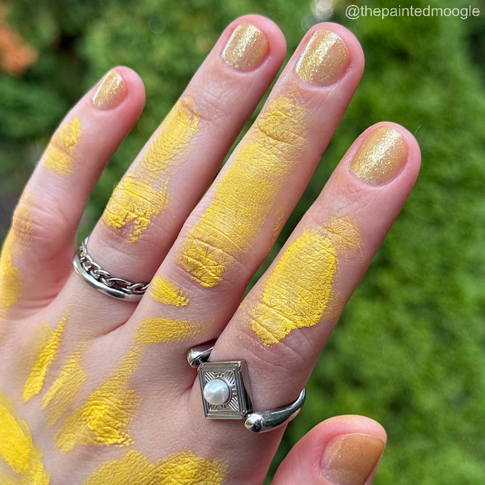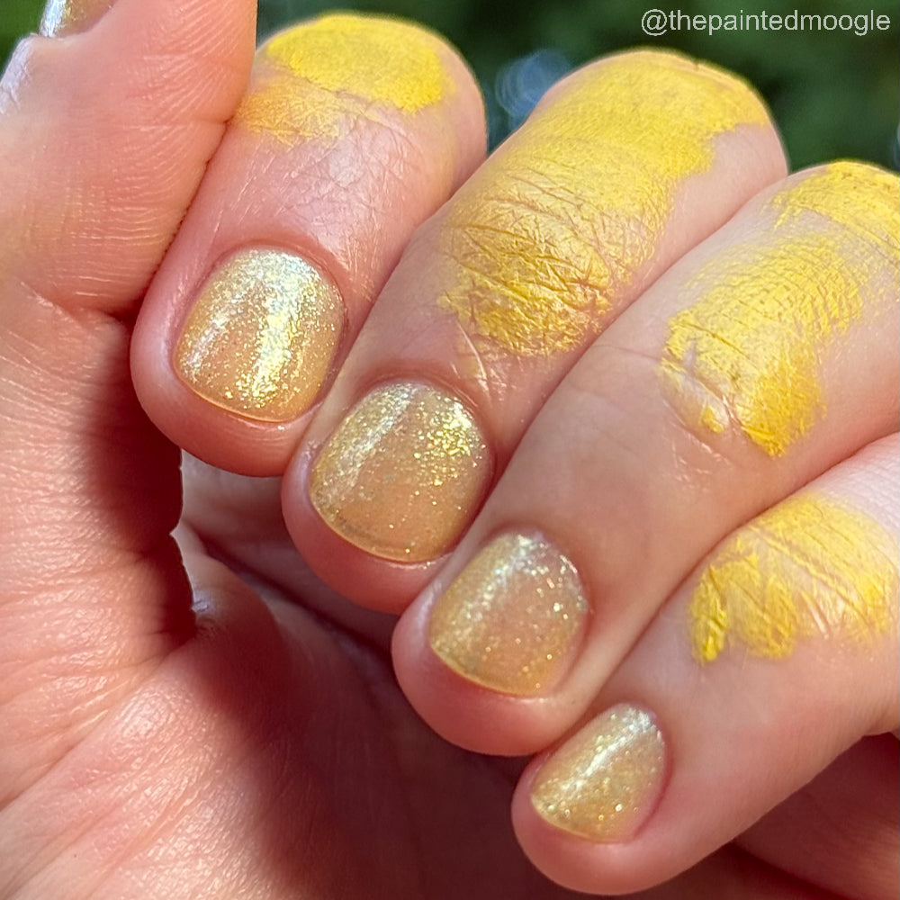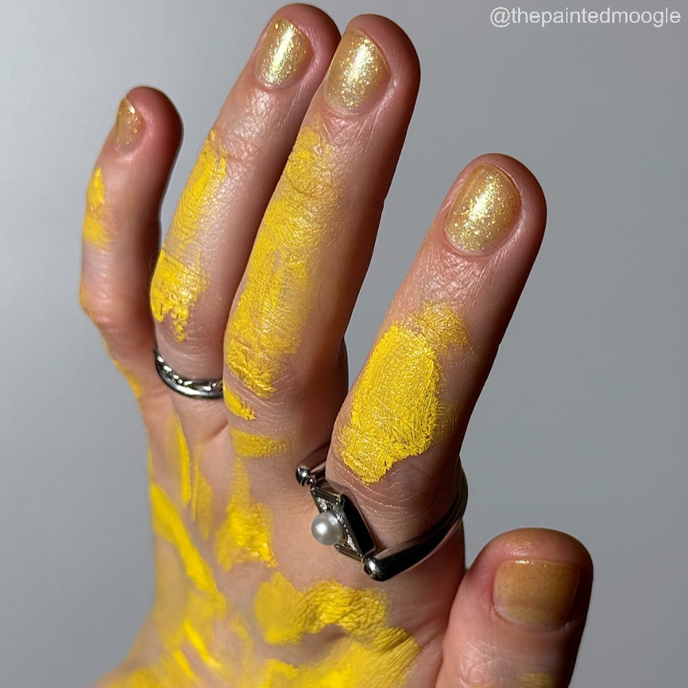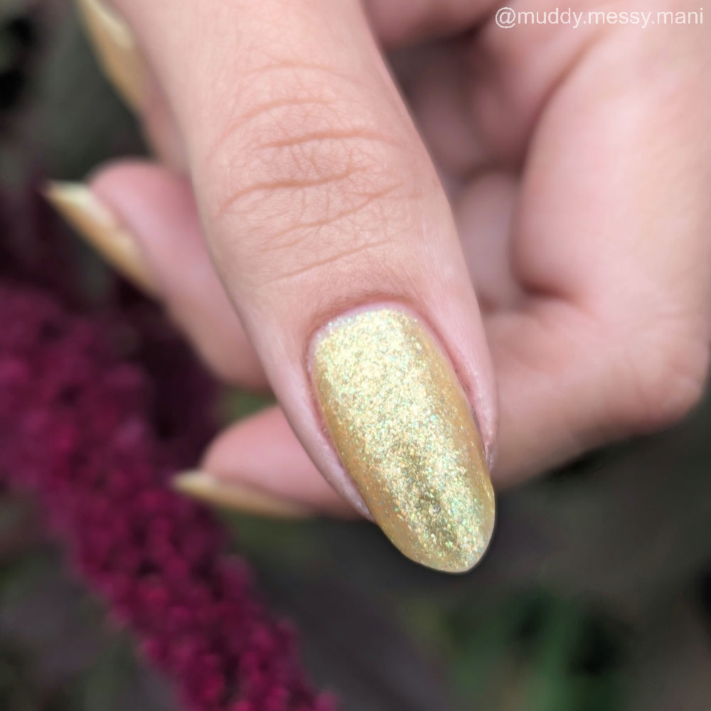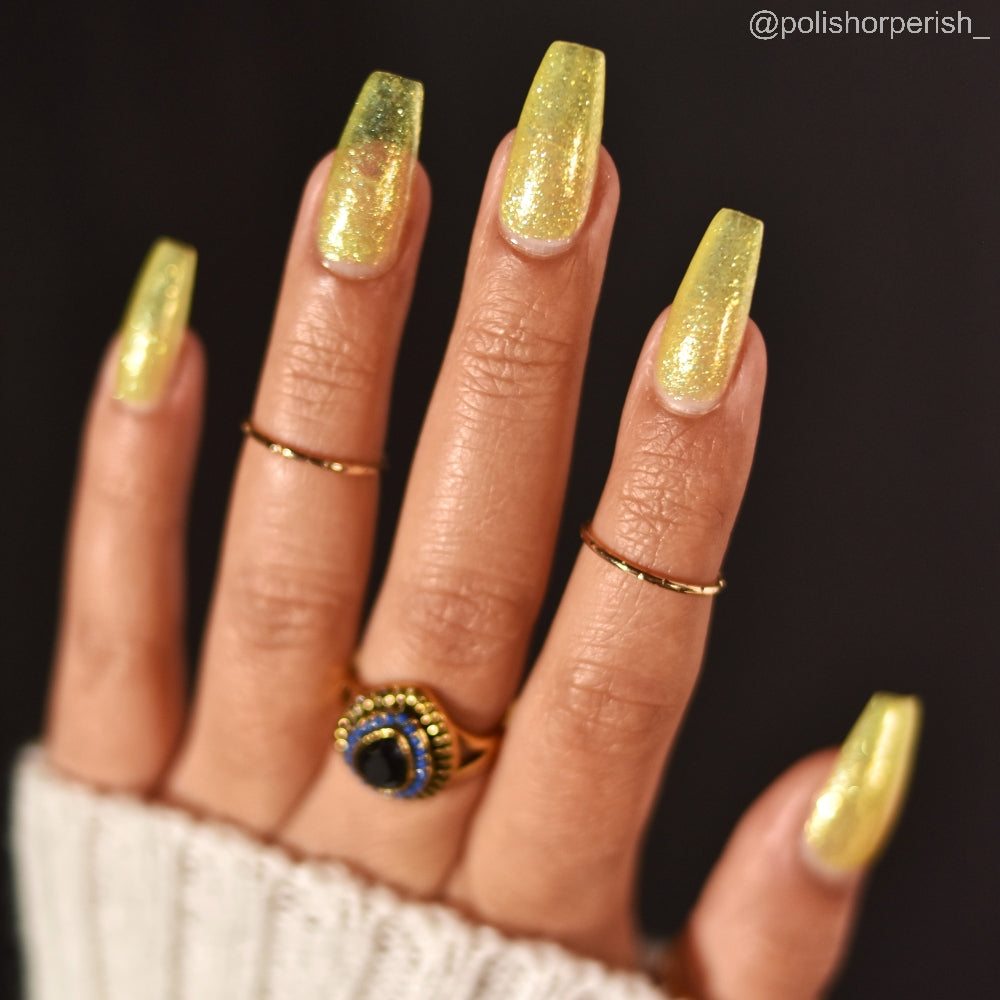 Choleric has a bright yellow jelly base with shimmering gold flakes, iridescent green shimmer, and small sized green-gold iridescent glitter.