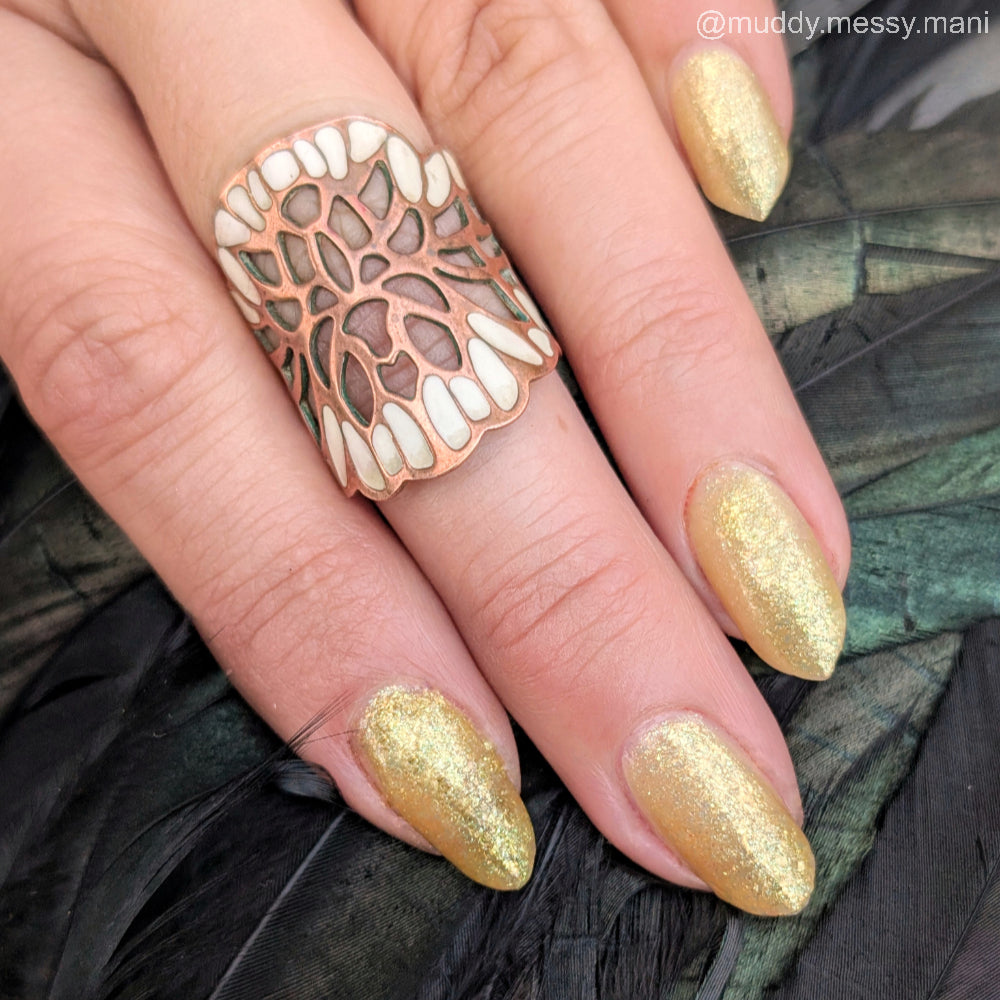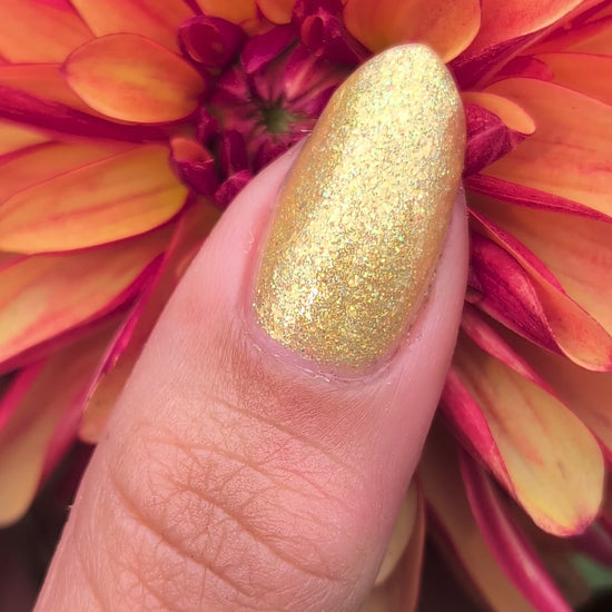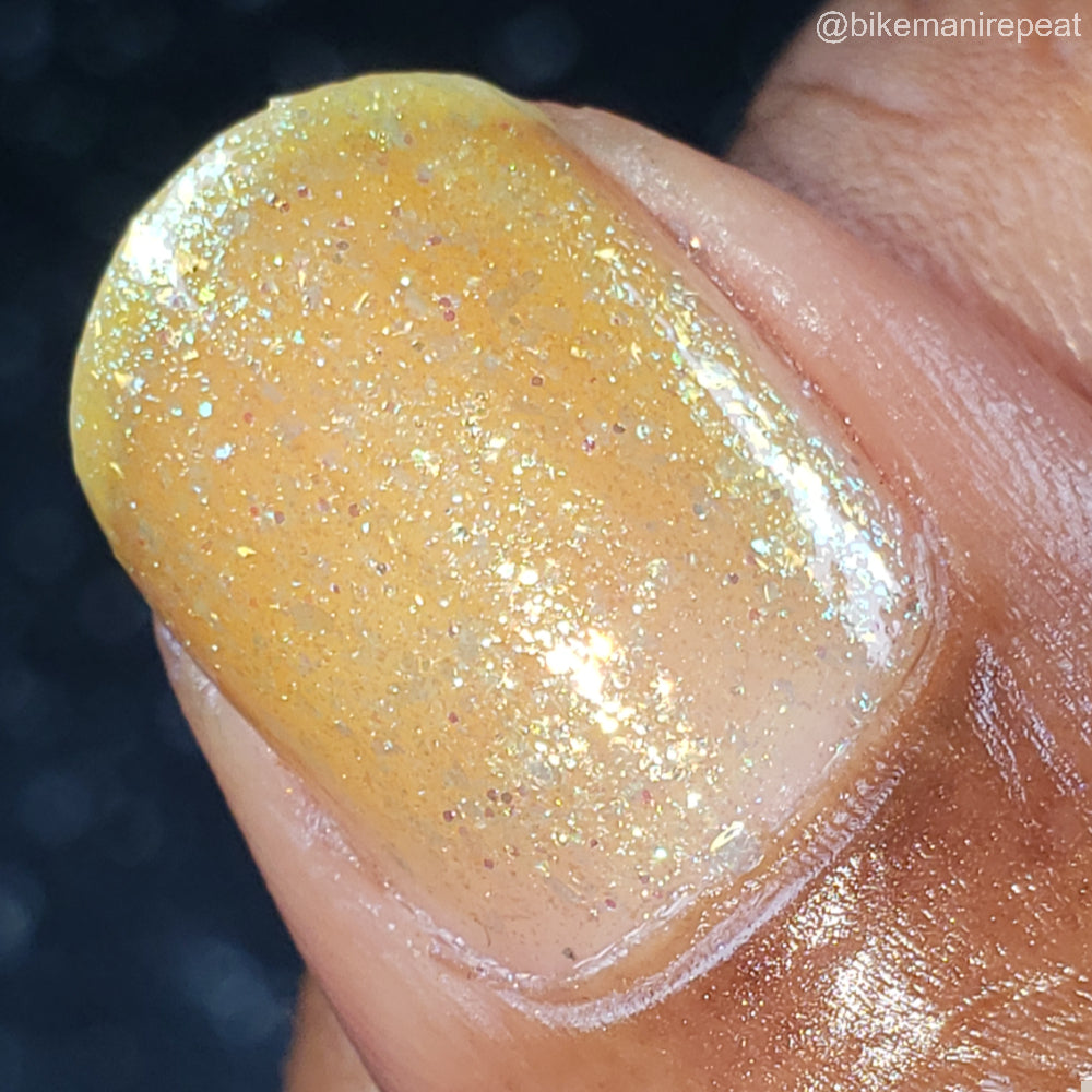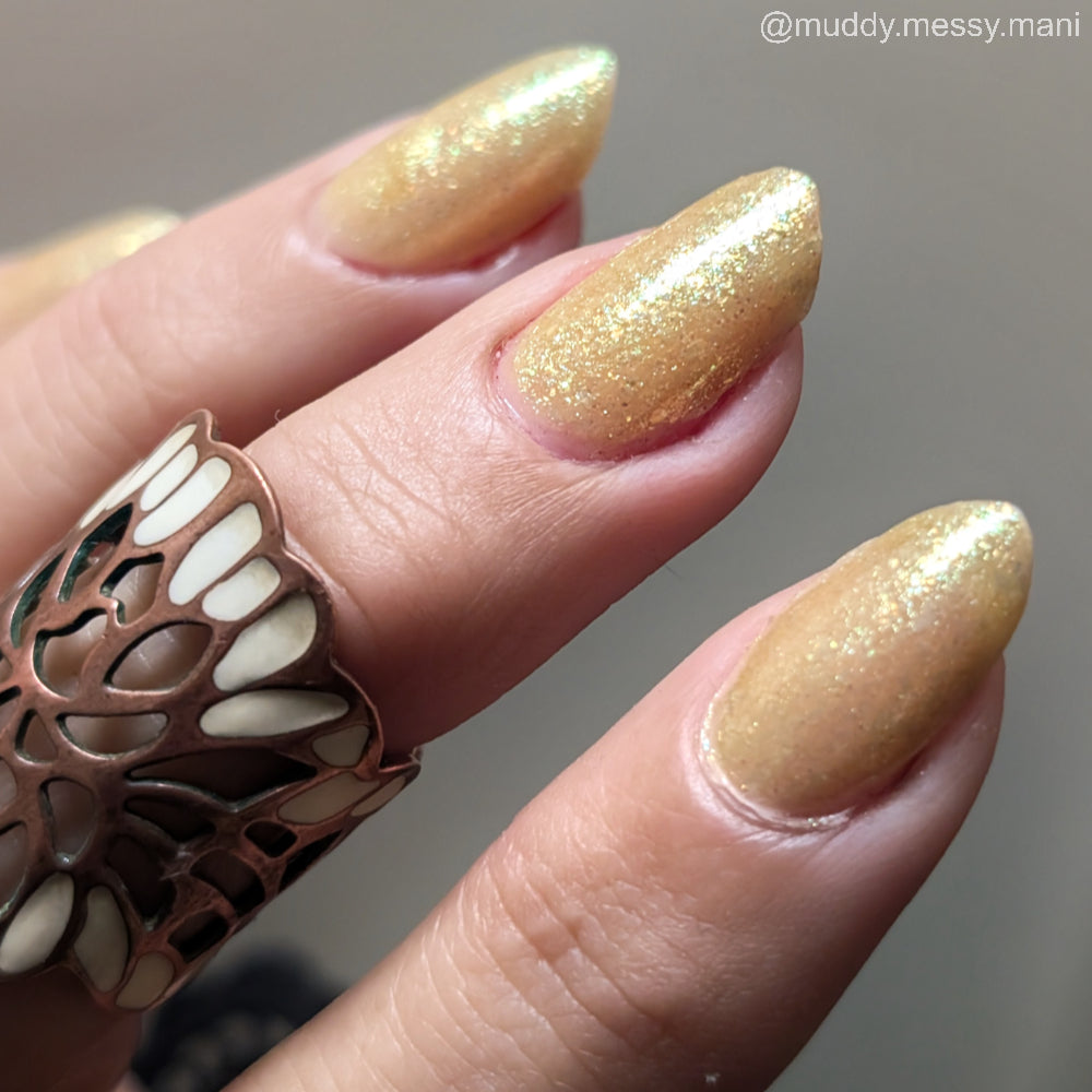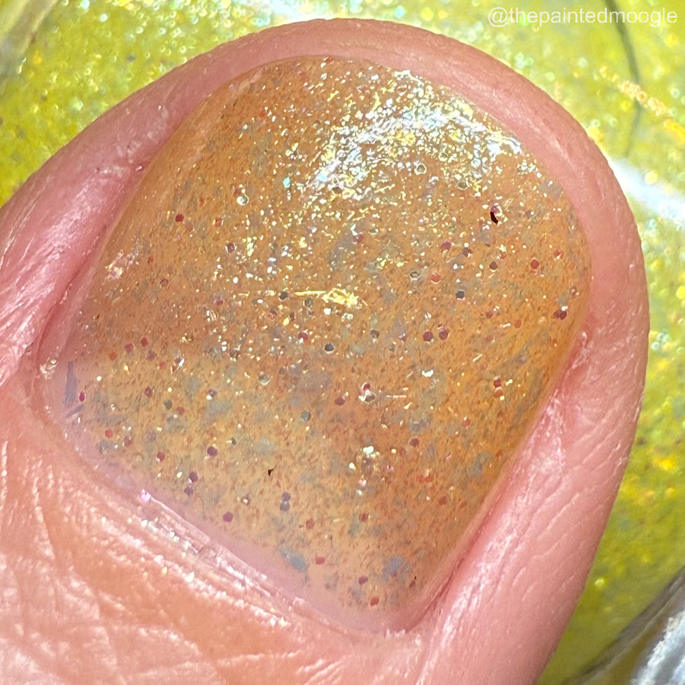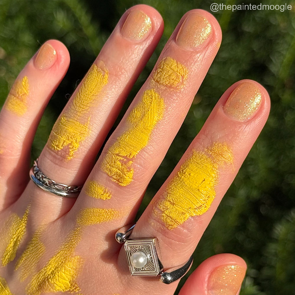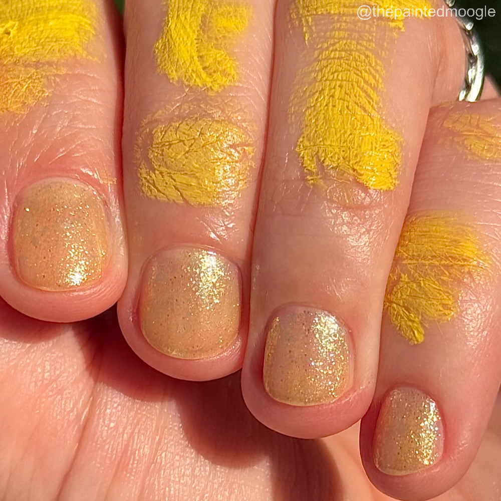 Choleric has a bright yellow jelly base with shimmering gold flakes, iridescent green shimmer, and small sized green-gold iridescent glitter.