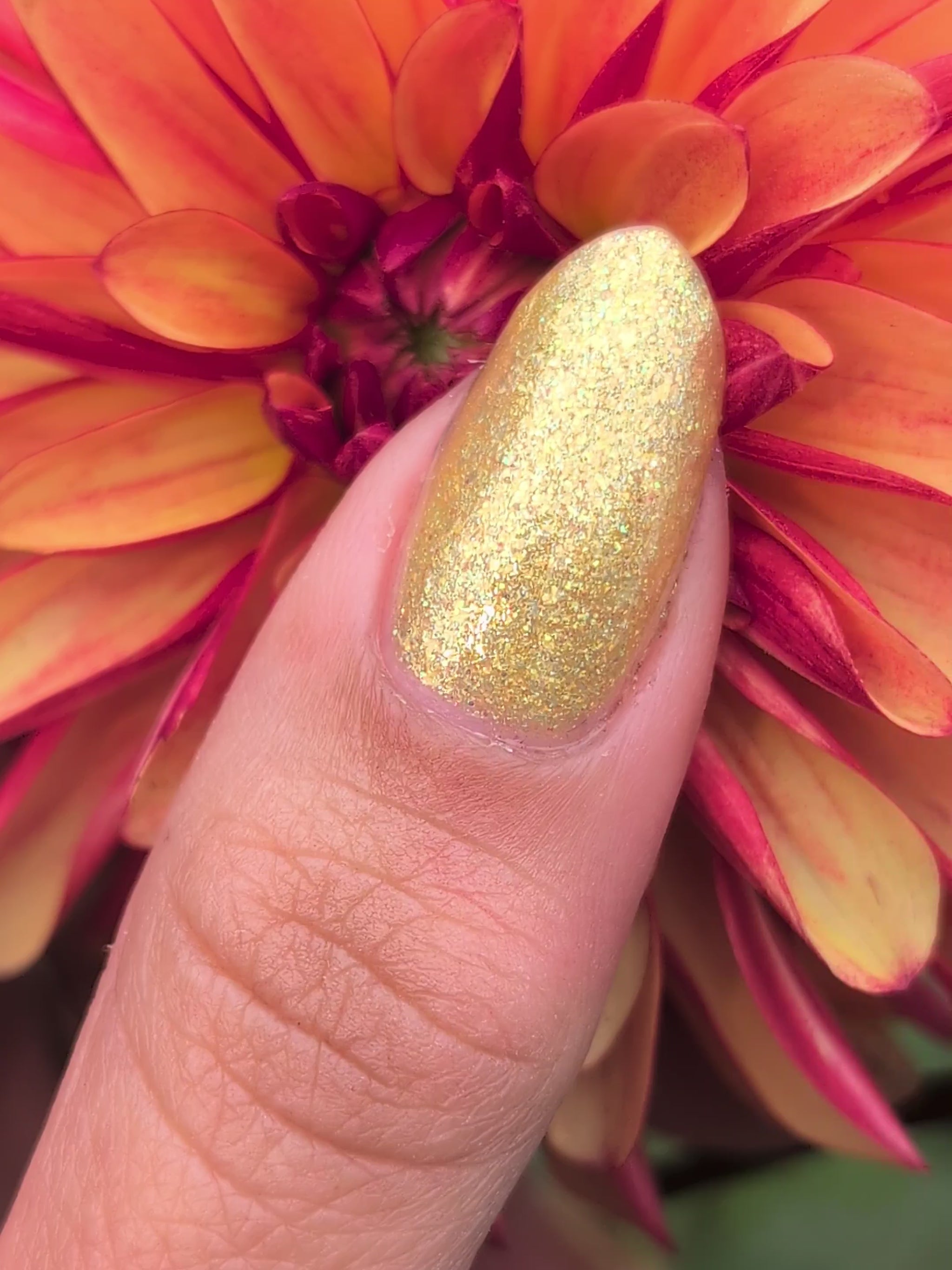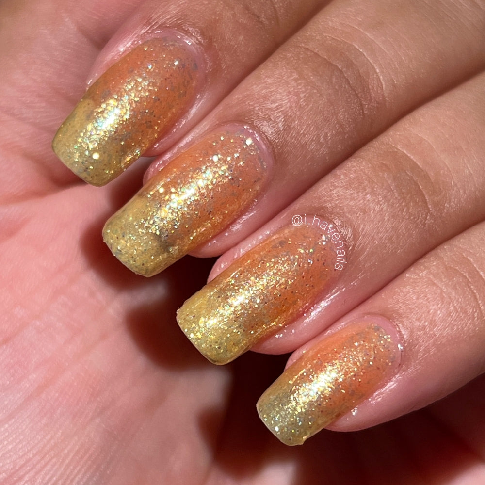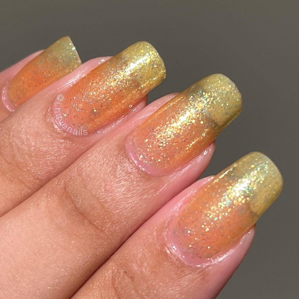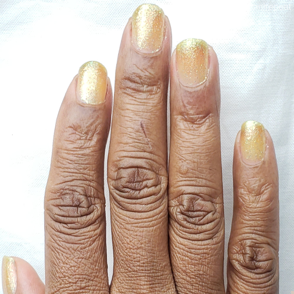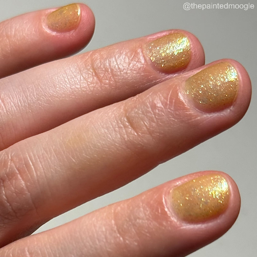 Choleric has a bright yellow jelly base with shimmering gold flakes, iridescent green shimmer, and small sized green-gold iridescent glitter.