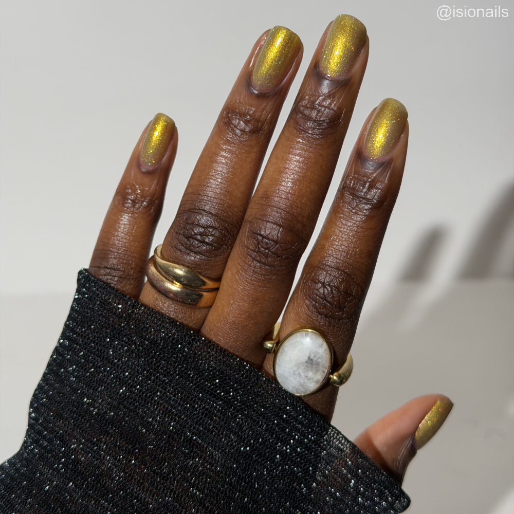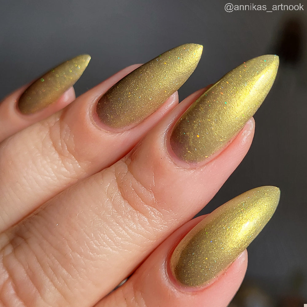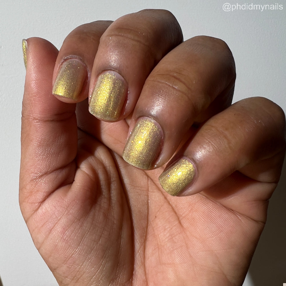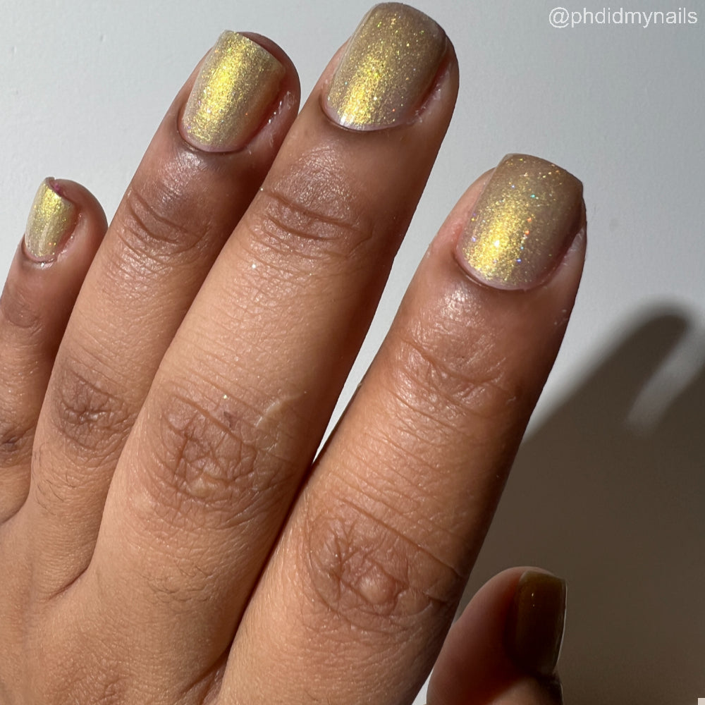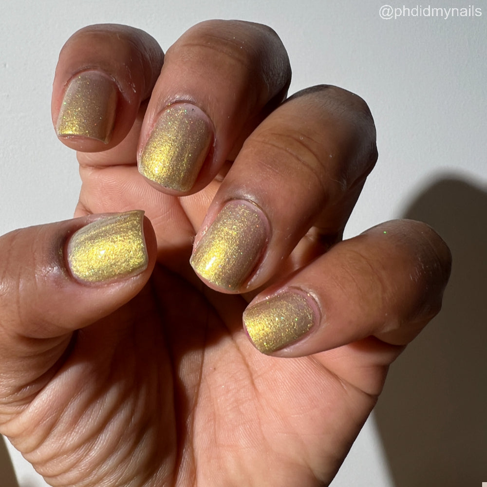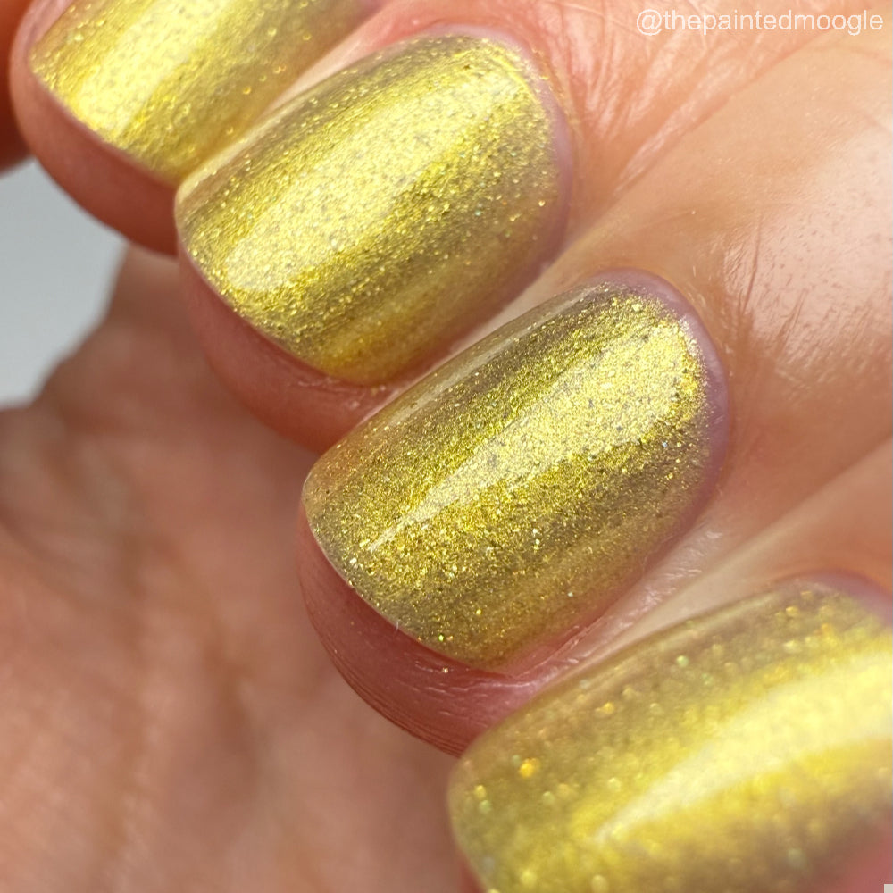 Dynasties is a light gold shimmering polish with scattering gold holographic glitter and golden micro flakes.