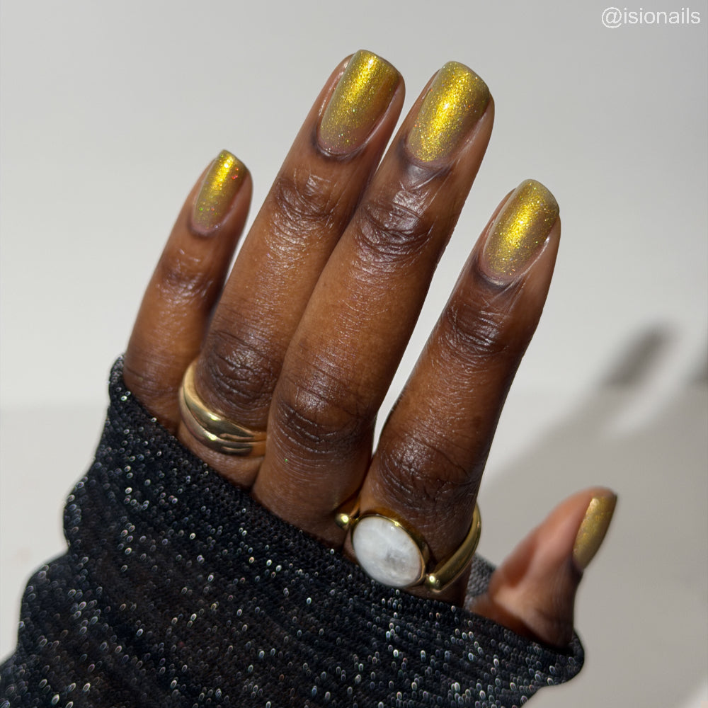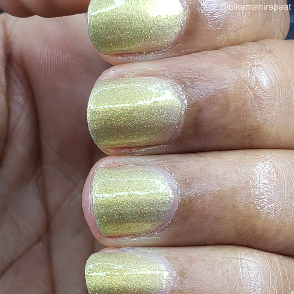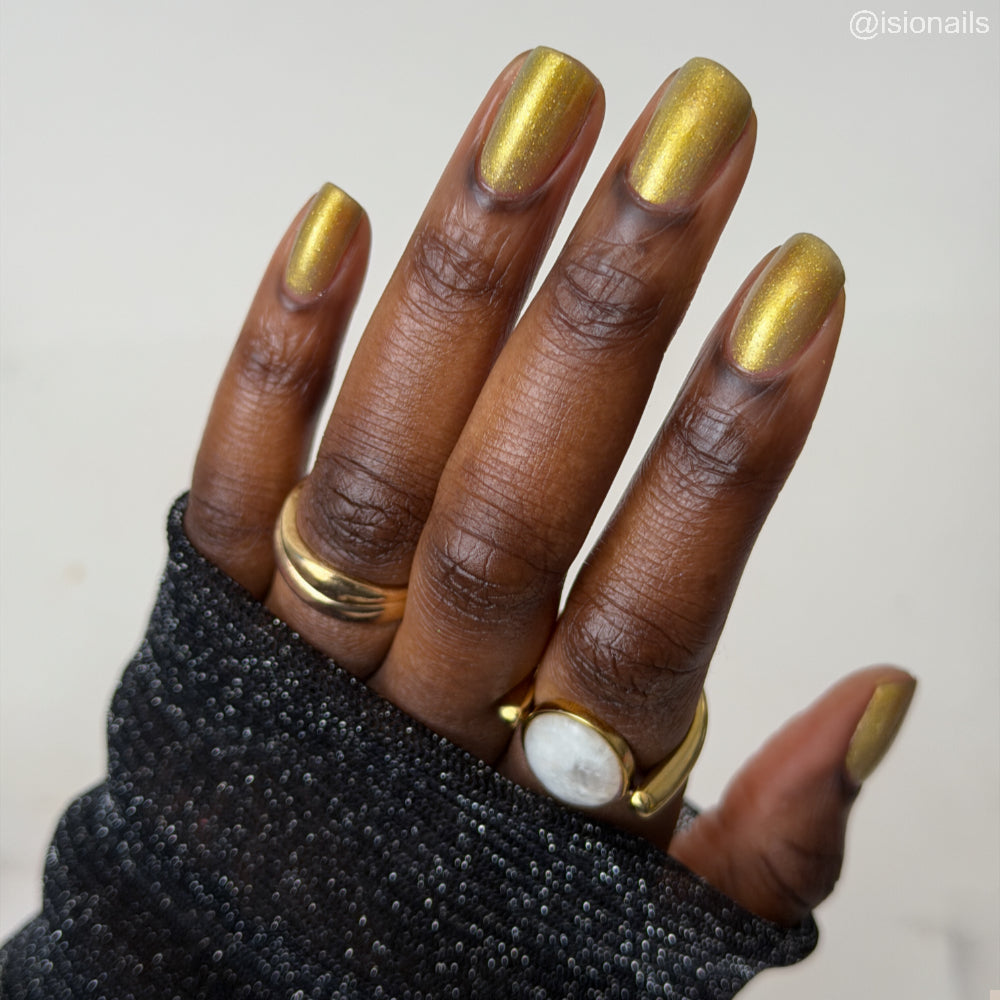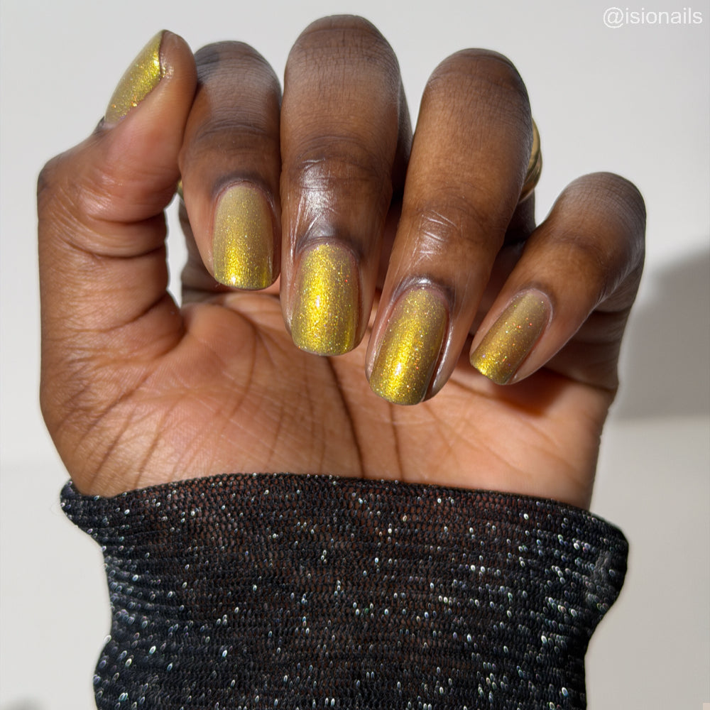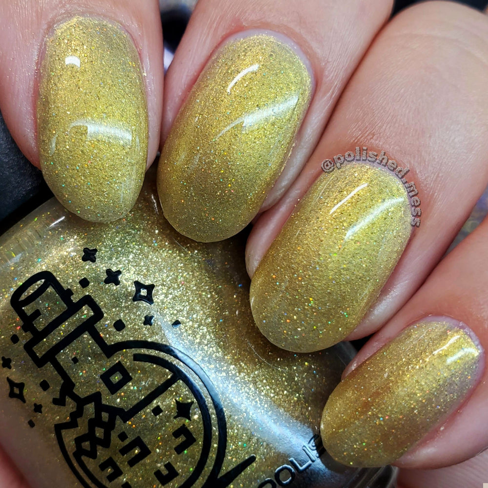 Dynasties is a light gold shimmering polish with scattering gold holographic glitter and golden micro flakes.