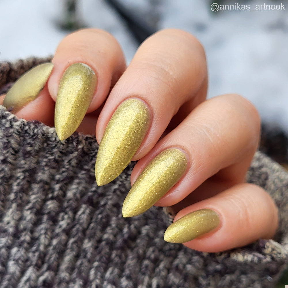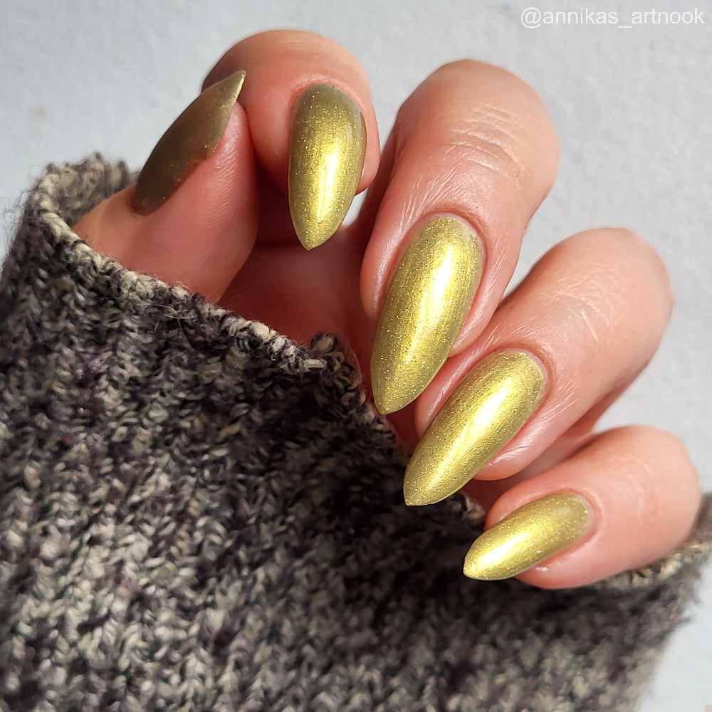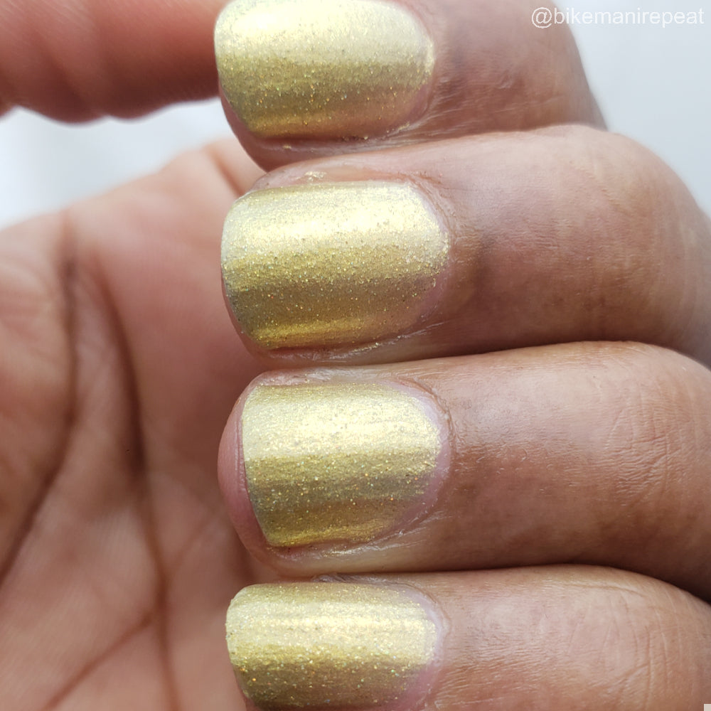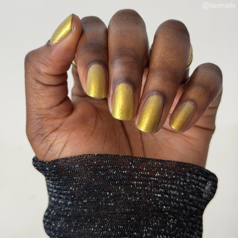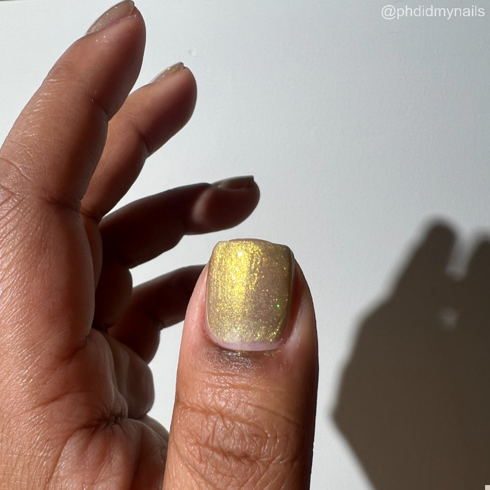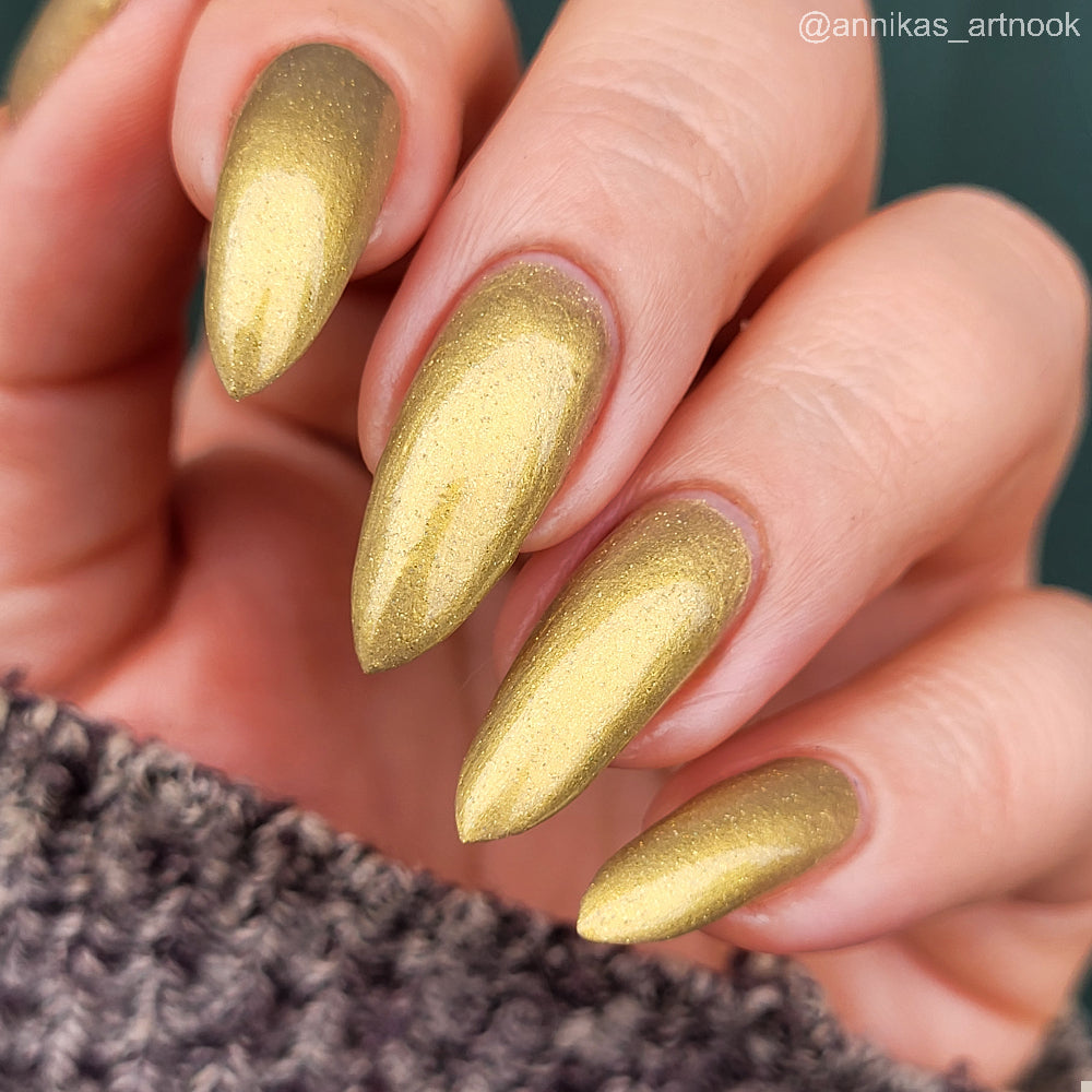 Dynasties is a light gold shimmering polish with scattering gold holographic glitter and golden micro flakes.