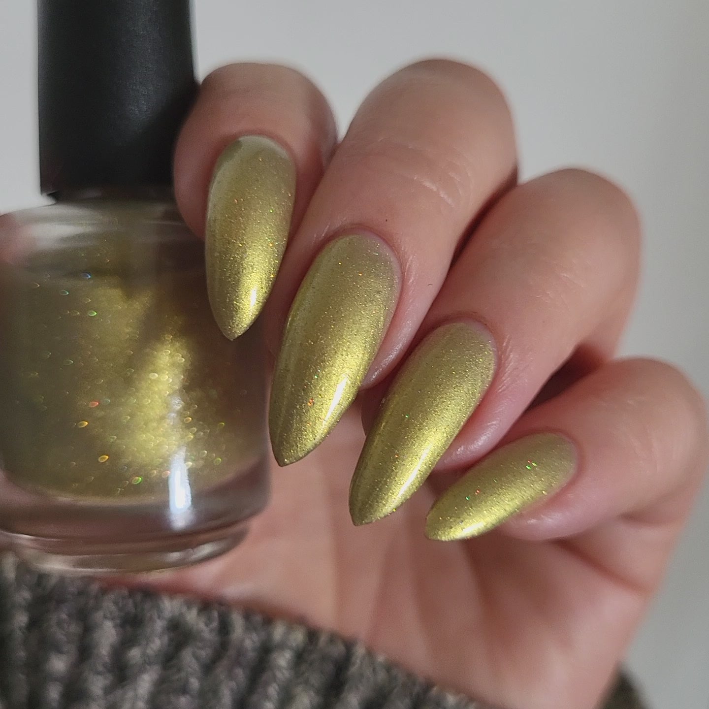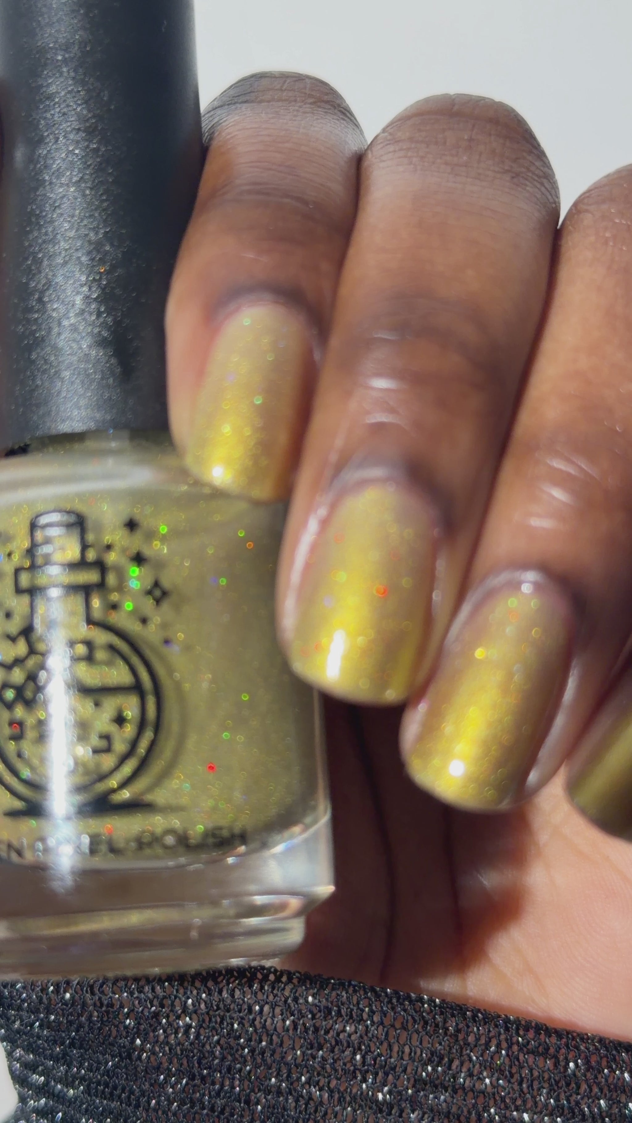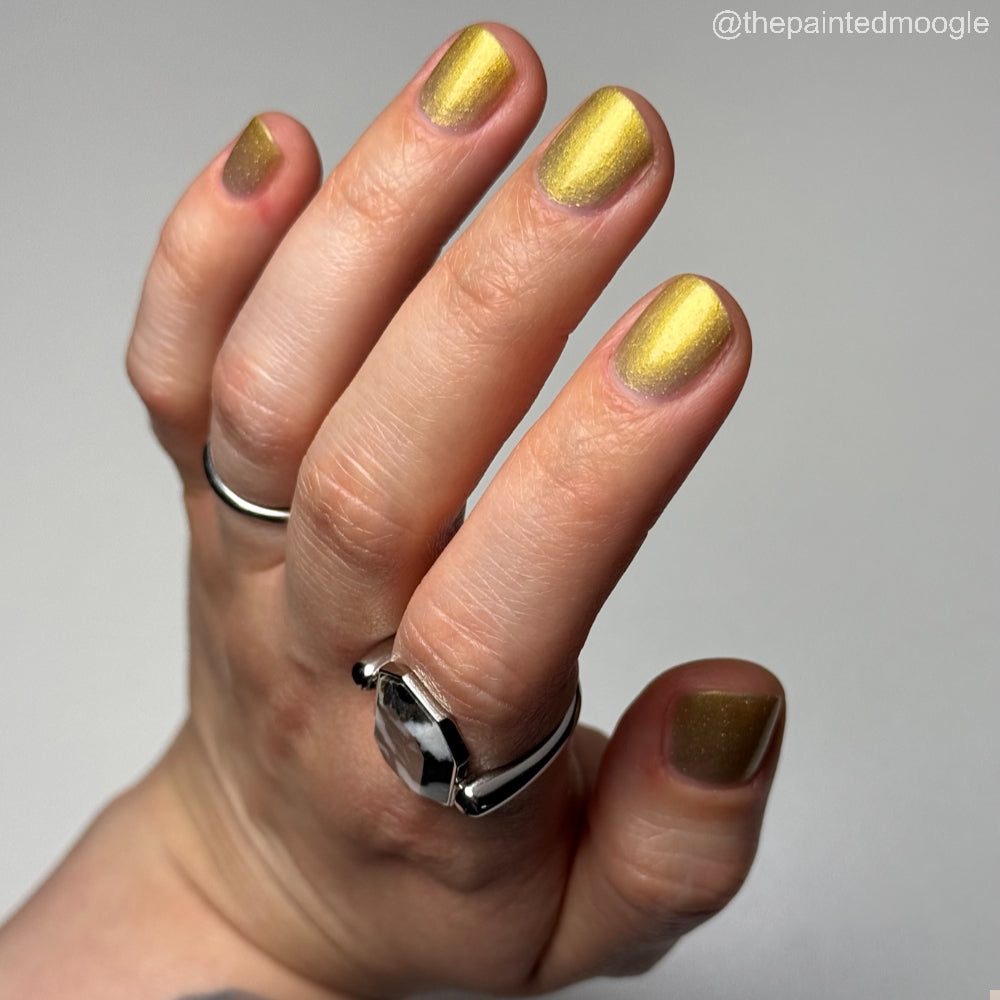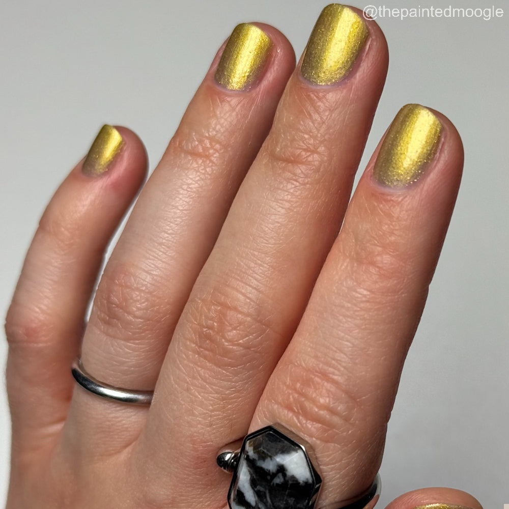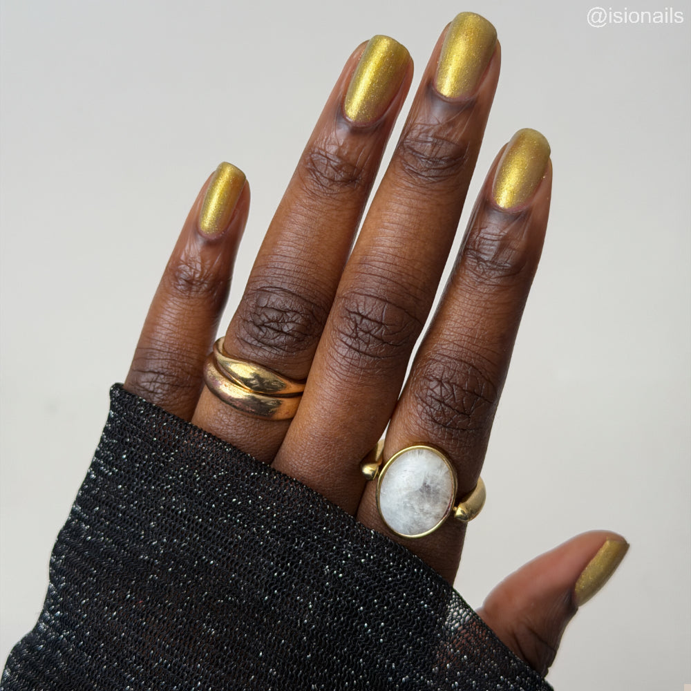 Dynasties is a light gold shimmering polish with scattering gold holographic glitter and golden micro flakes.