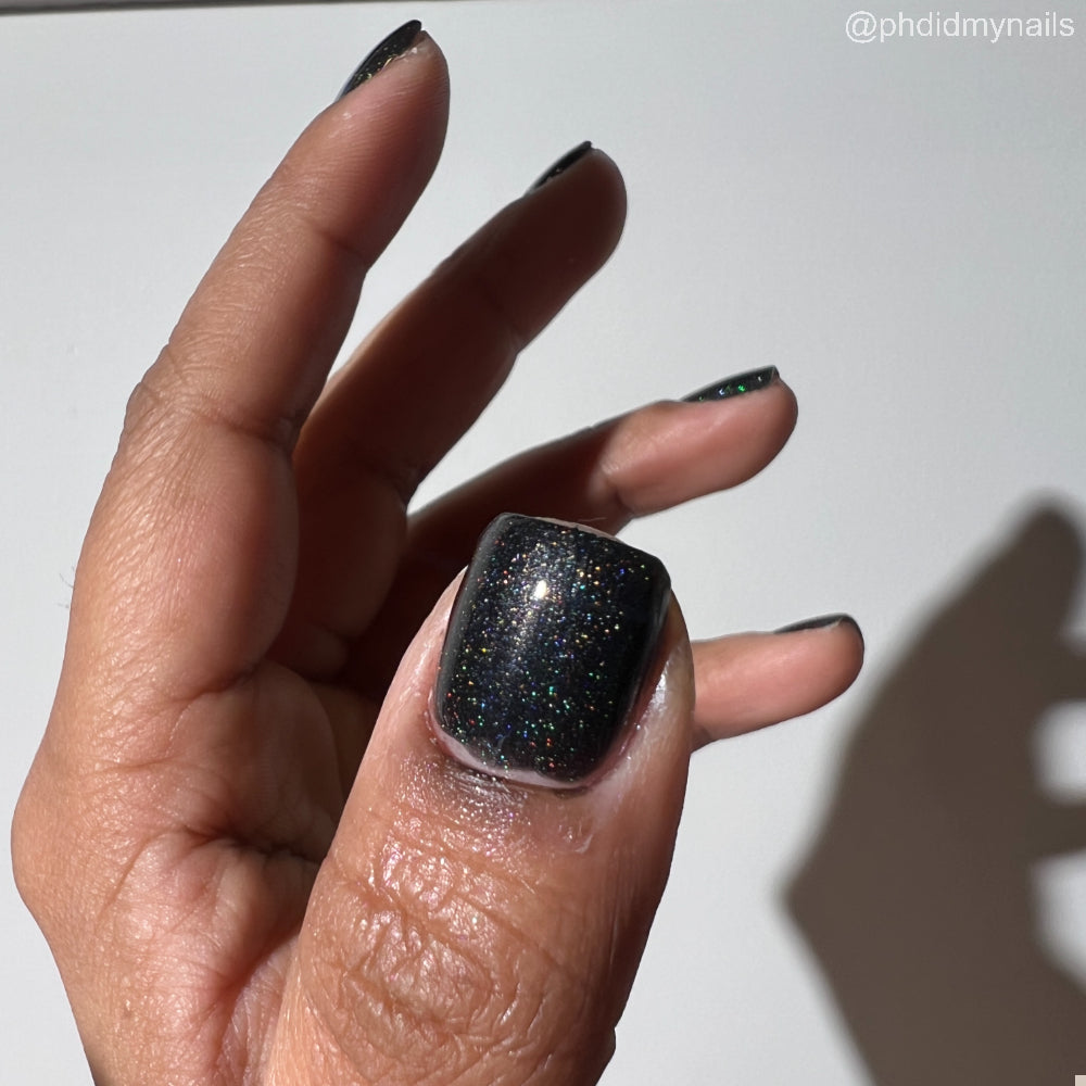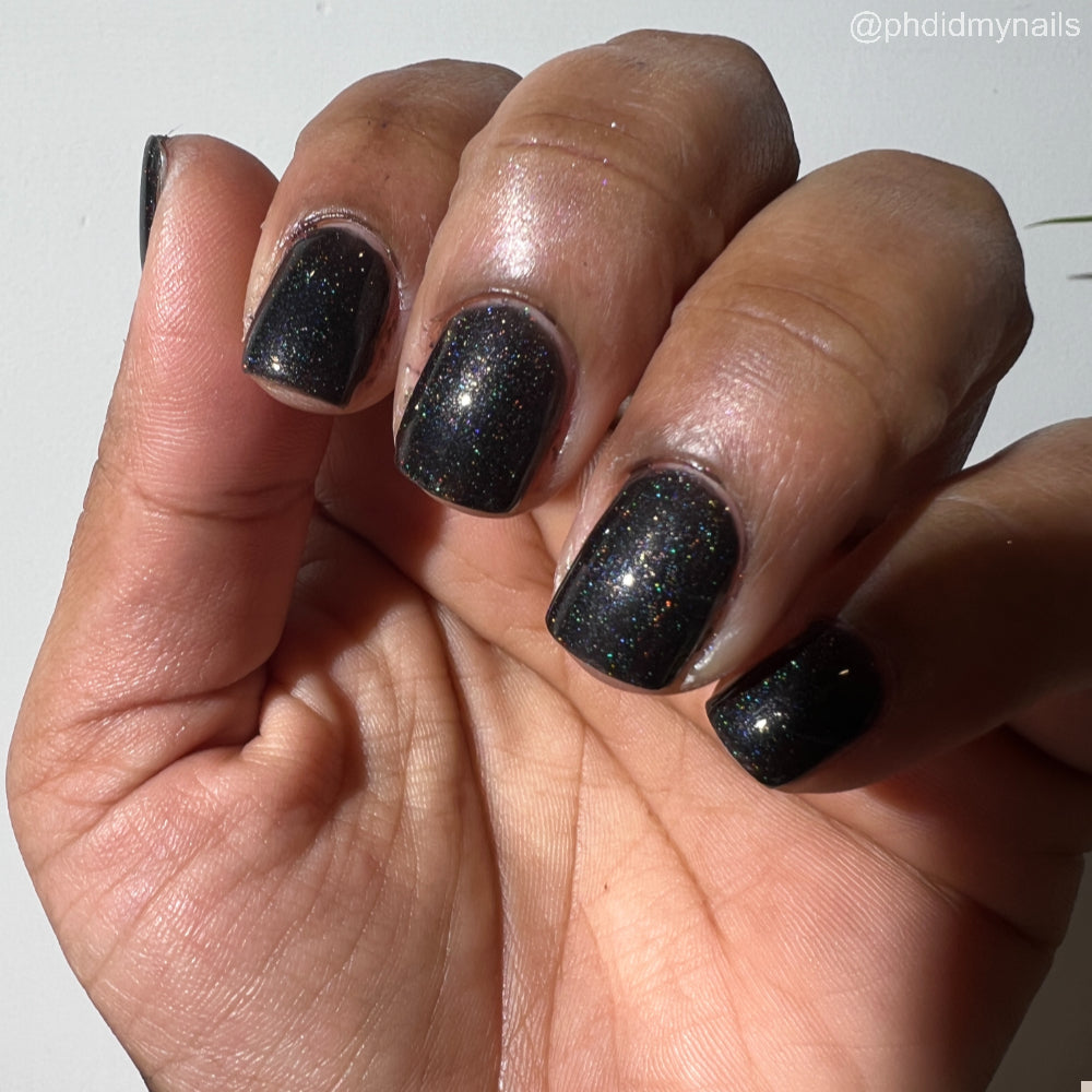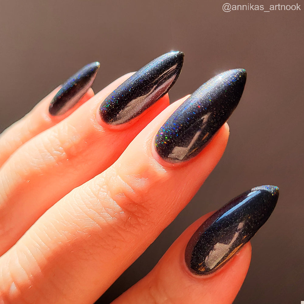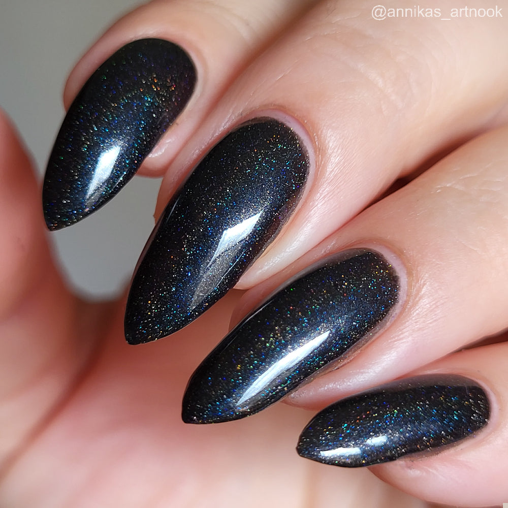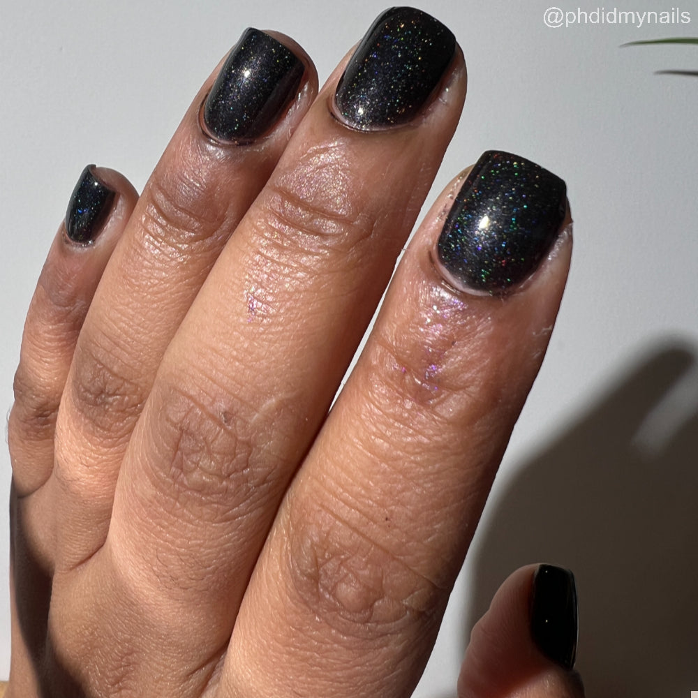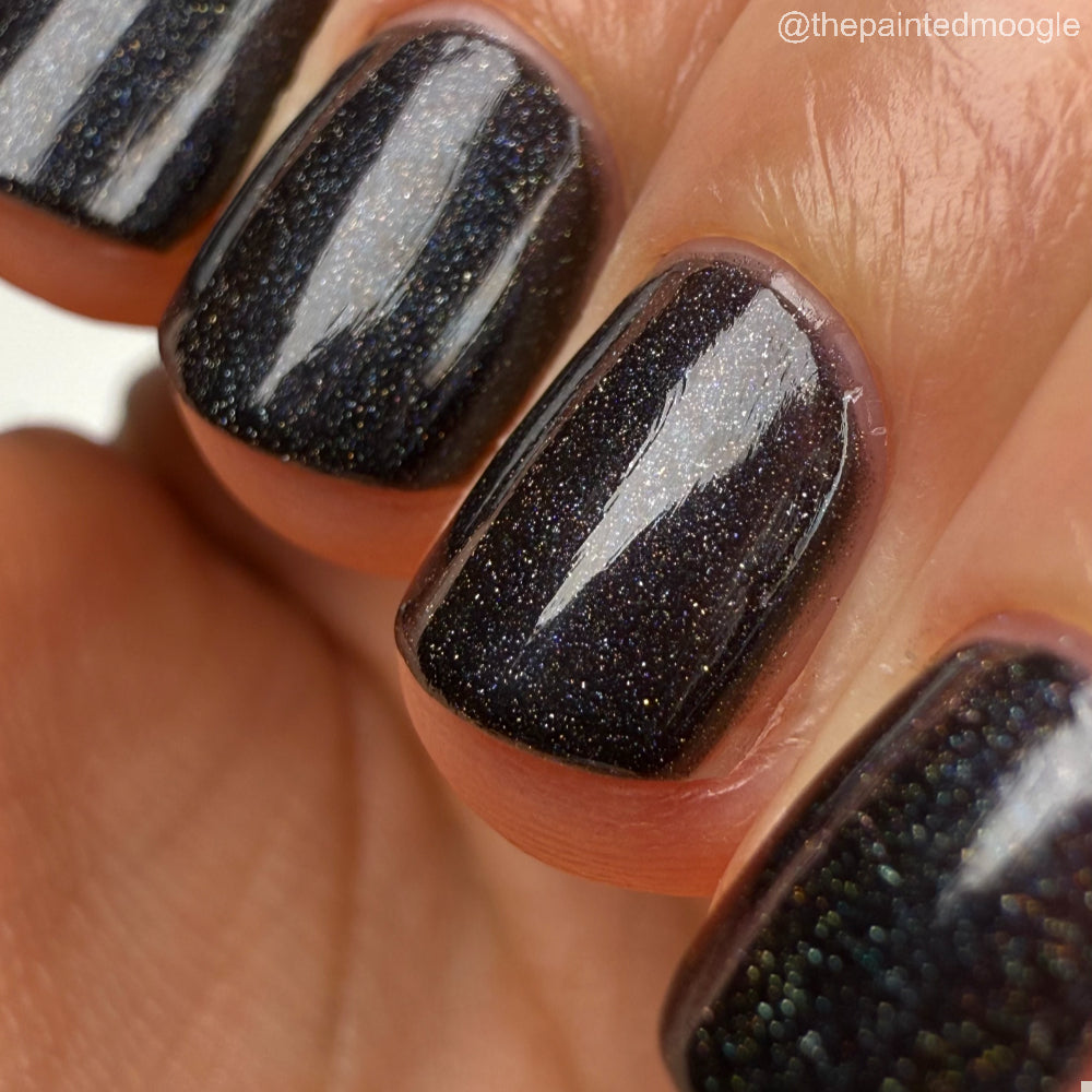 Dystopia is a slightly shimmering black linear holographic polish.