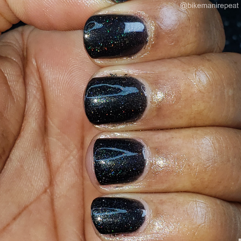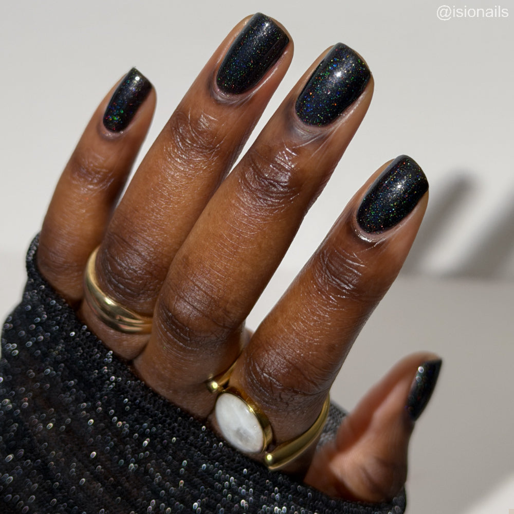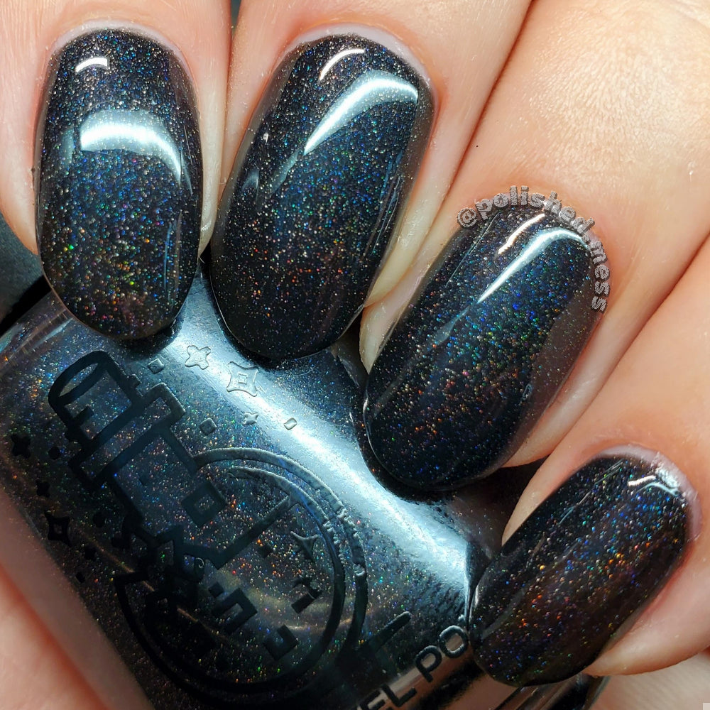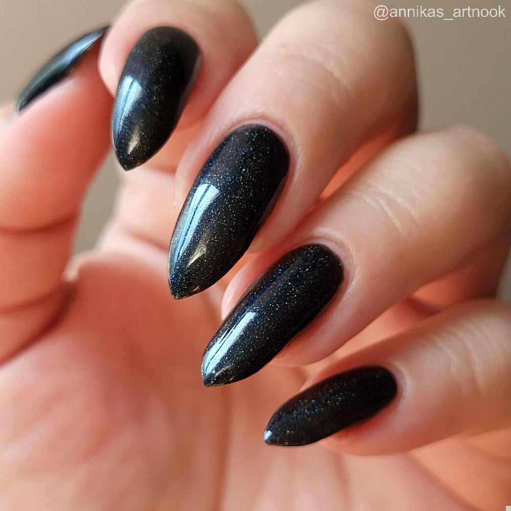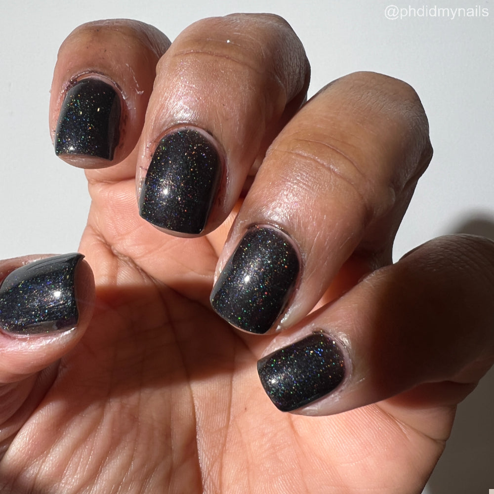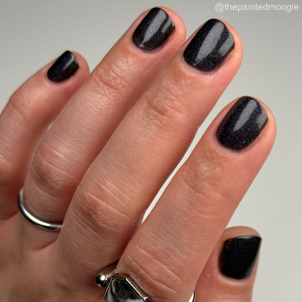 Dystopia is a slightly shimmering black linear holographic polish.