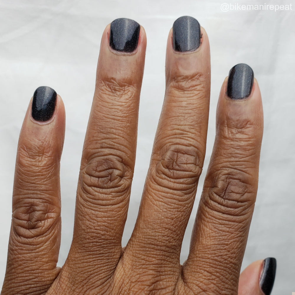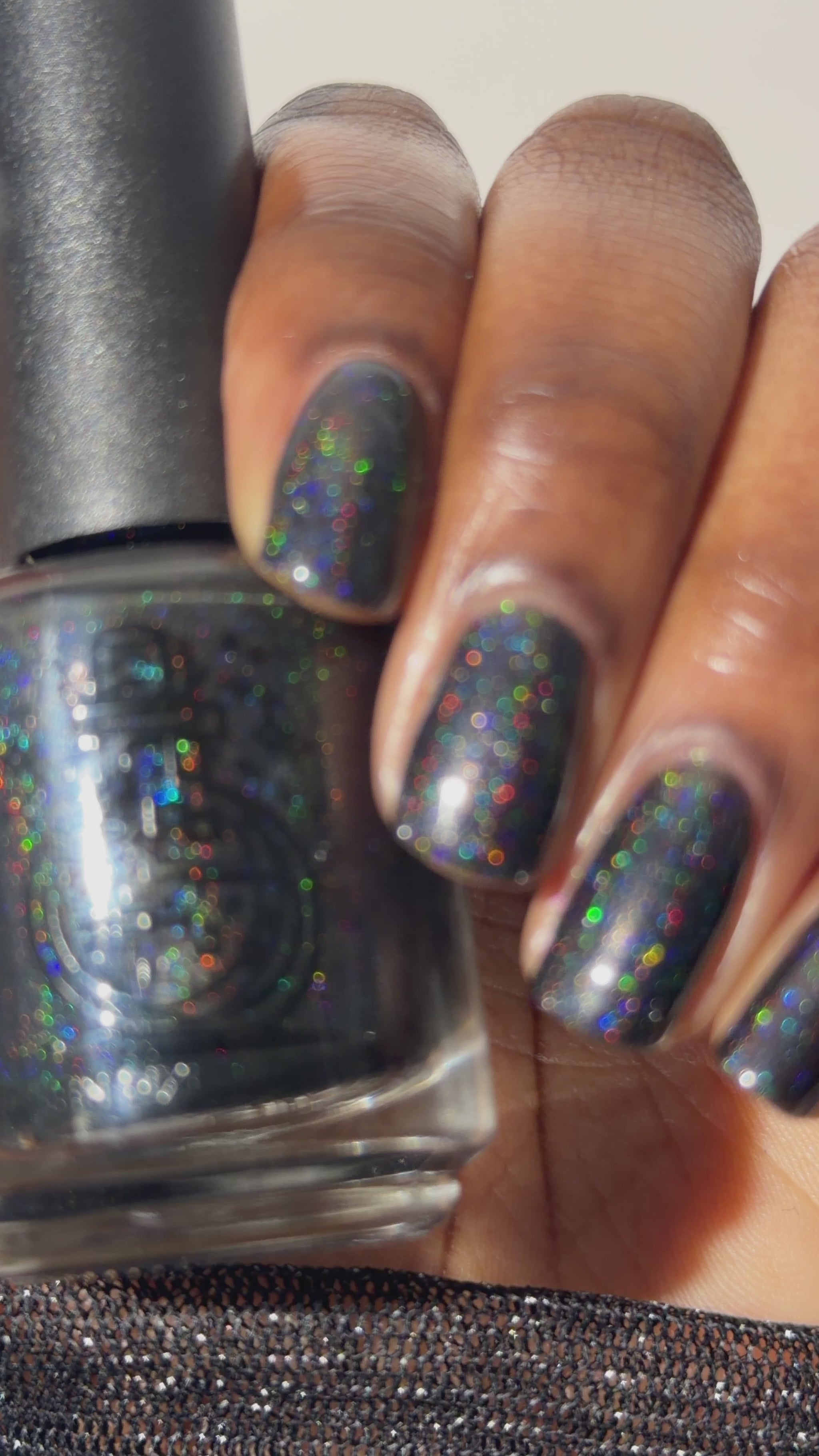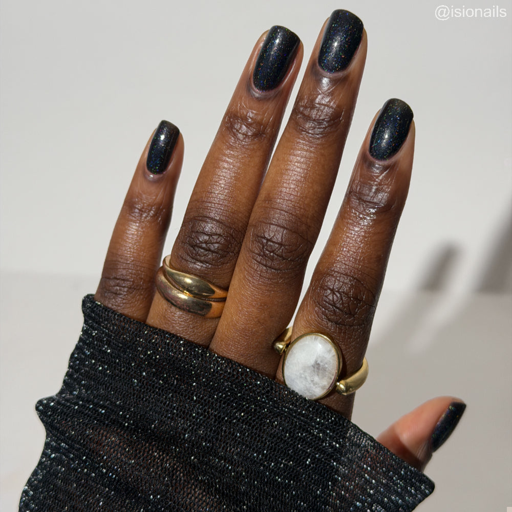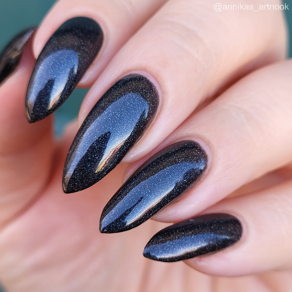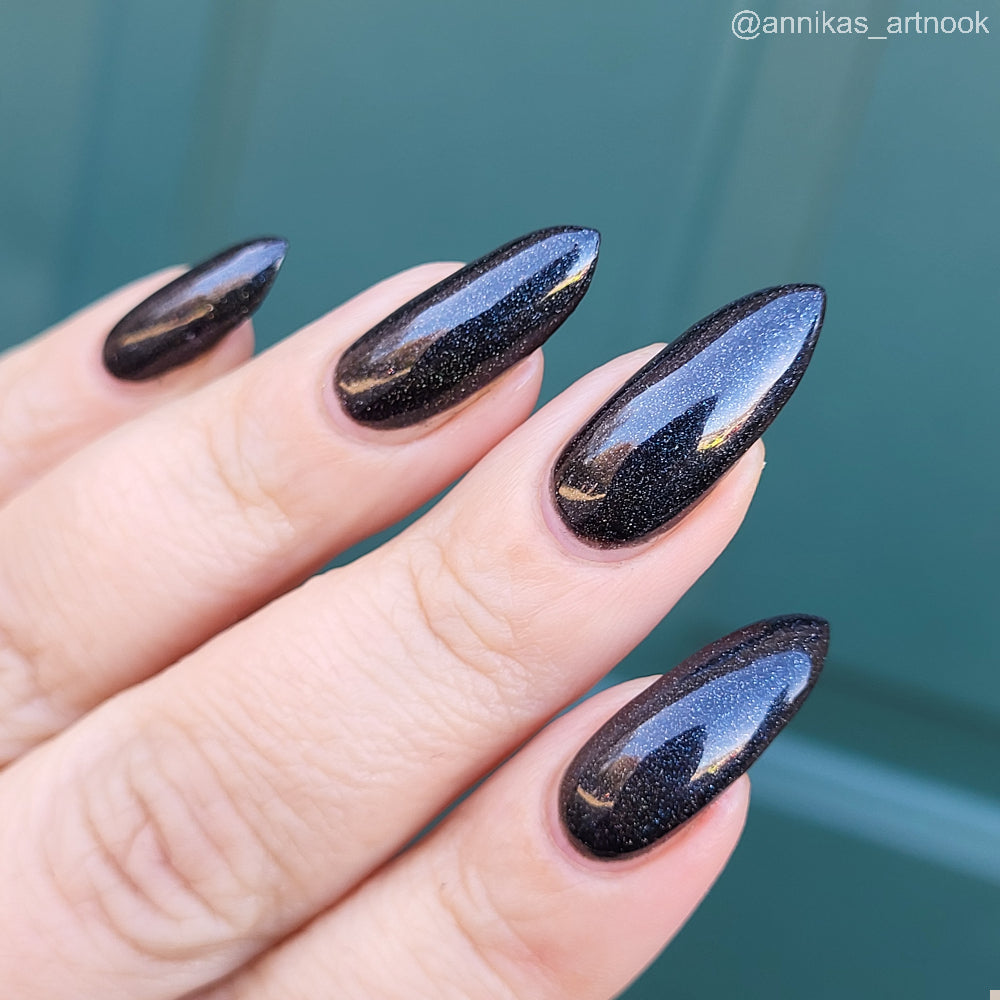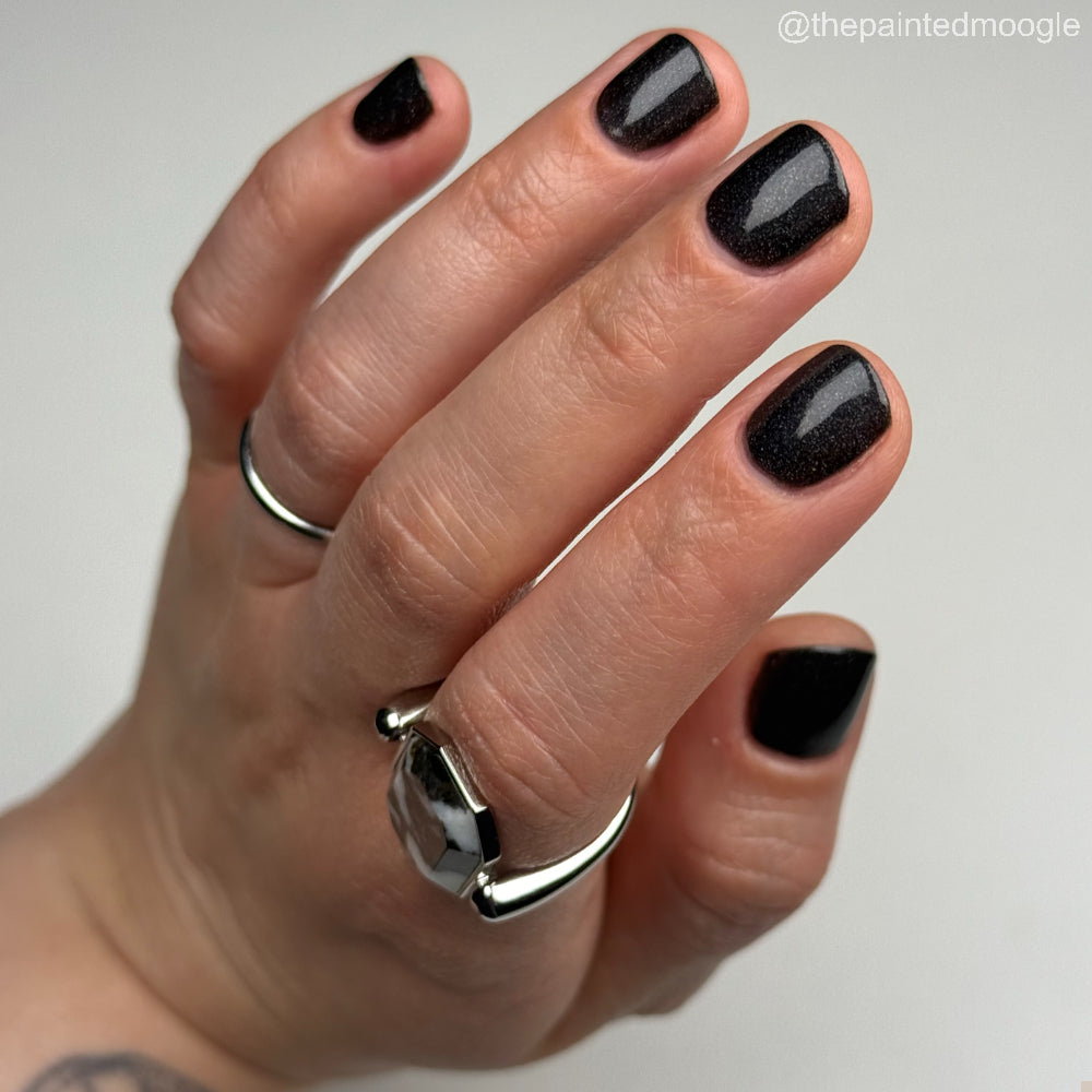Dystopia is a slightly shimmering black linear holographic polish.