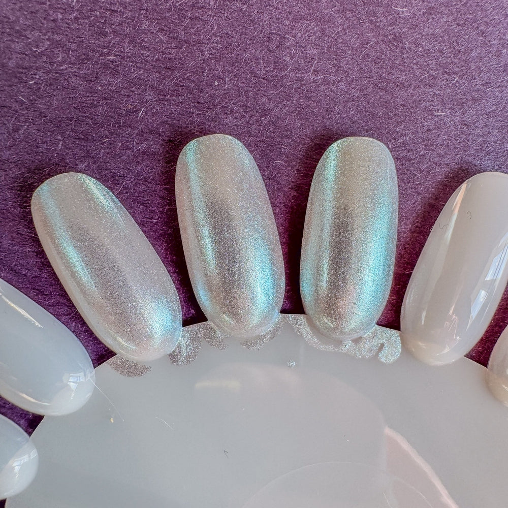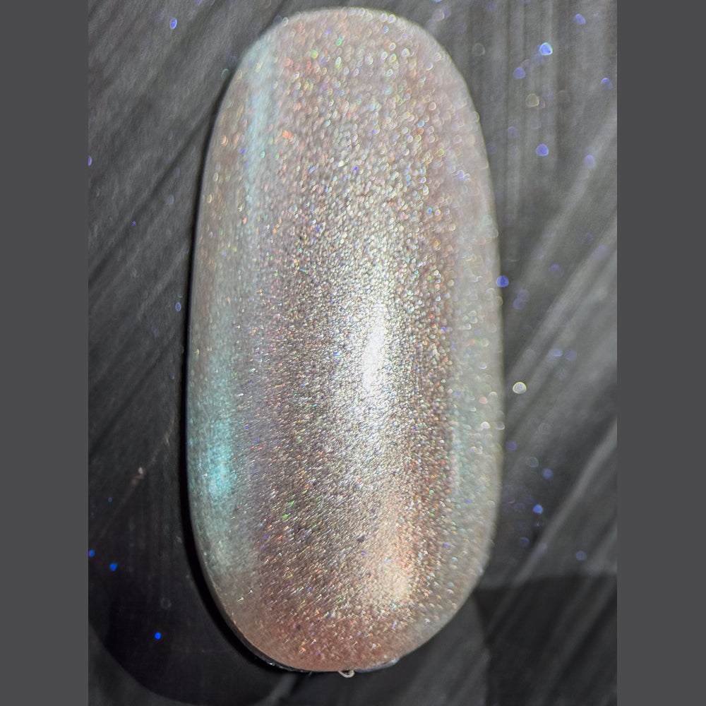 Holographic base scattered holographic pigment and packed with ultra bright icy blue aurora.