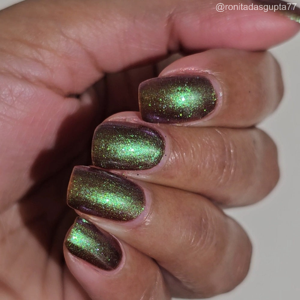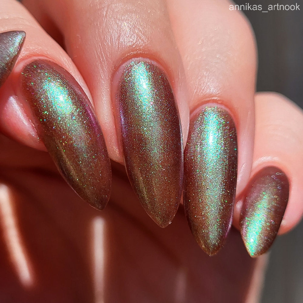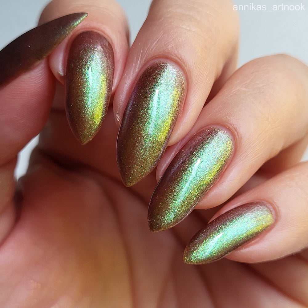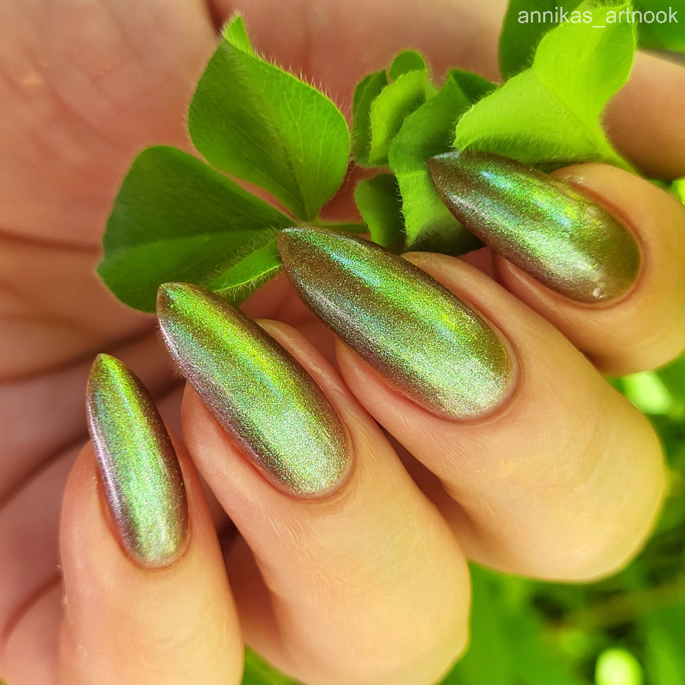 Chocolate brown chameleon base with strong green aurora shimmer with a purple-red-blue shift.