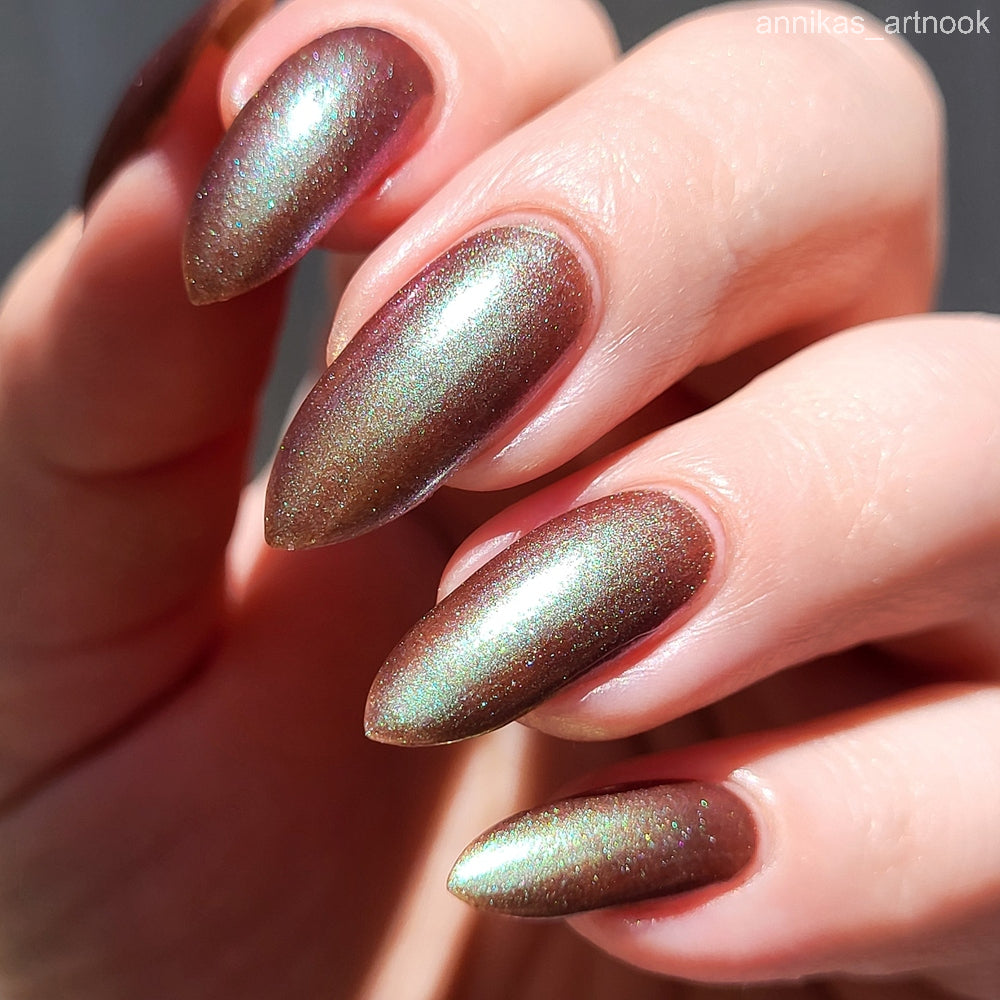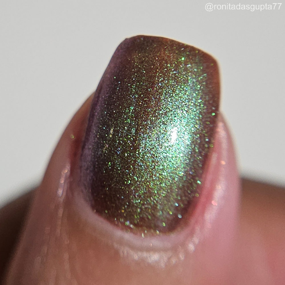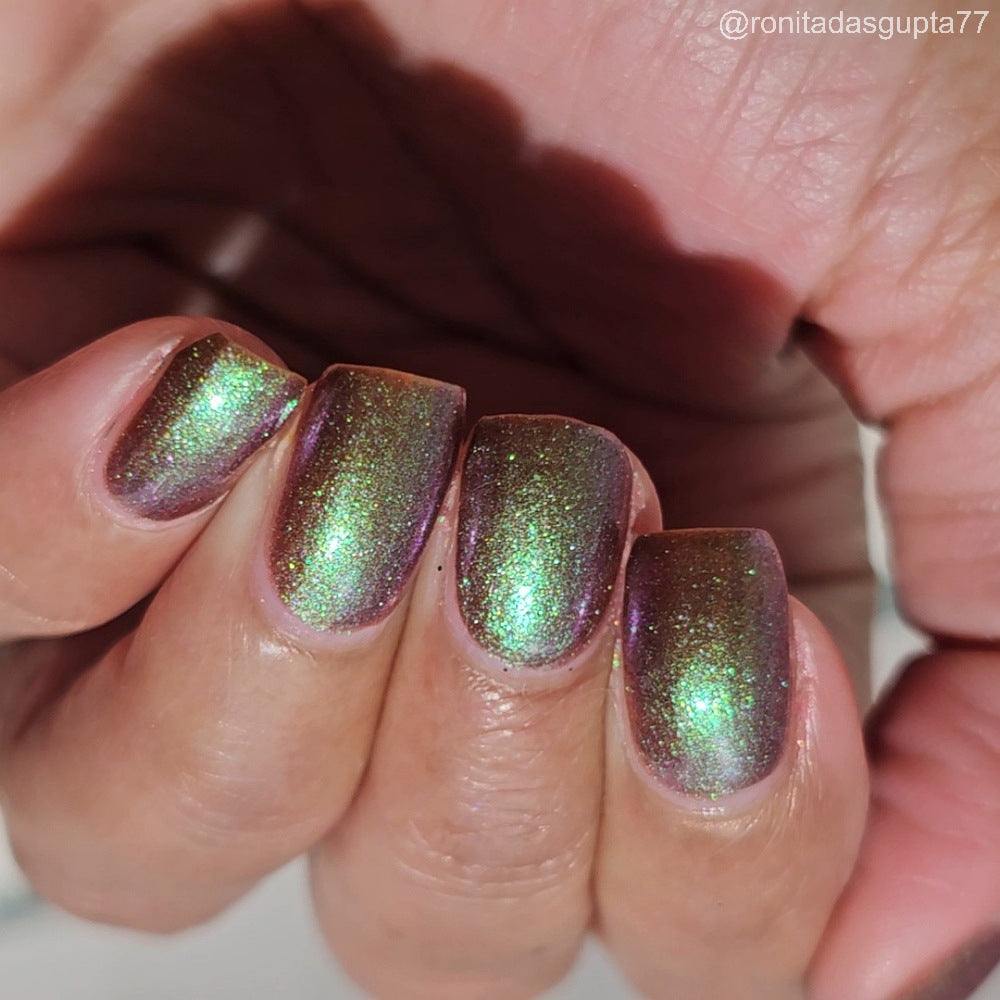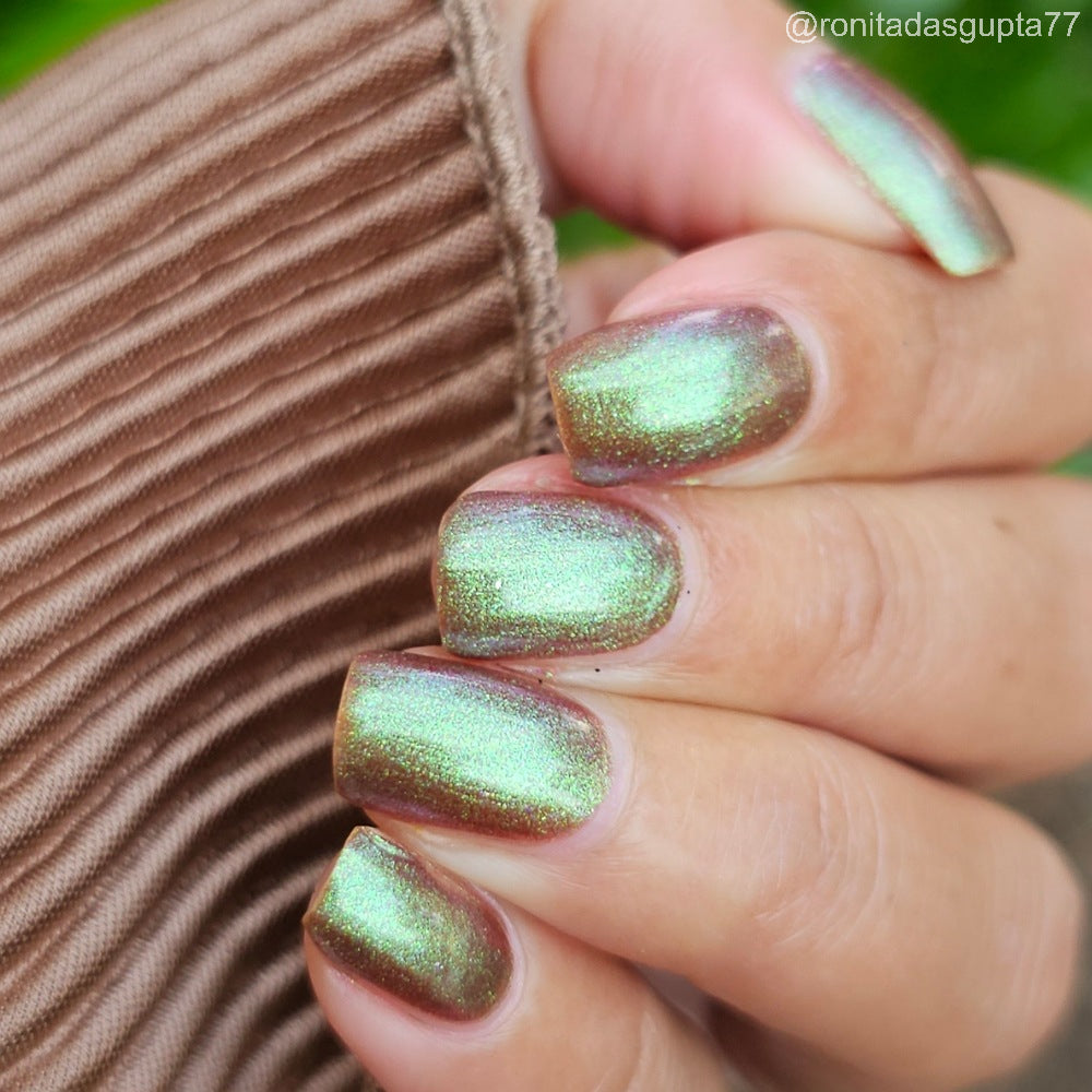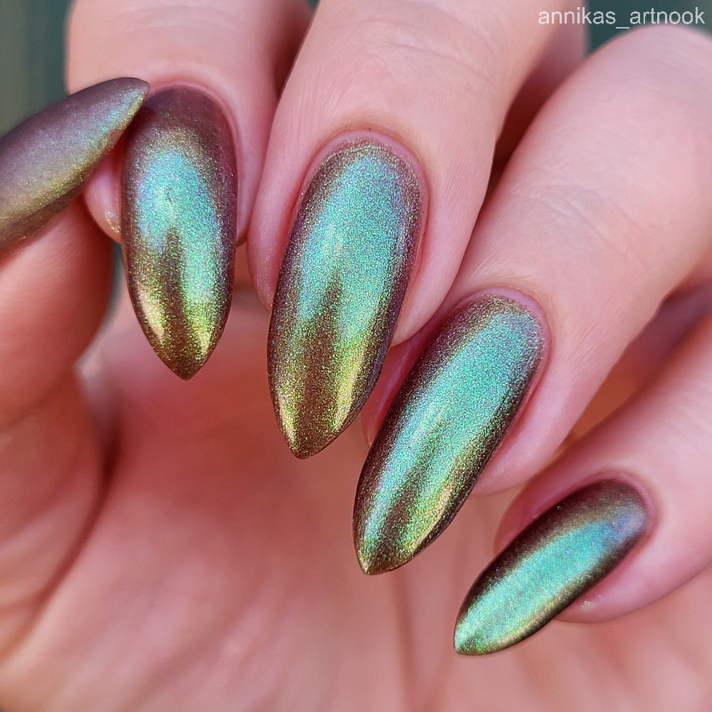 Chocolate brown chameleon base with strong green aurora shimmer with a purple-red-blue shift.