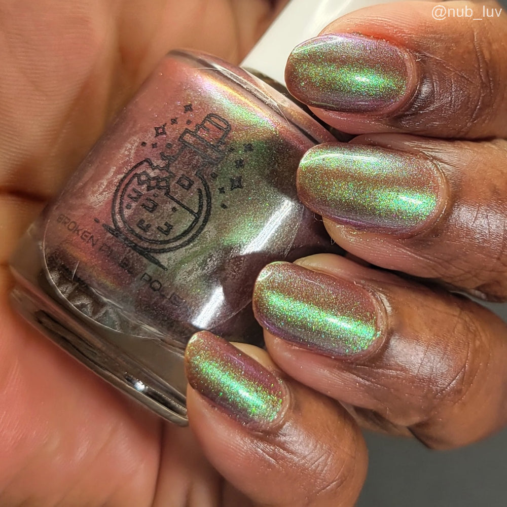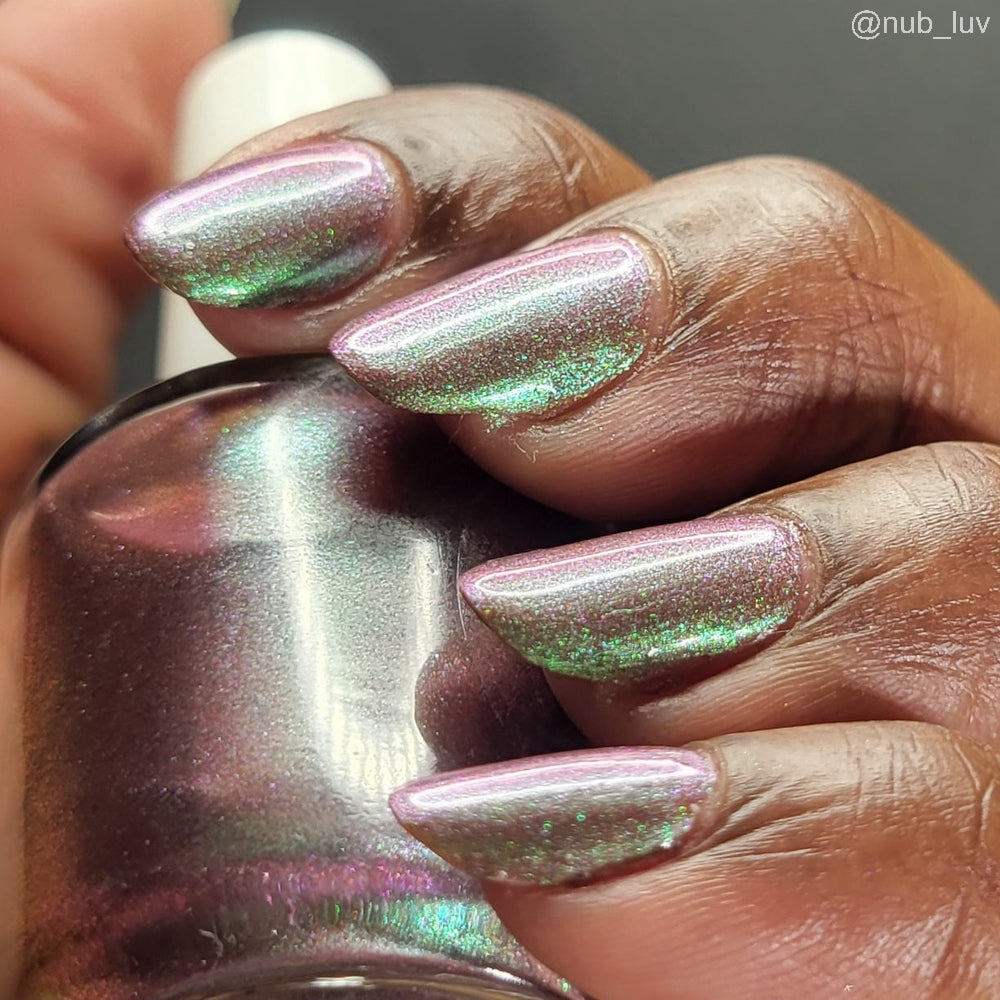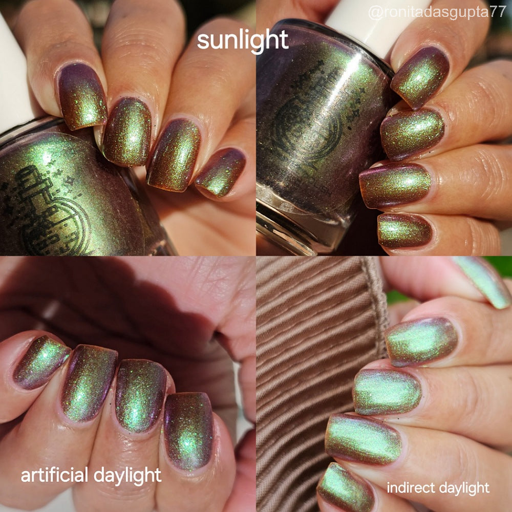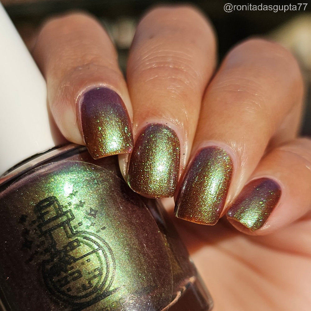 Chocolate brown chameleon base with strong green aurora shimmer with a purple-red-blue shift.