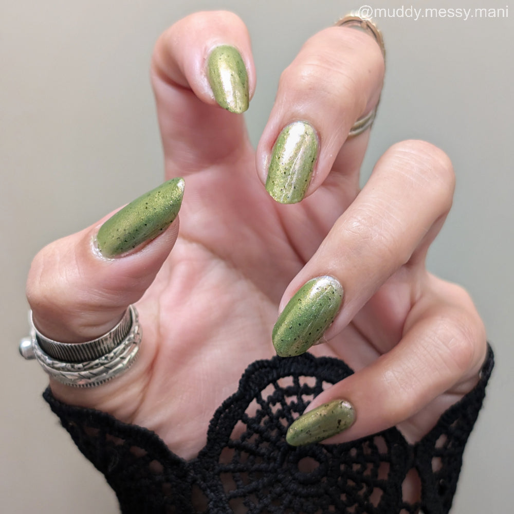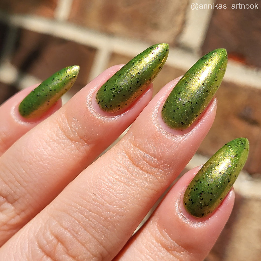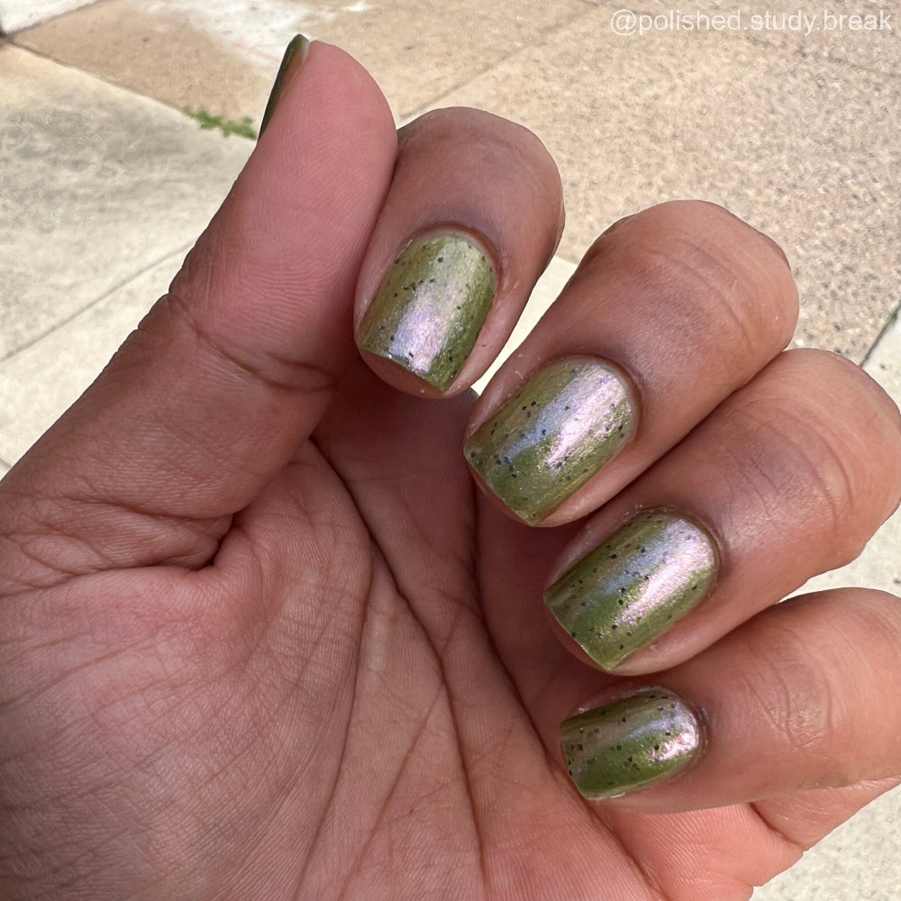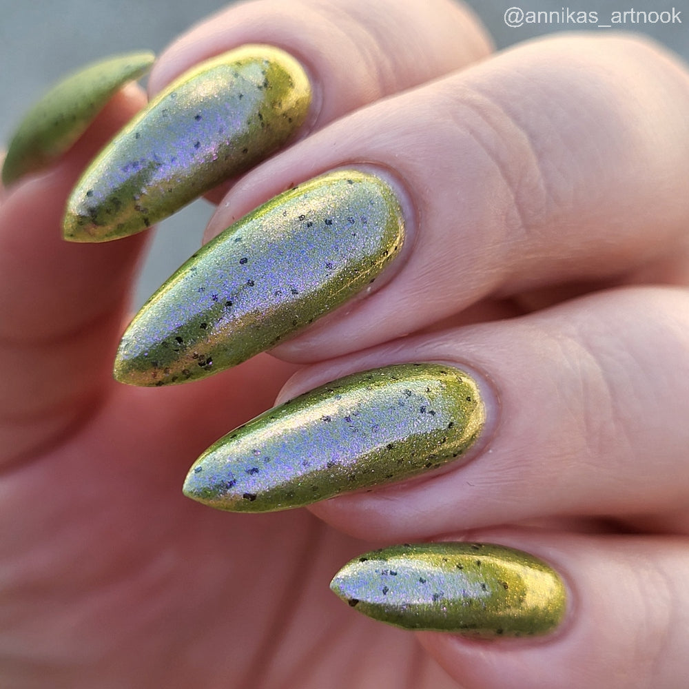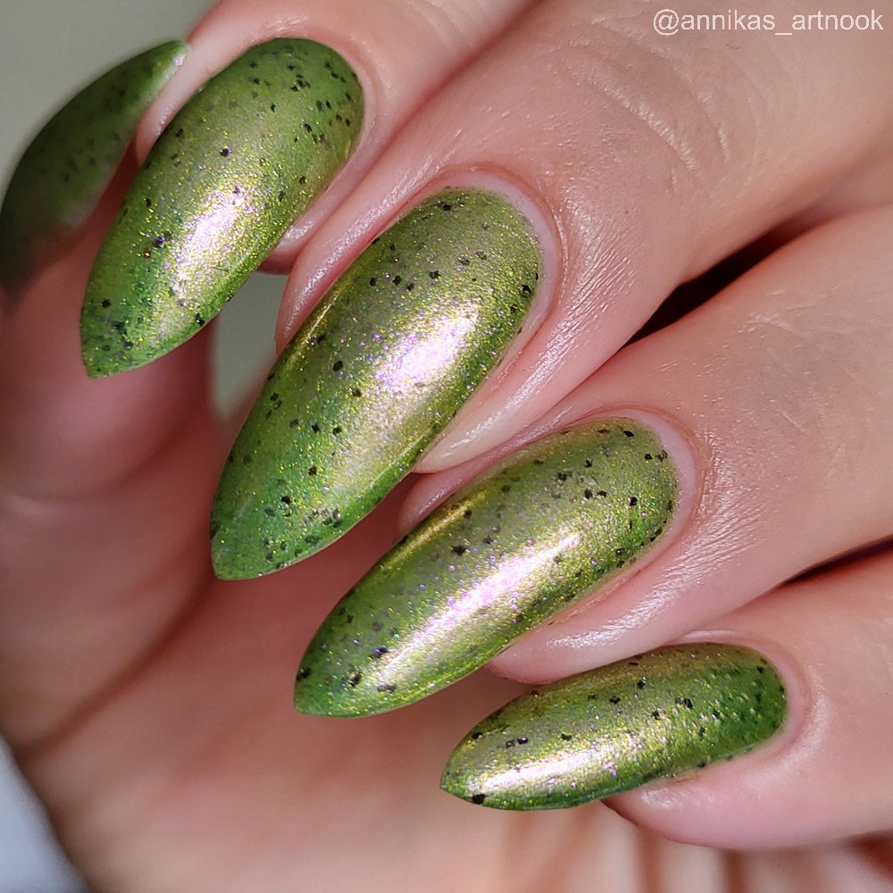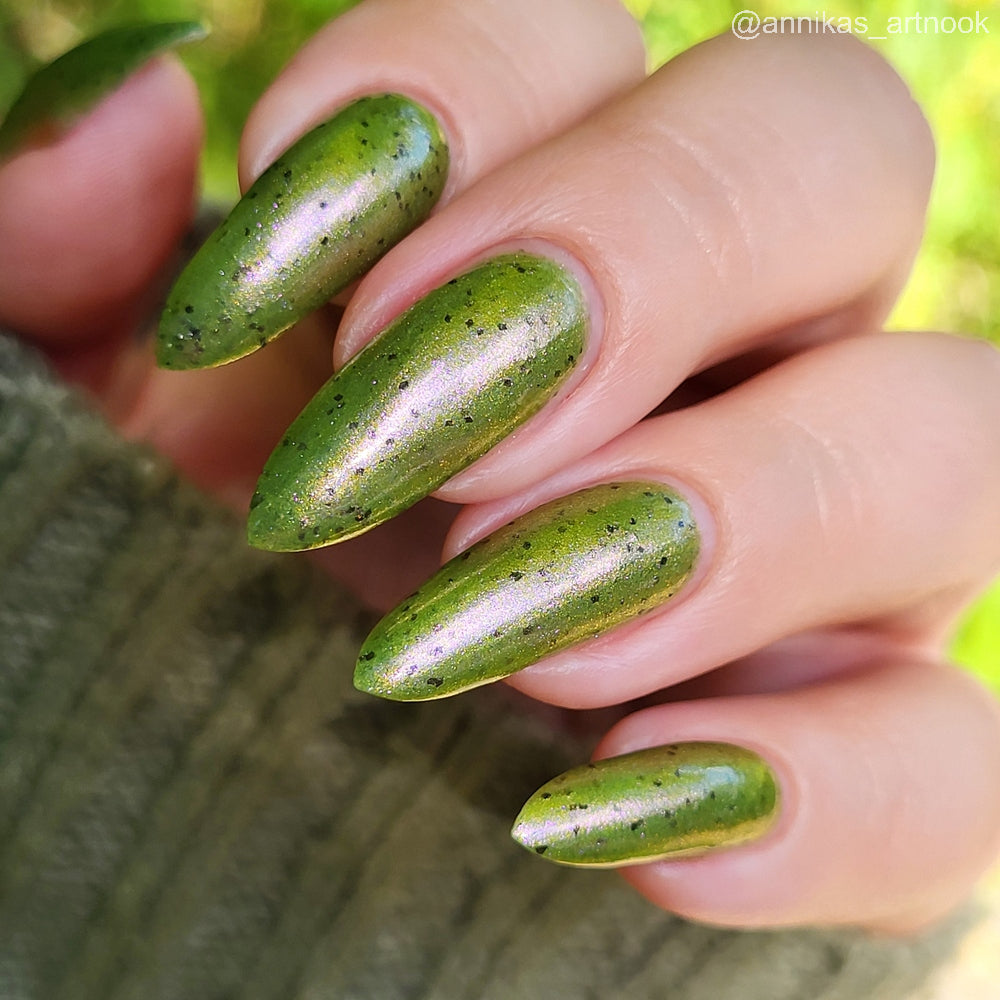 Miasma has an olive green base, sparkling purple-fuchsia shimmer, and tiny black micro shred glitters. Glitter may settle at the bottom of the bottle. Shake well or leave upside down 2-3 minutes before applying.