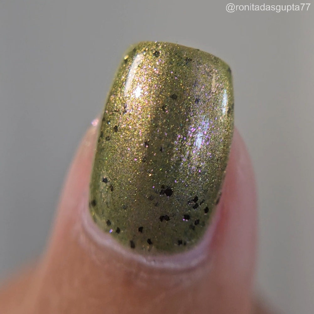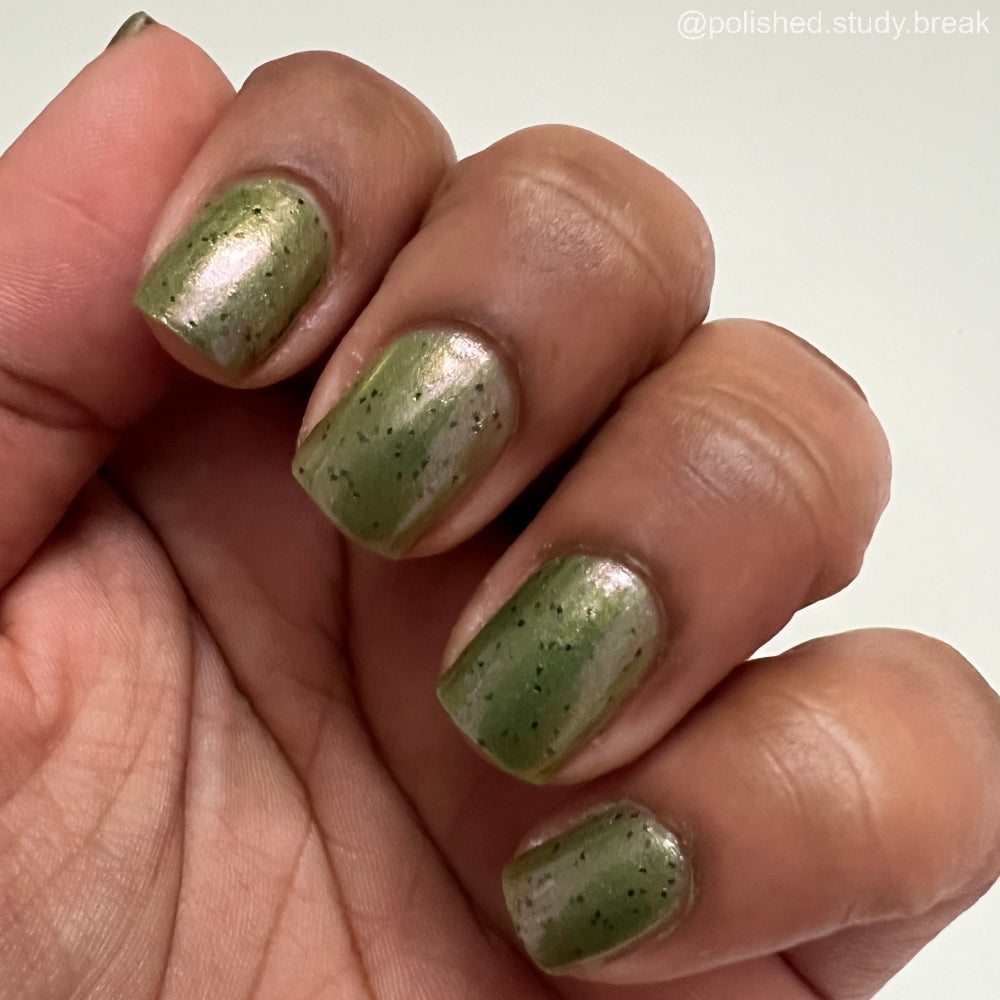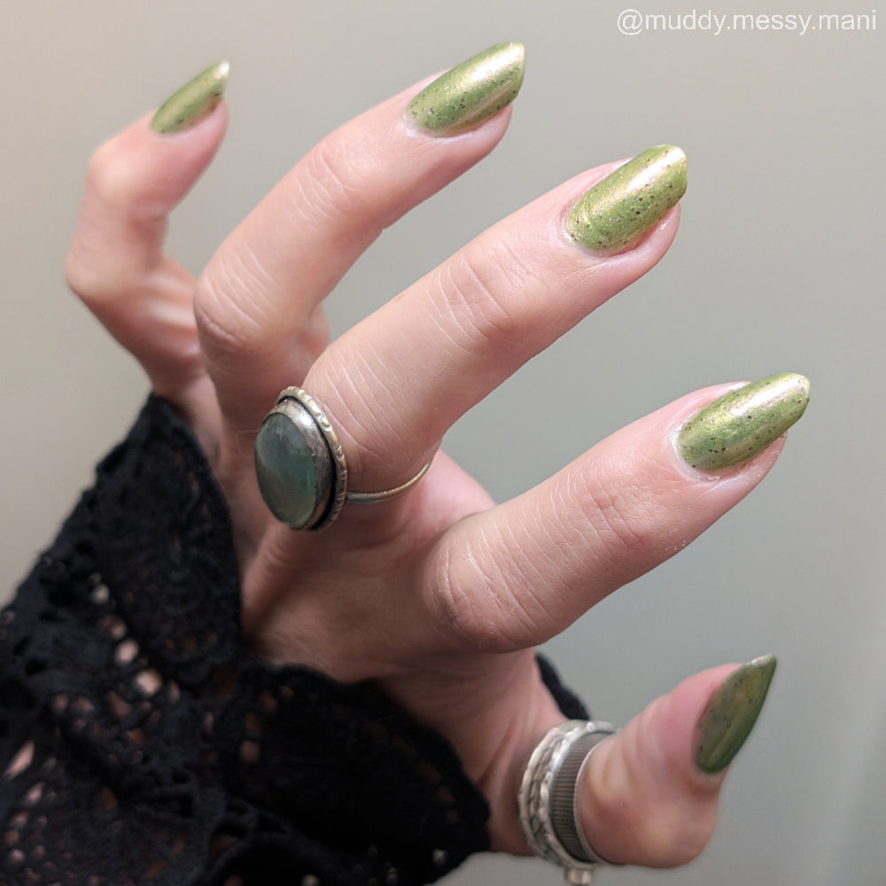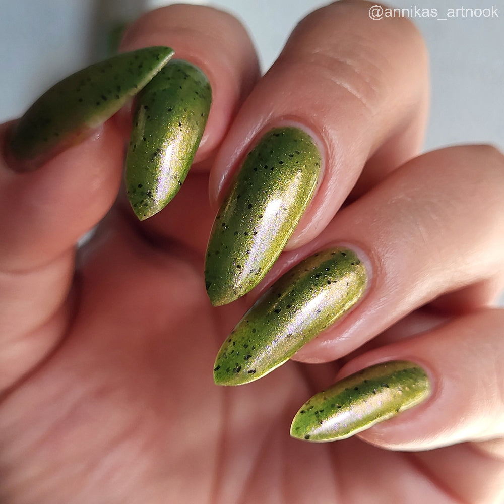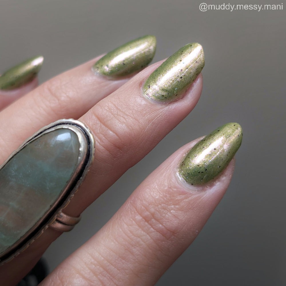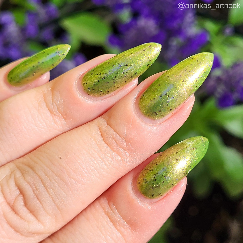 Miasma has an olive green base, sparkling purple-fuchsia shimmer, and tiny black micro shred glitters. Glitter may settle at the bottom of the bottle. Shake well or leave upside down 2-3 minutes before applying.