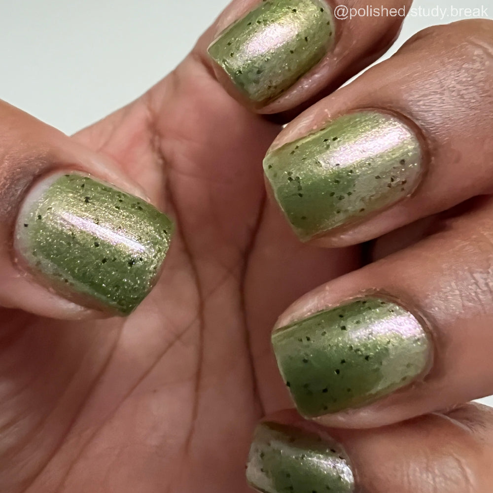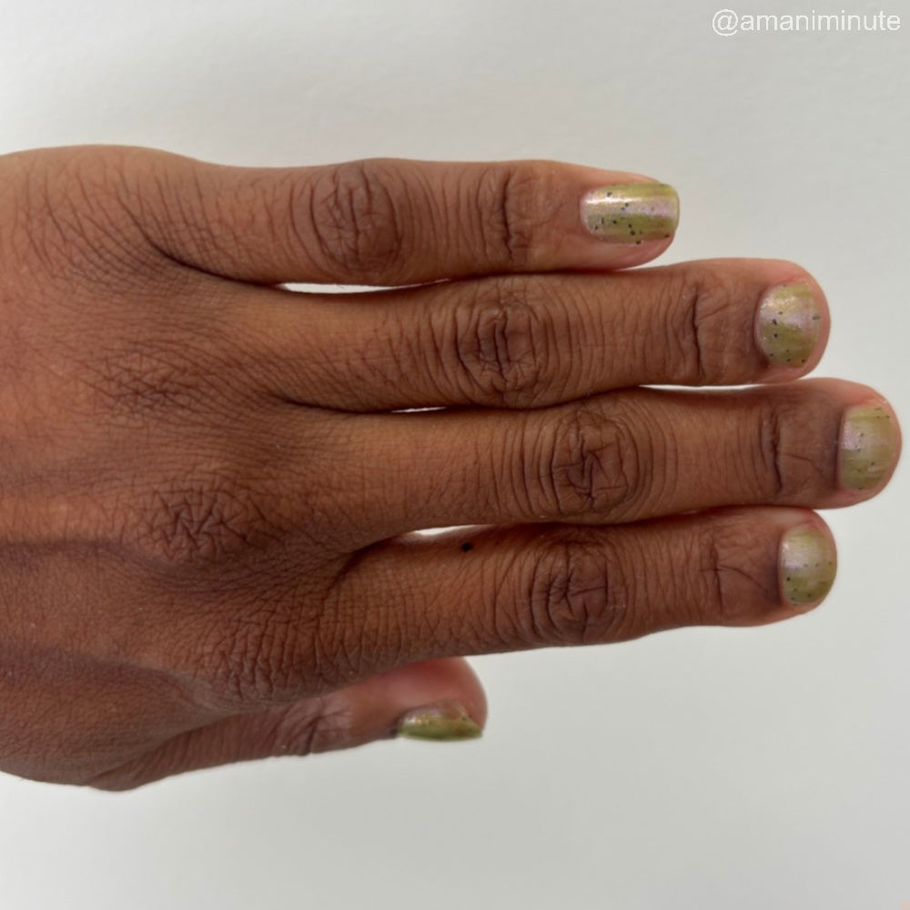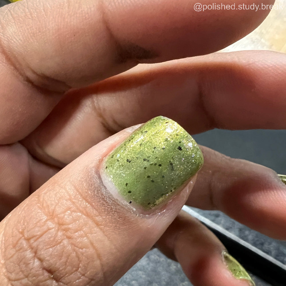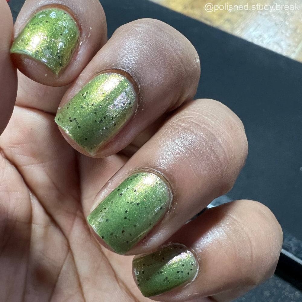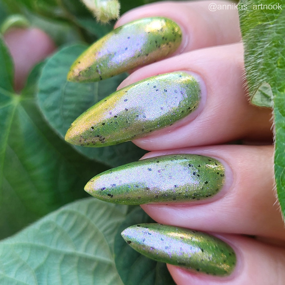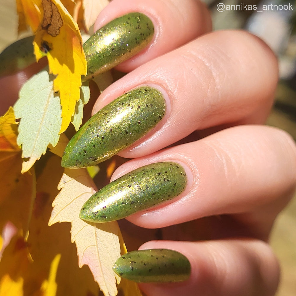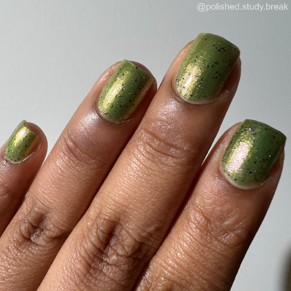 Miasma has an olive green base, sparkling purple-fuchsia shimmer, and tiny black micro shred glitters. Glitter may settle at the bottom of the bottle. Shake well or leave upside down 2-3 minutes before applying.