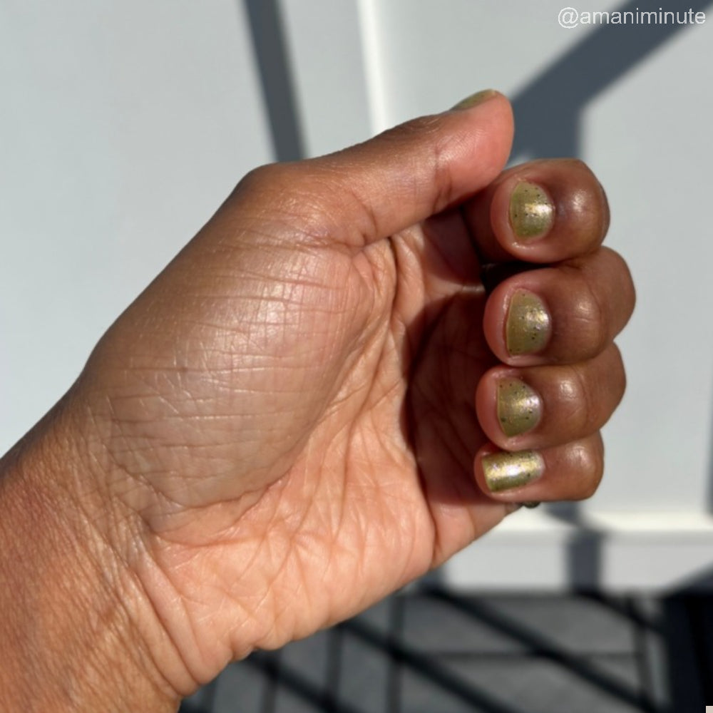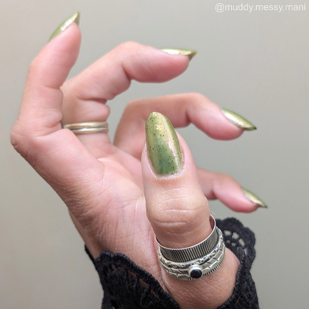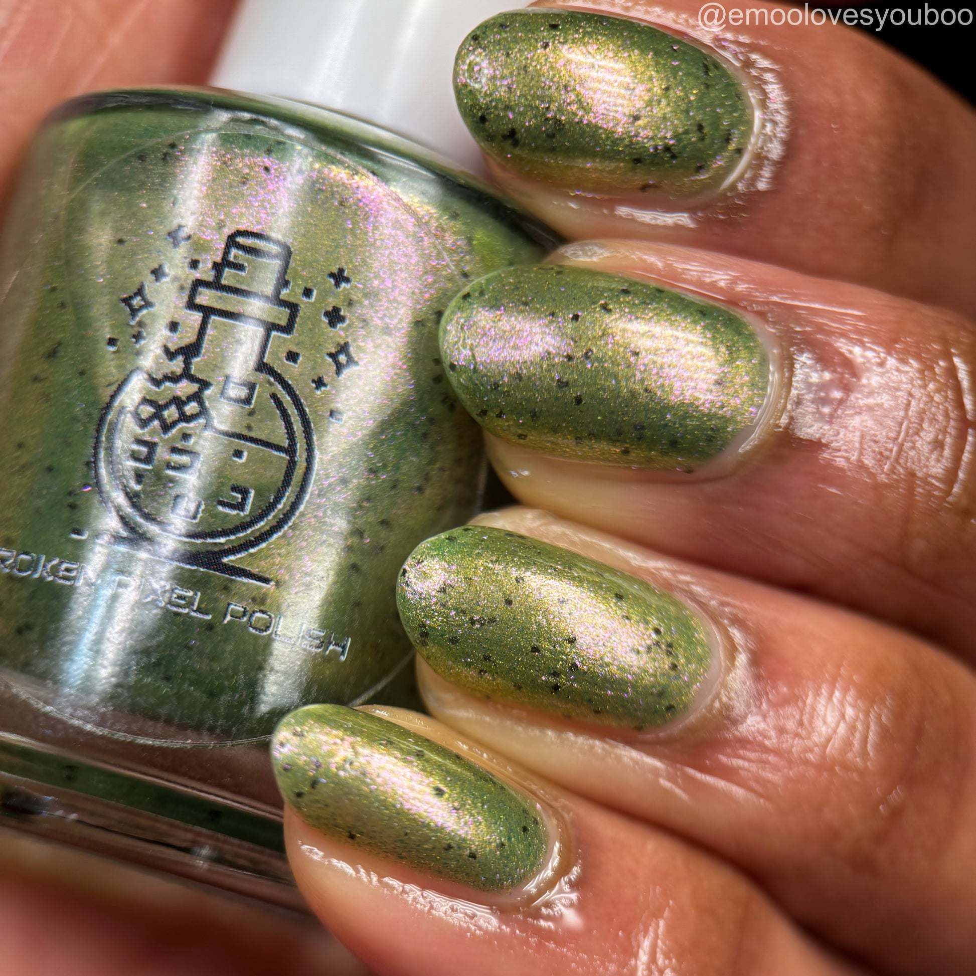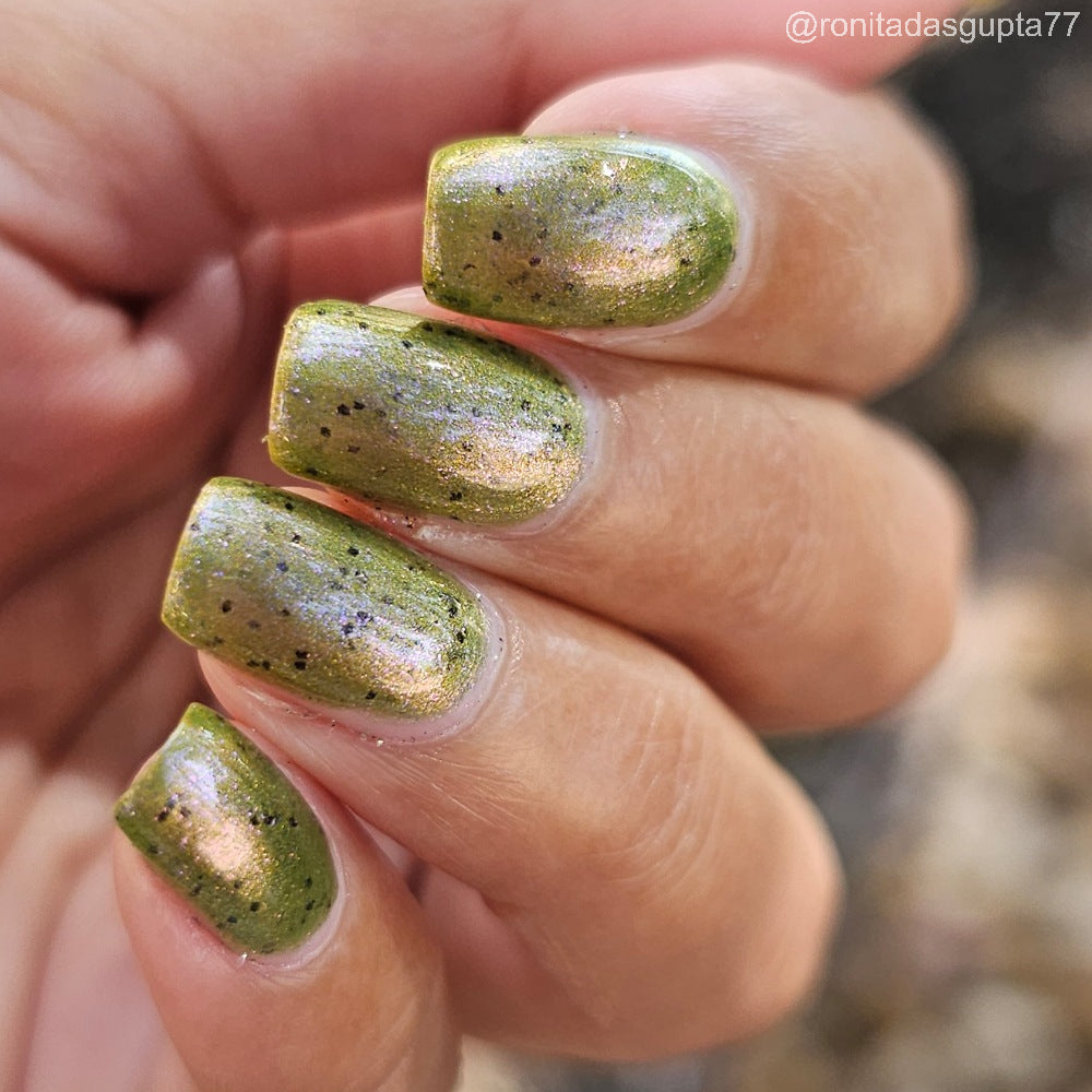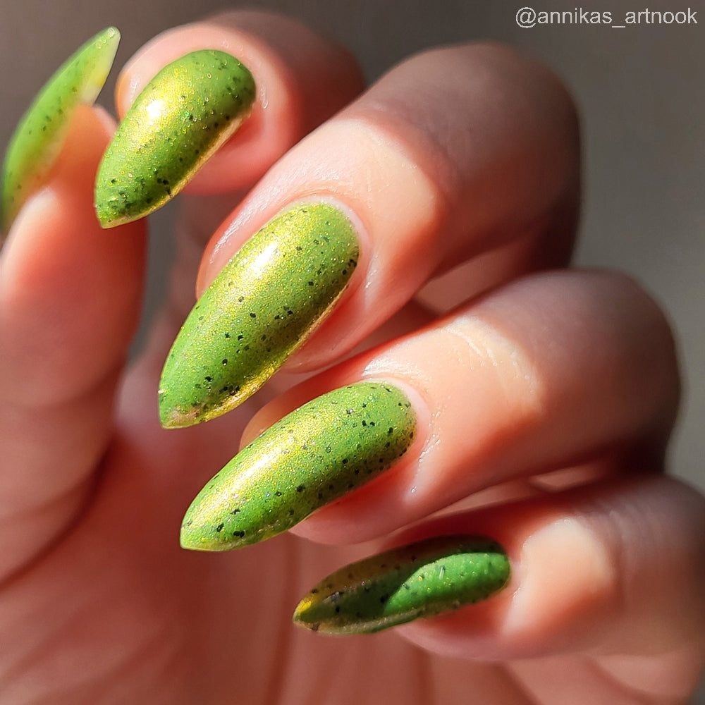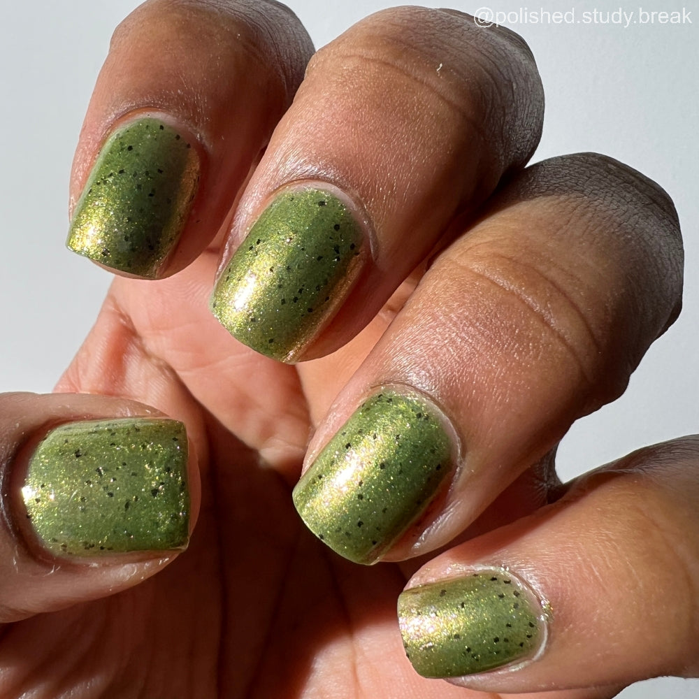 Miasma has an olive green base, sparkling purple-fuchsia shimmer, and tiny black micro shred glitters. Glitter may settle at the bottom of the bottle. Shake well or leave upside down 2-3 minutes before applying.