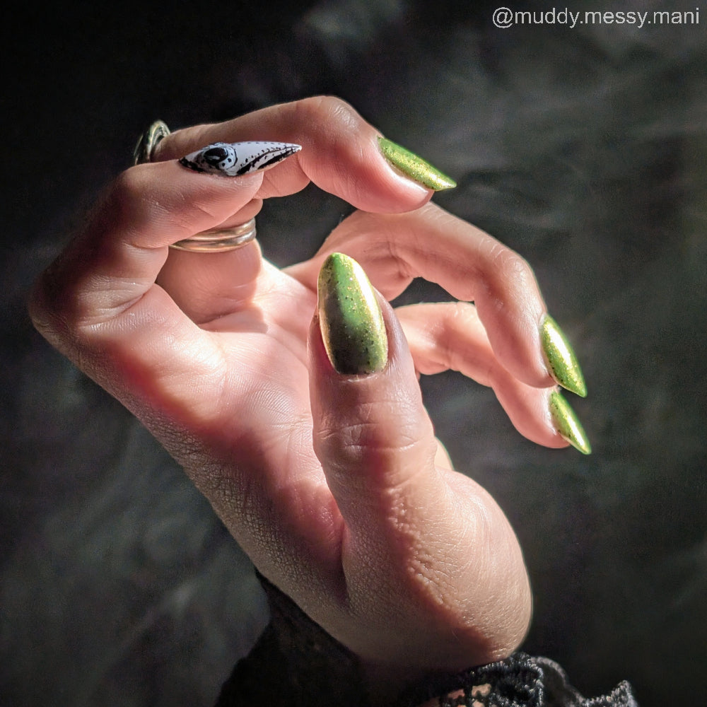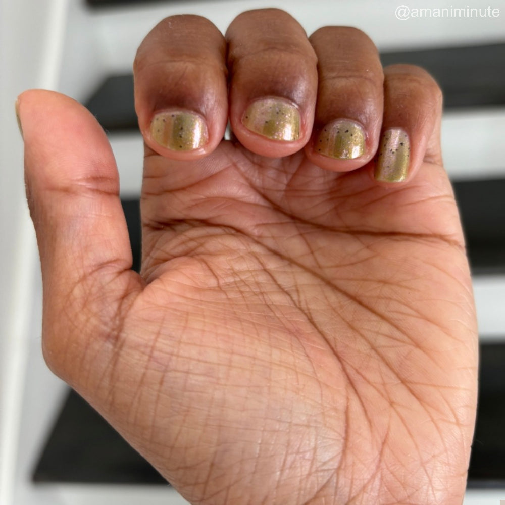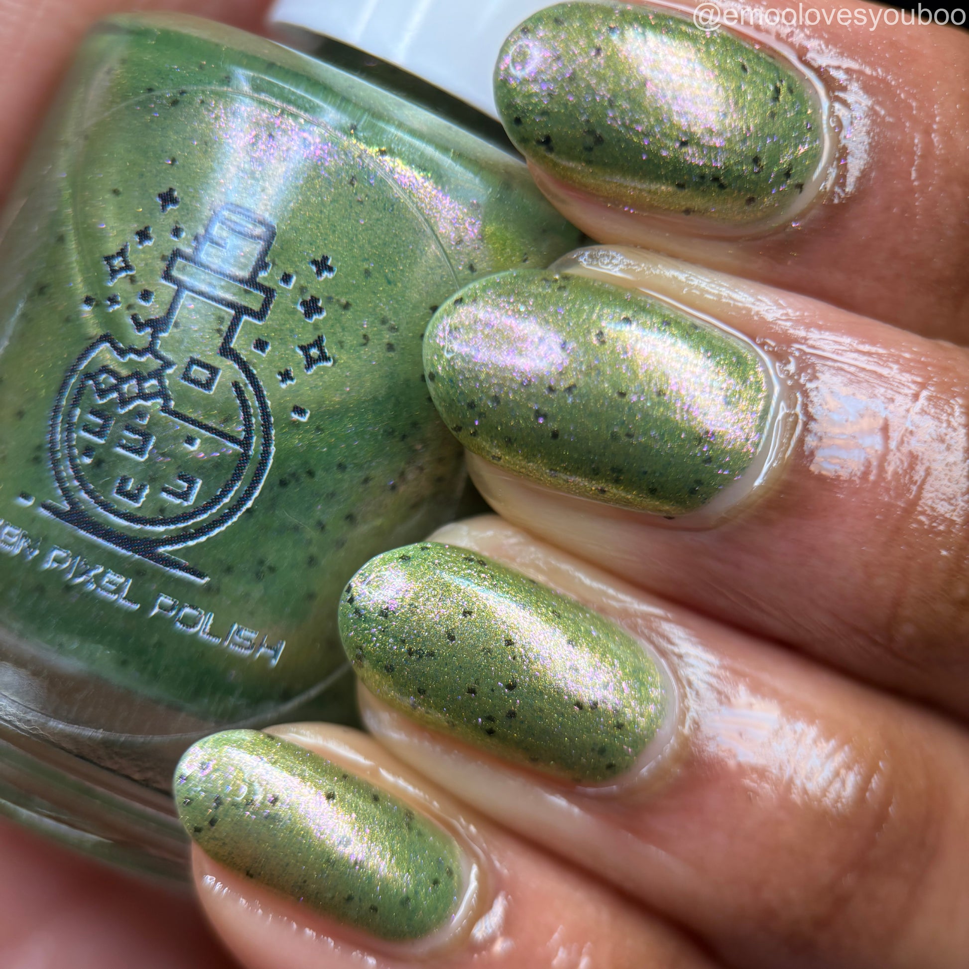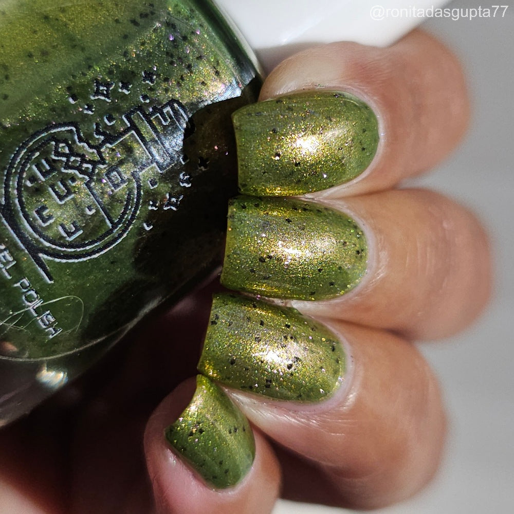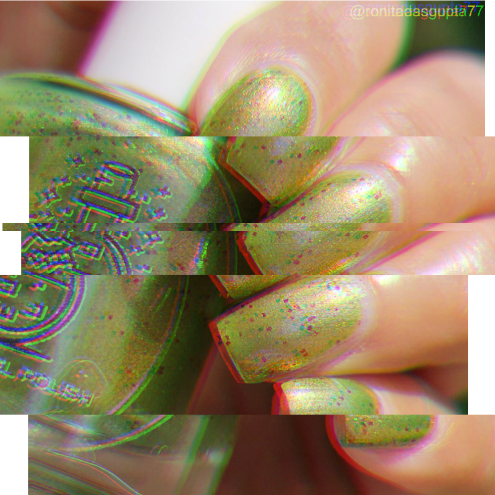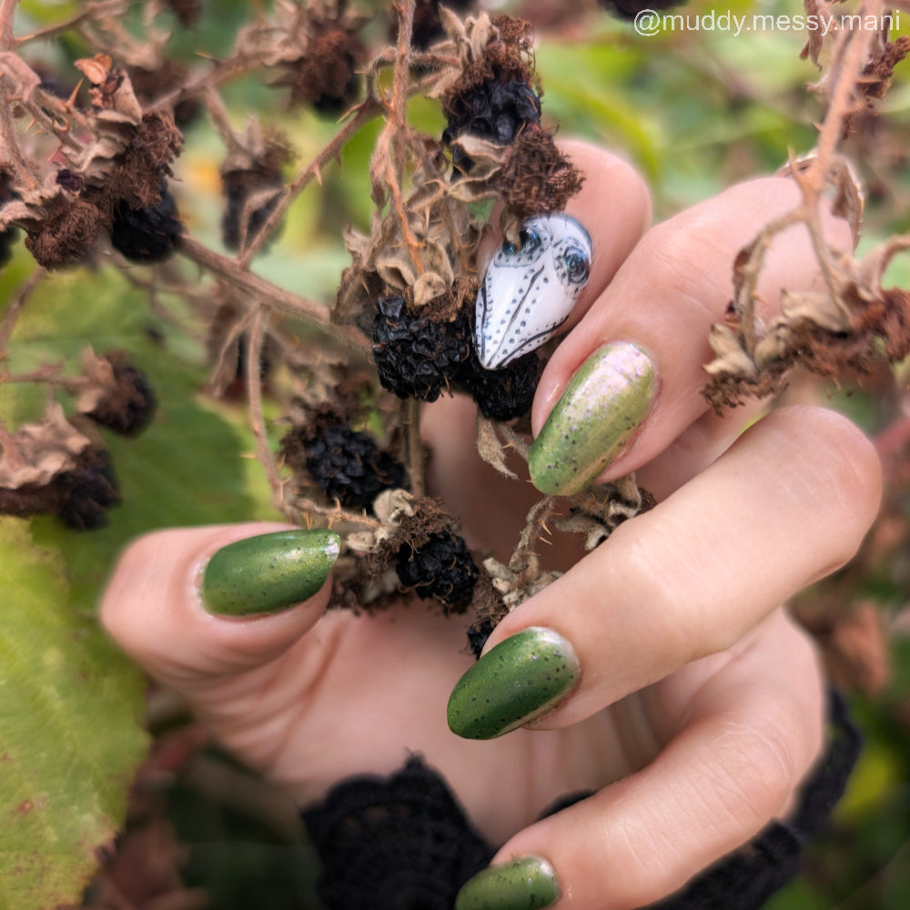 Miasma has an olive green base, sparkling purple-fuchsia shimmer, and tiny black micro shred glitters. Glitter may settle at the bottom of the bottle. Shake well or leave upside down 2-3 minutes before applying.