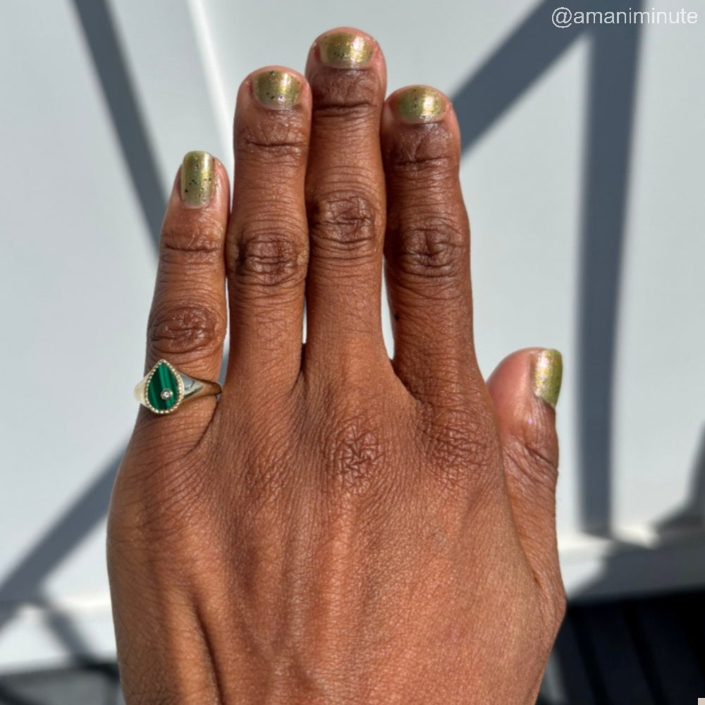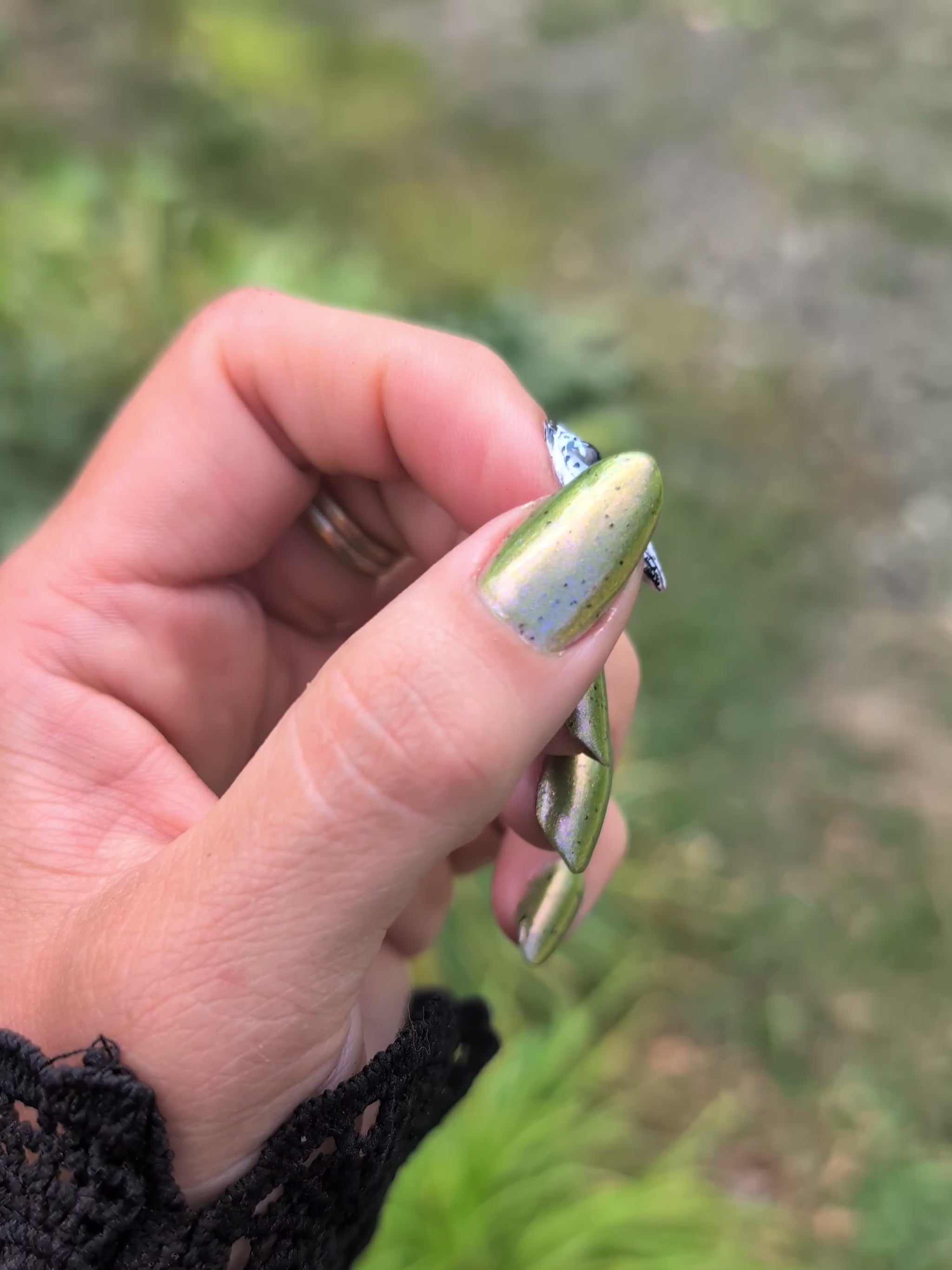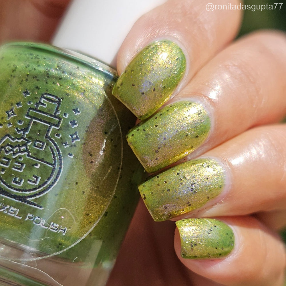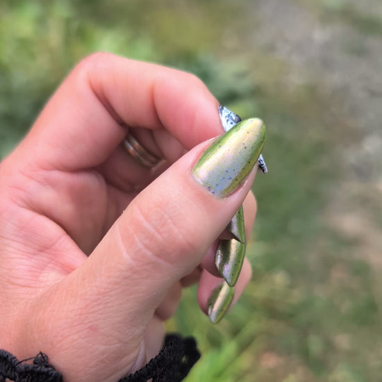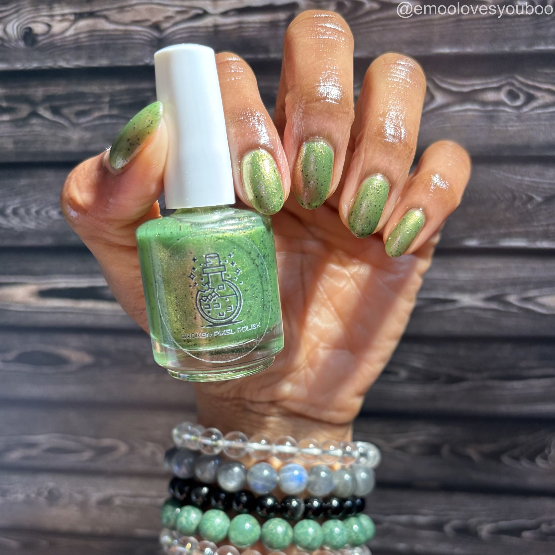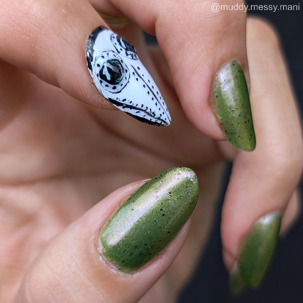Miasma has an olive green base, sparkling purple-fuchsia shimmer, and tiny black micro shred glitters. Glitter may settle at the bottom of the bottle. Shake well or leave upside down 2-3 minutes before applying.