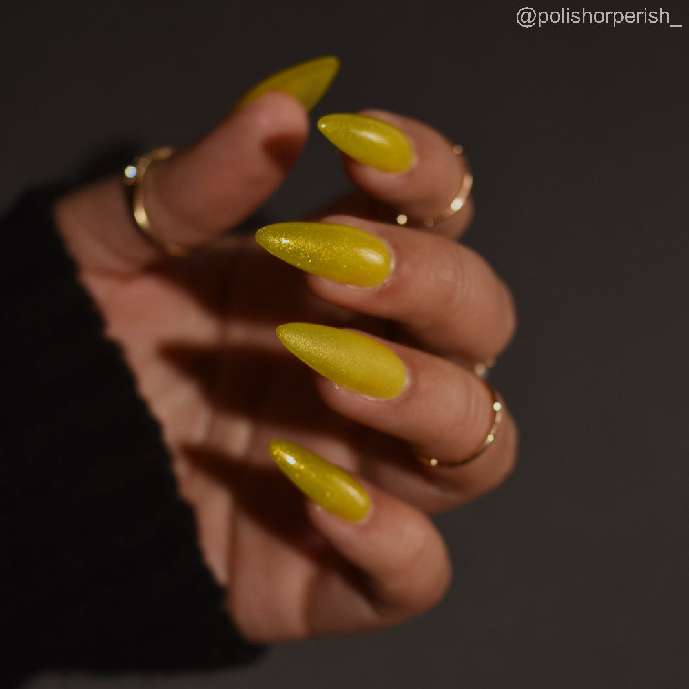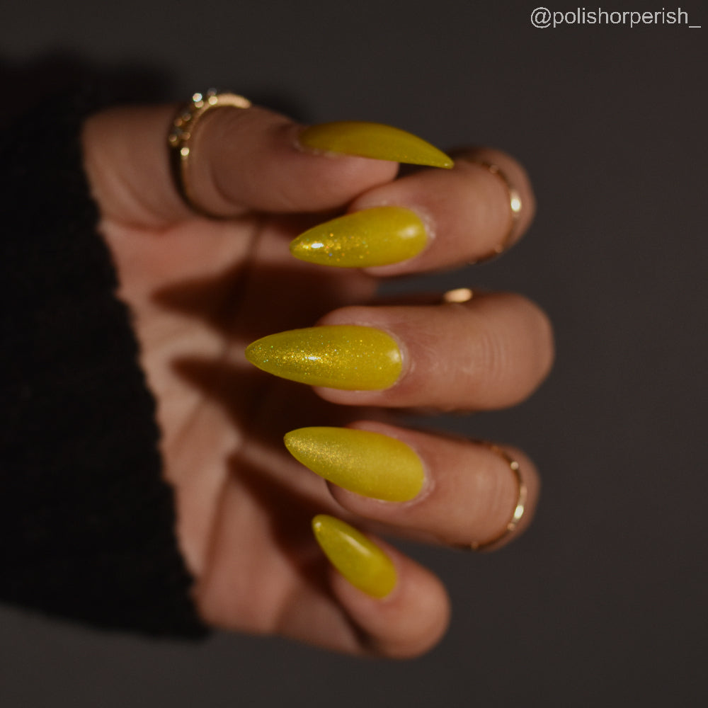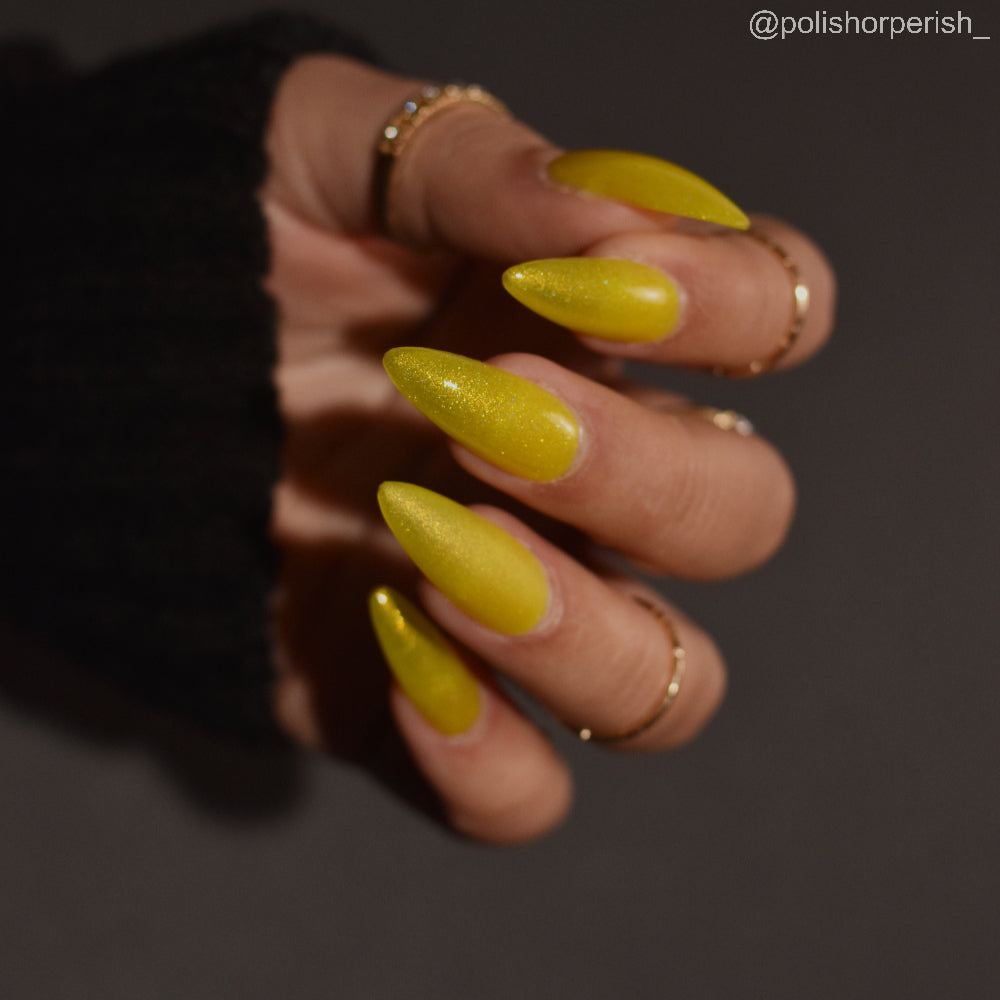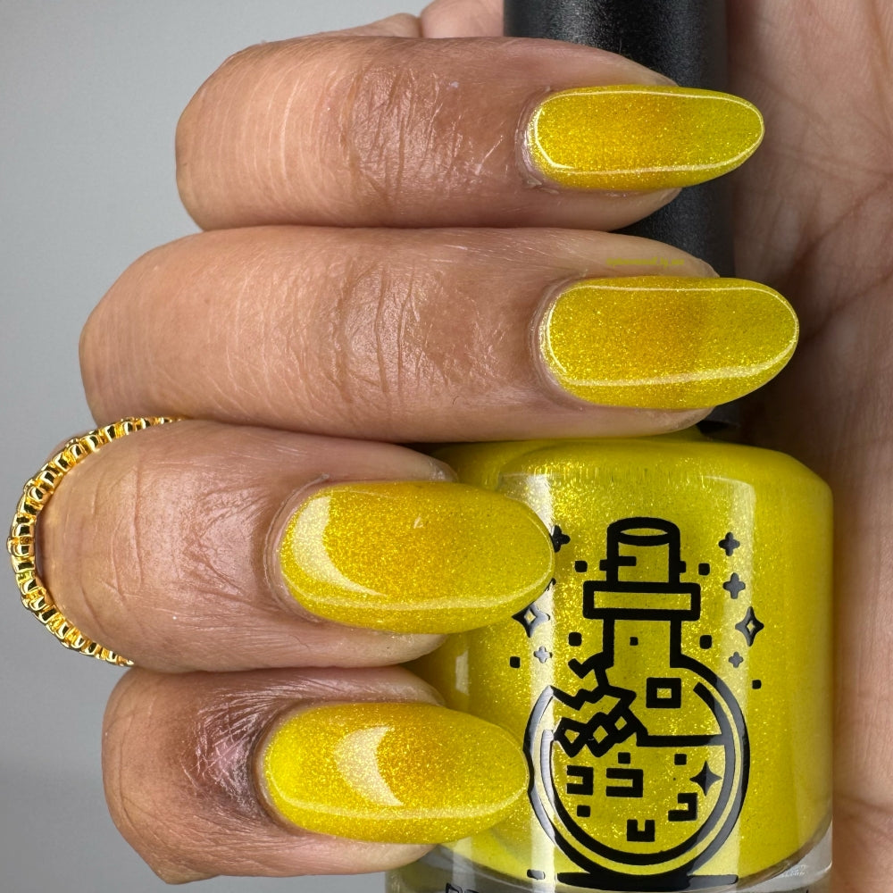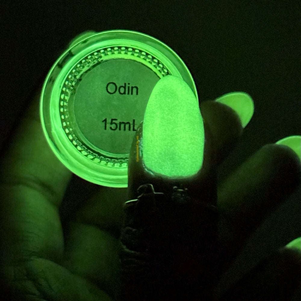 To mimic Odin’s eyes, this is a sunny yellow polish with gold shimmer, a dusting of holo, and glows yellow-green in the dark. Polish is slightly sheer; depending on nail length, you may have visible nail line. Use a blurring base coat at your discretion.