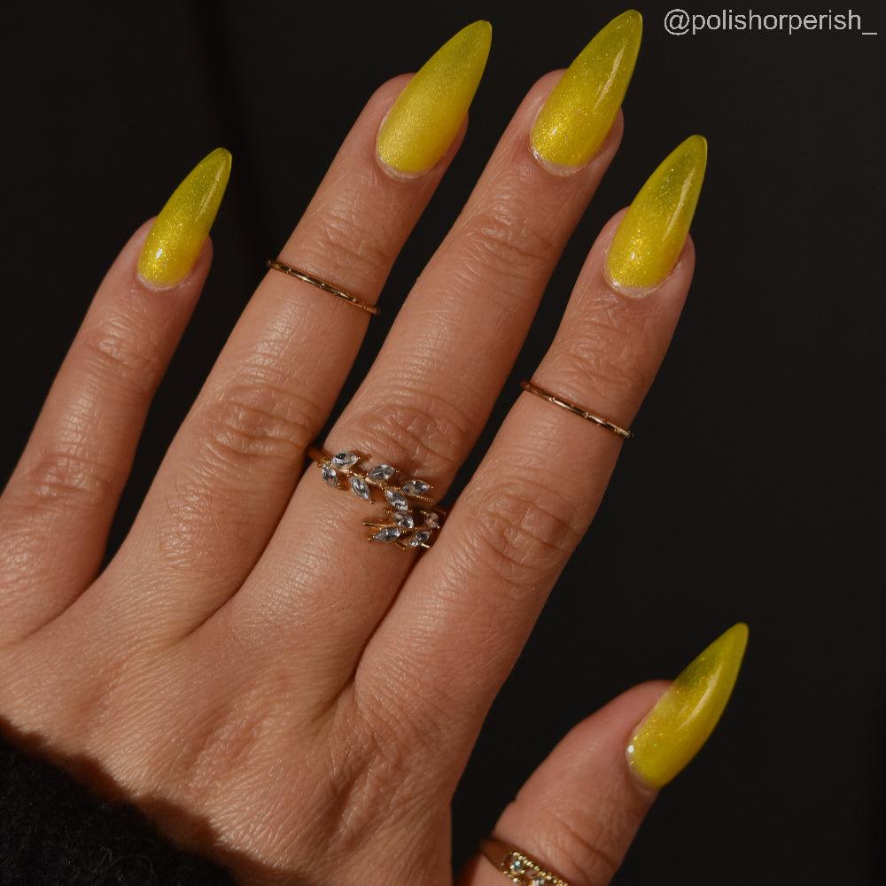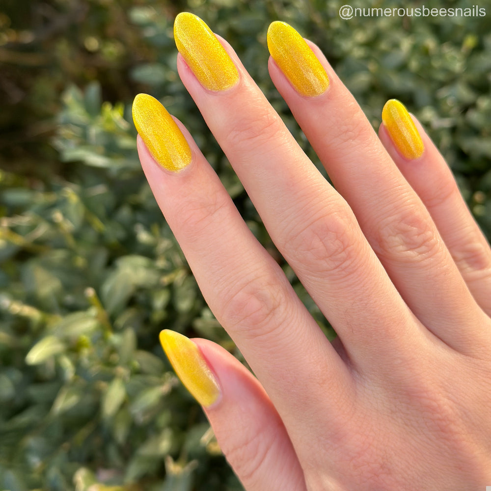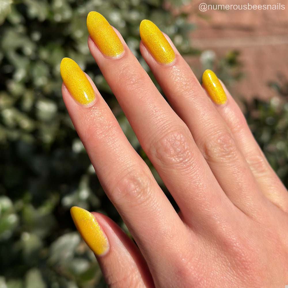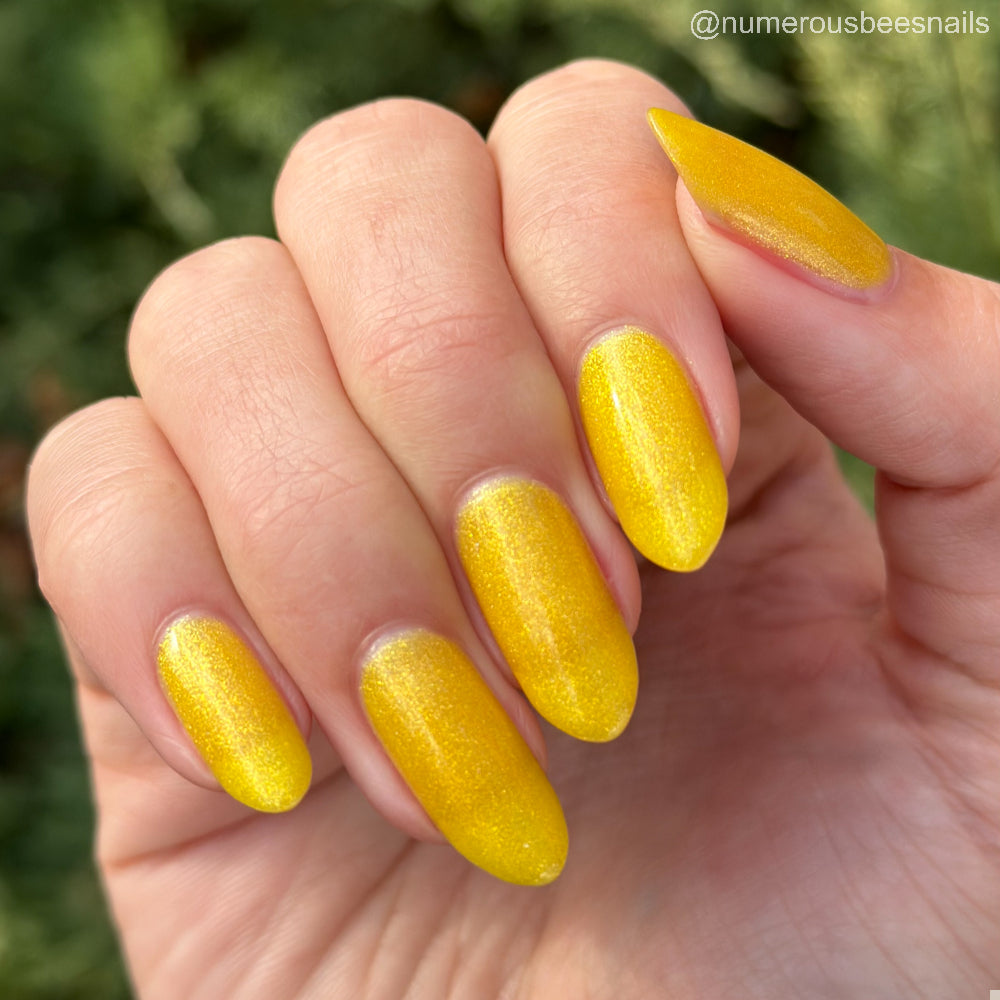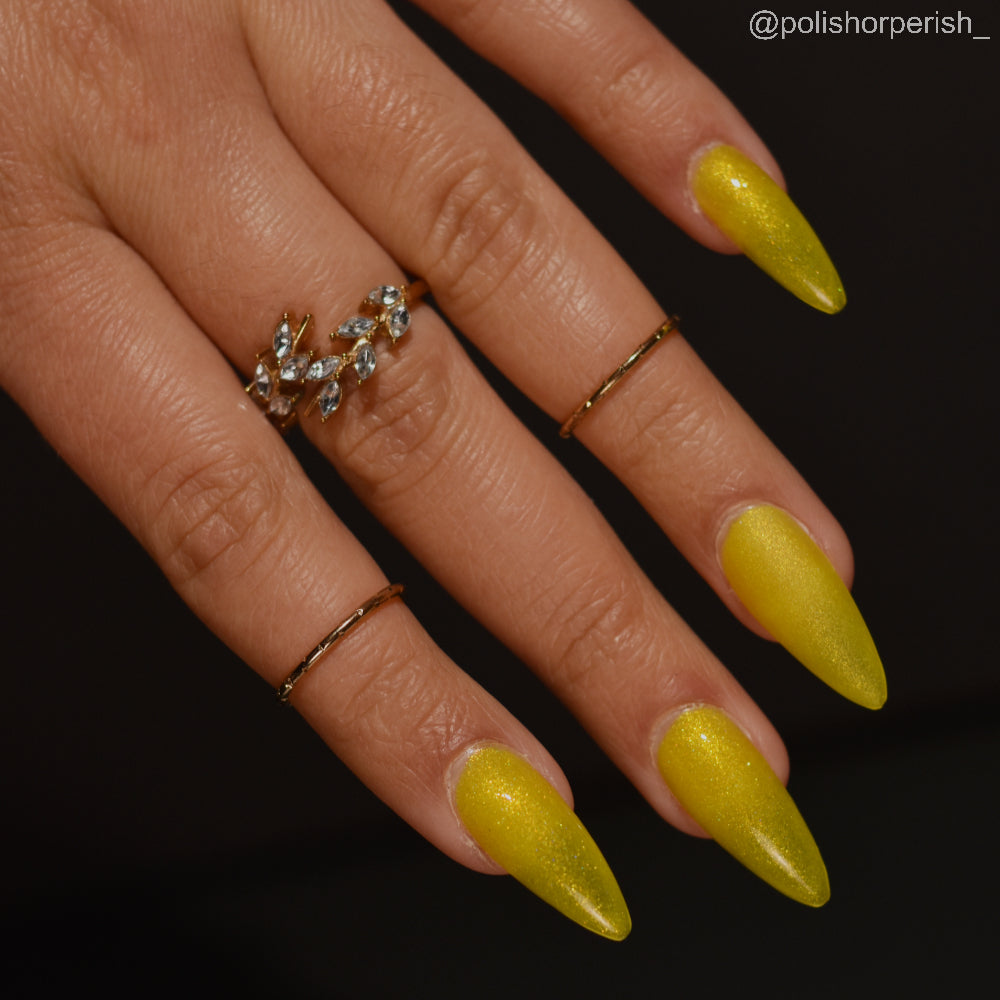 To mimic Odin’s eyes, this is a sunny yellow polish with gold shimmer, a dusting of holo, and glows yellow-green in the dark. Polish is slightly sheer; depending on nail length, you may have visible nail line. Use a blurring base coat at your discretion.