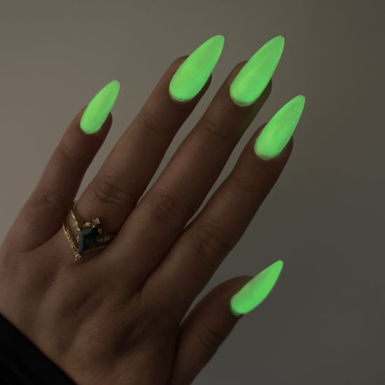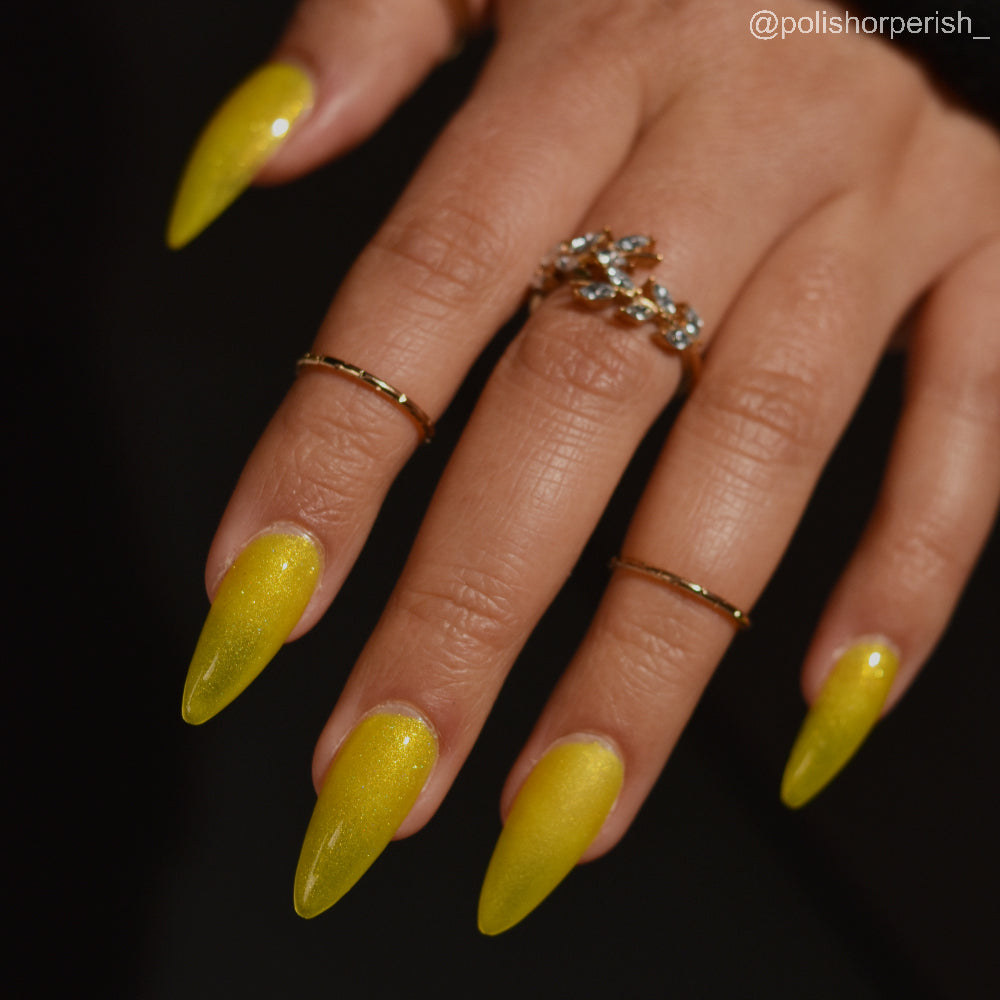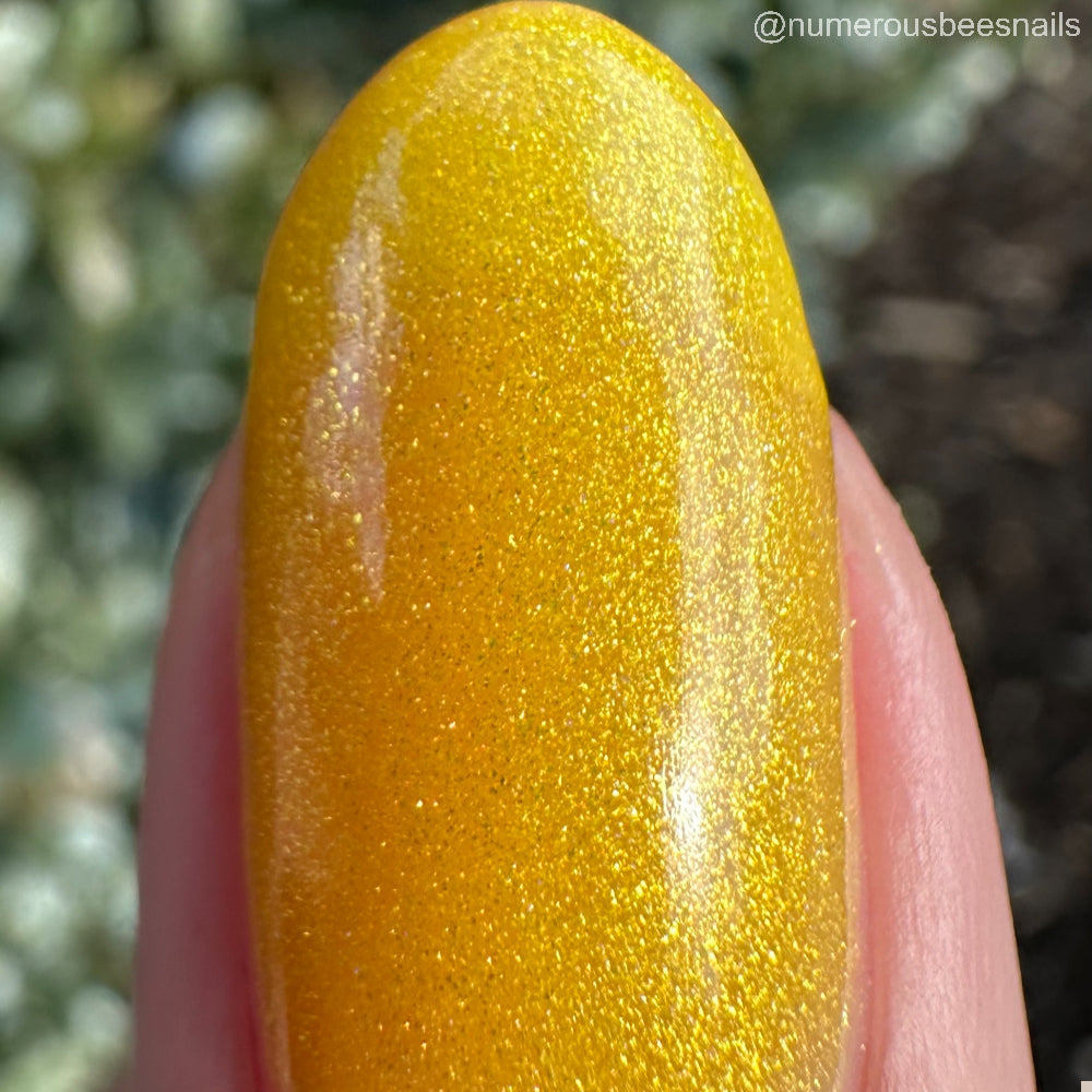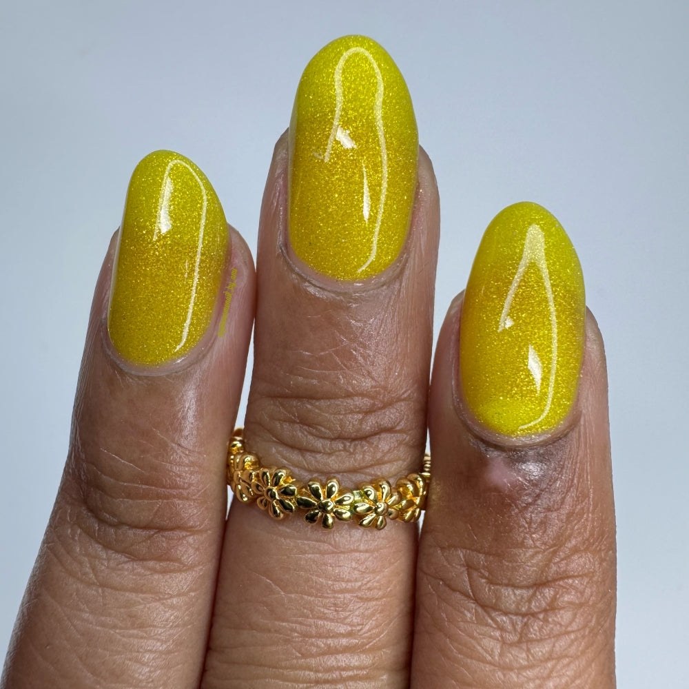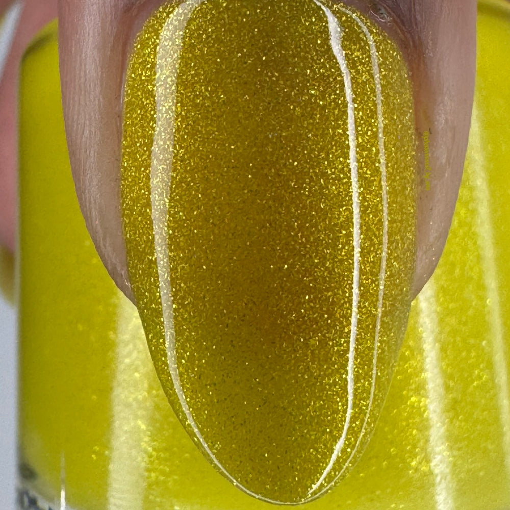 To mimic Odin’s eyes, this is a sunny yellow polish with gold shimmer, a dusting of holo, and glows yellow-green in the dark. Polish is slightly sheer; depending on nail length, you may have visible nail line. Use a blurring base coat at your discretion.