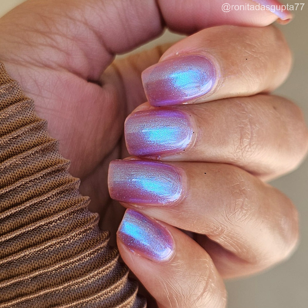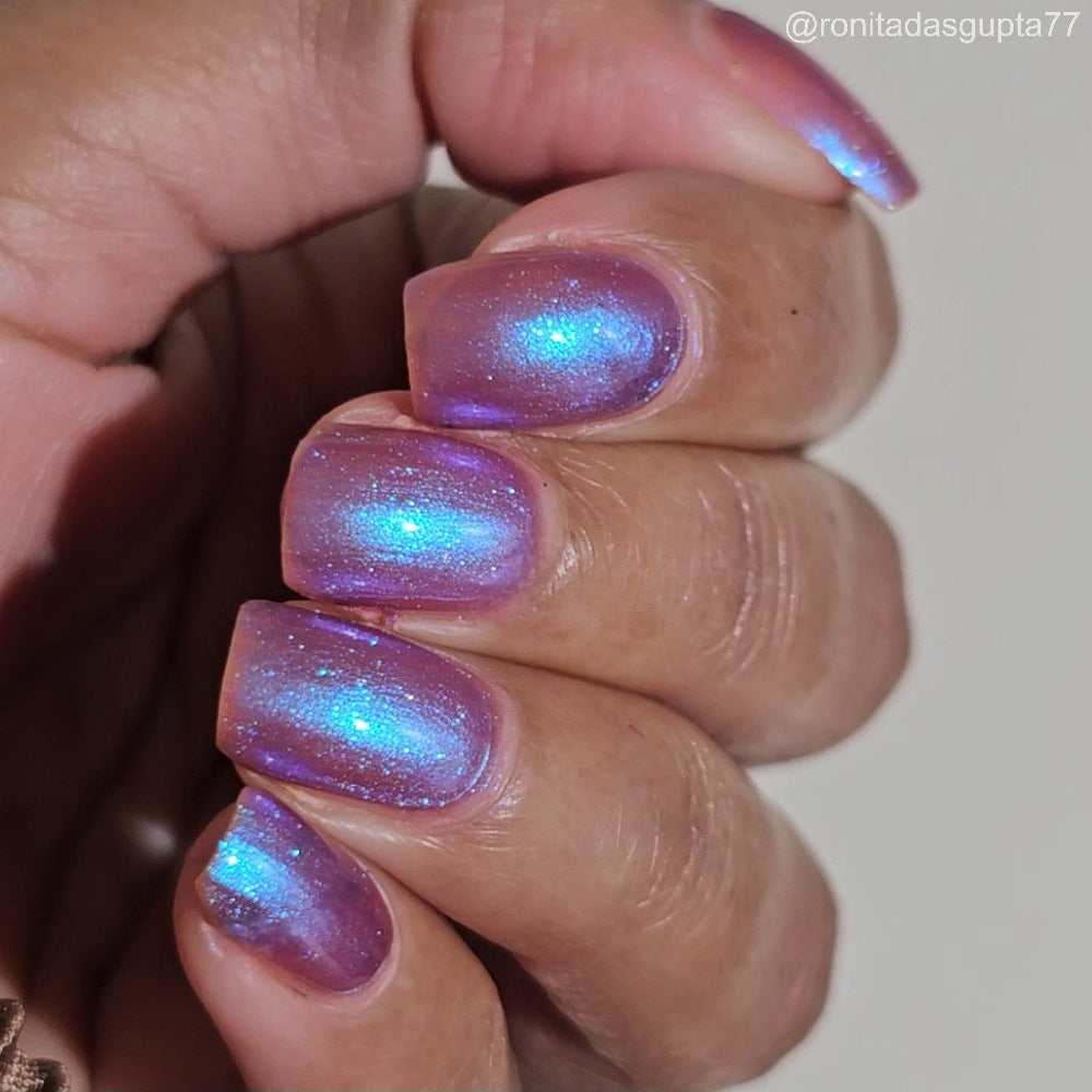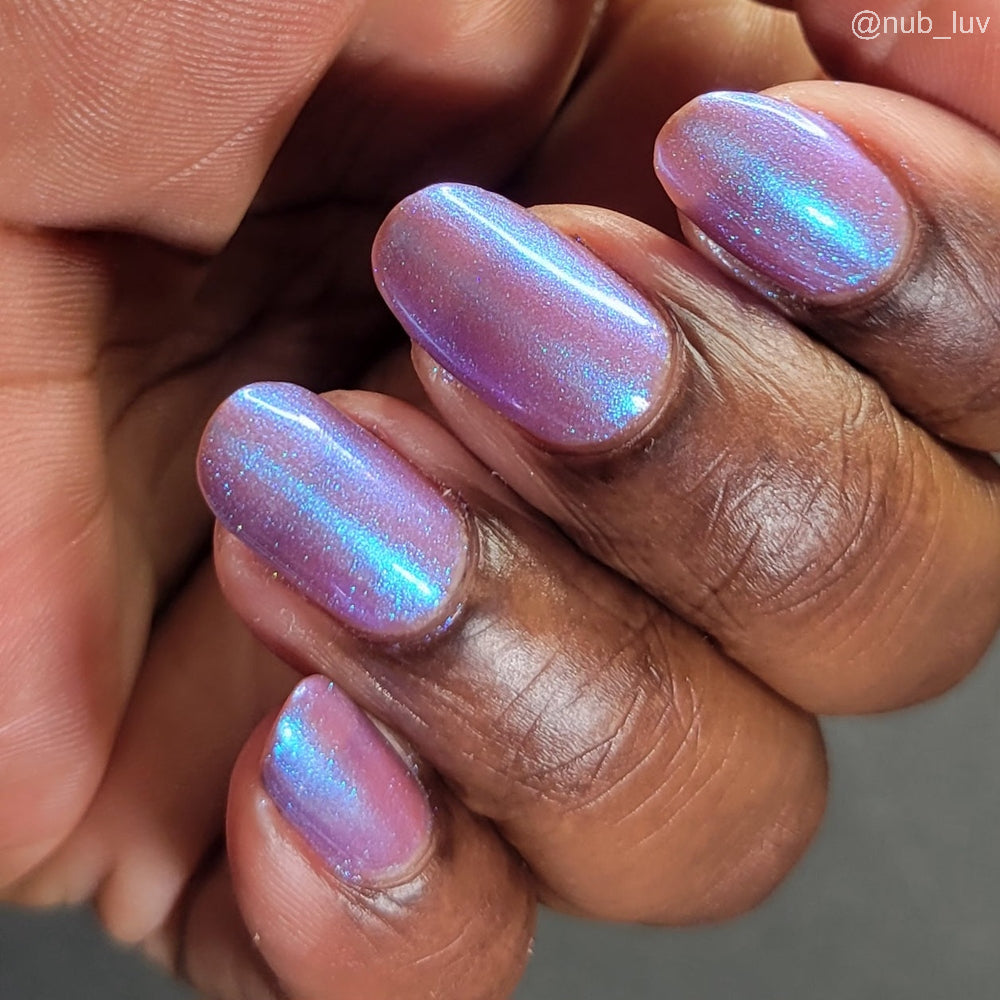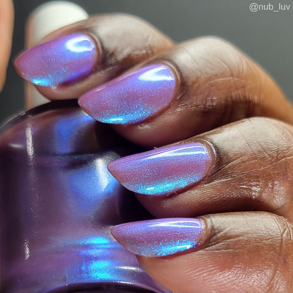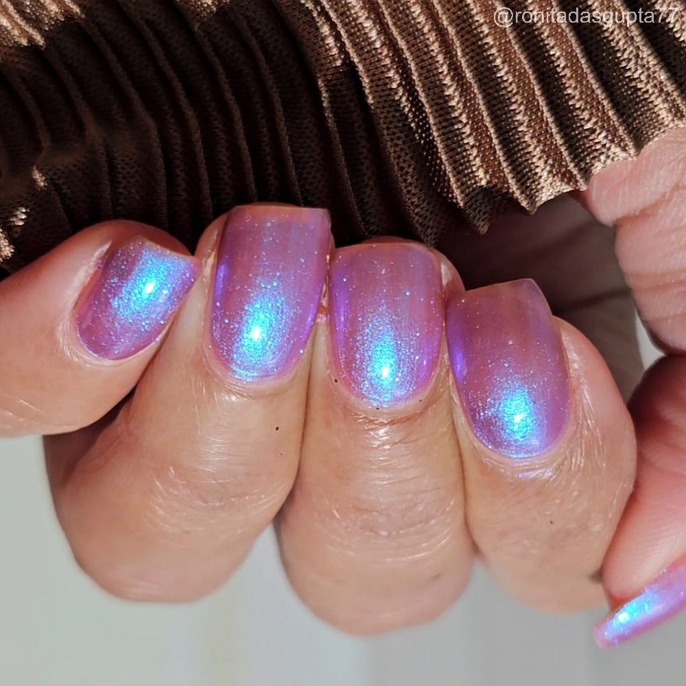 Semi-sheer light purple base with strong electric blue shimmer.