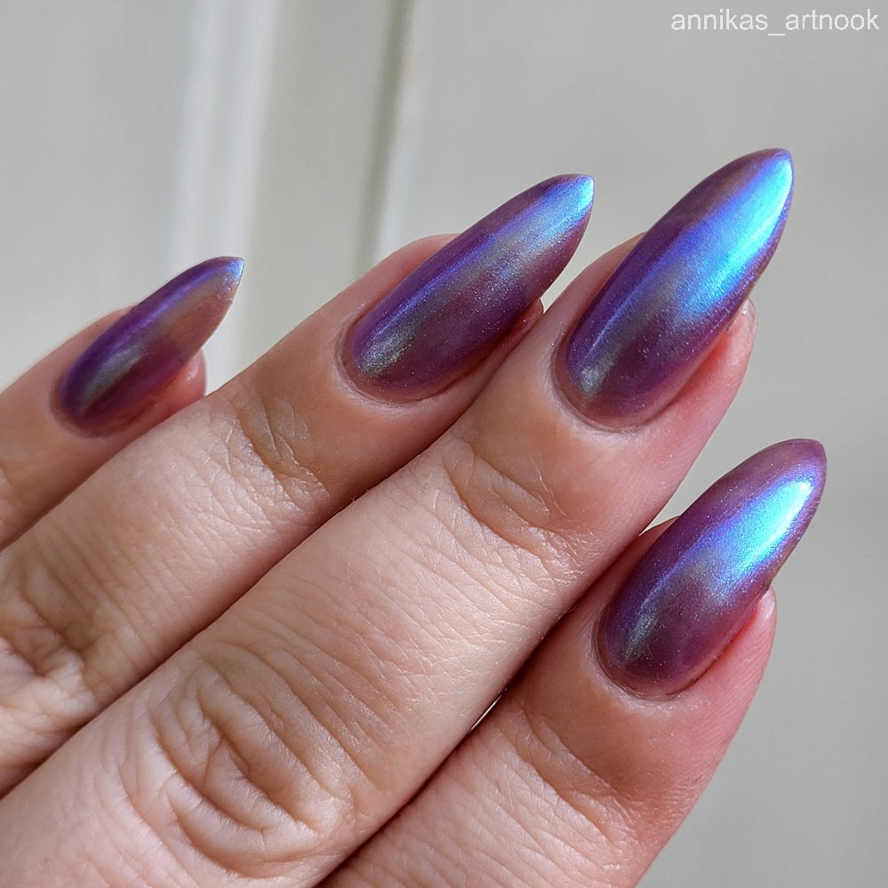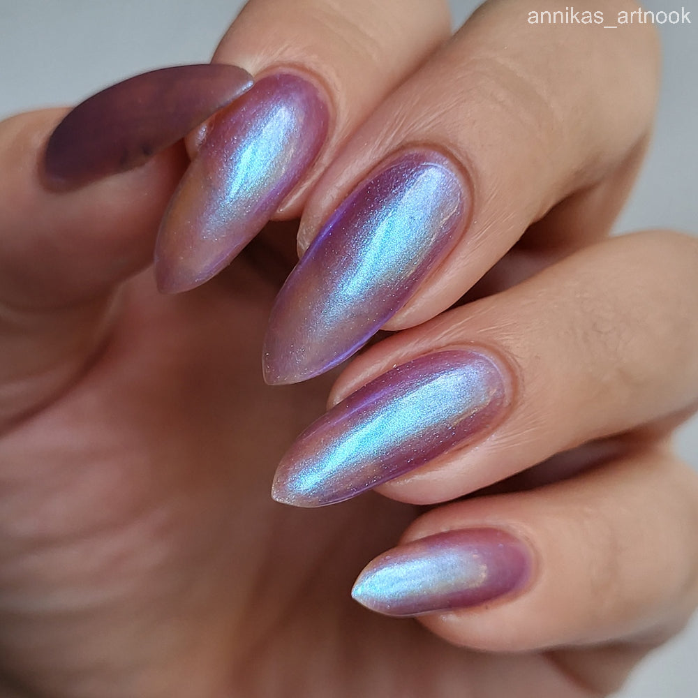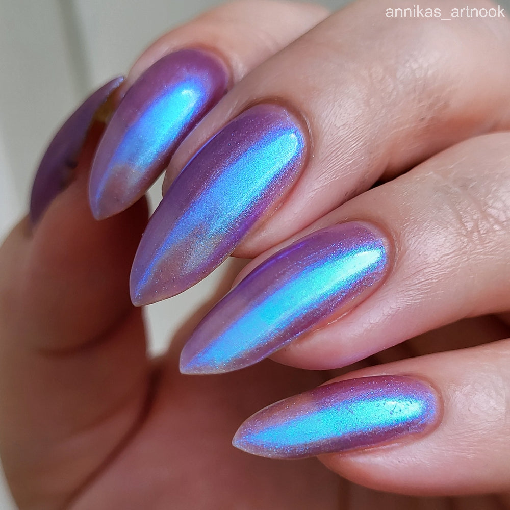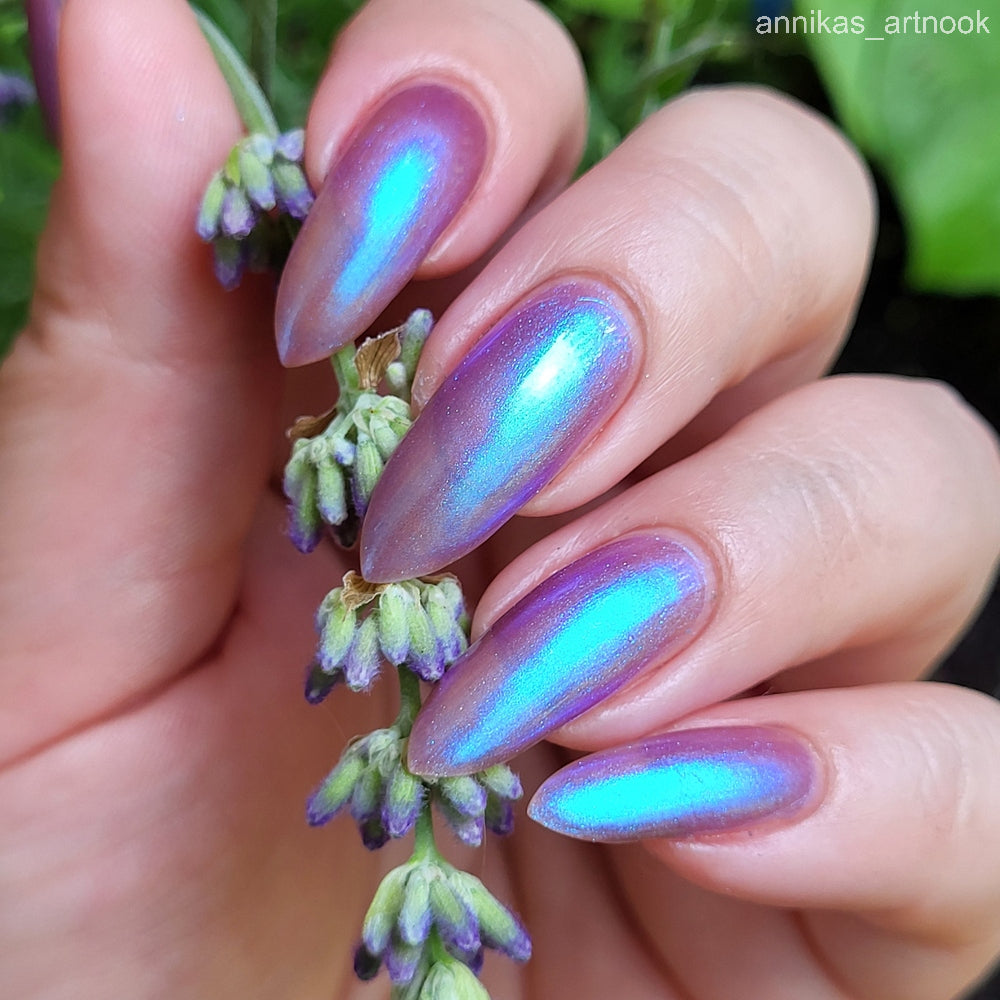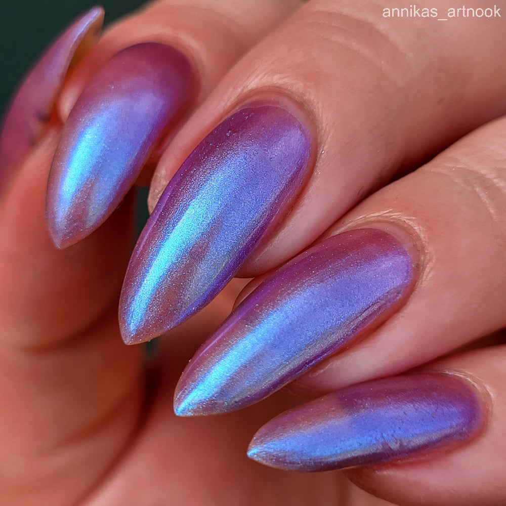 Semi-sheer light purple base with strong electric blue shimmer.