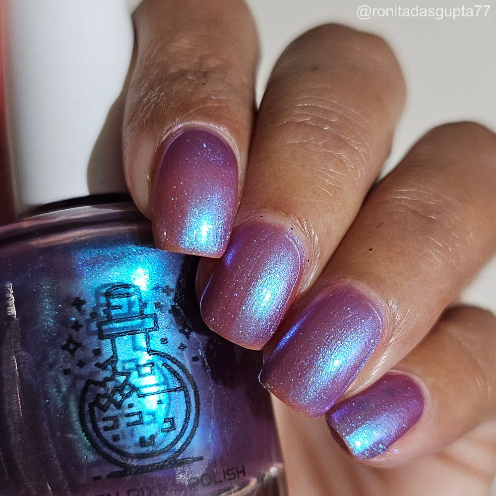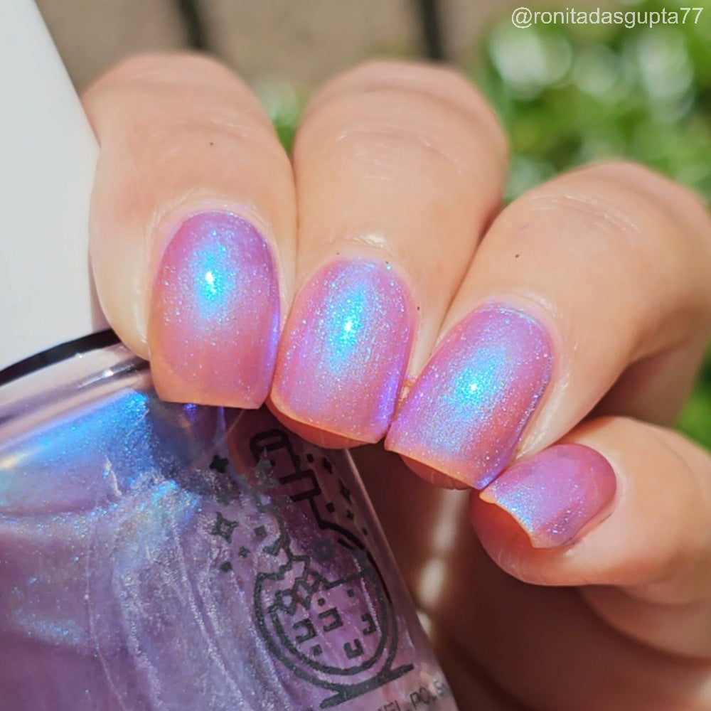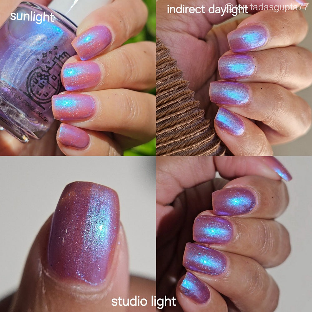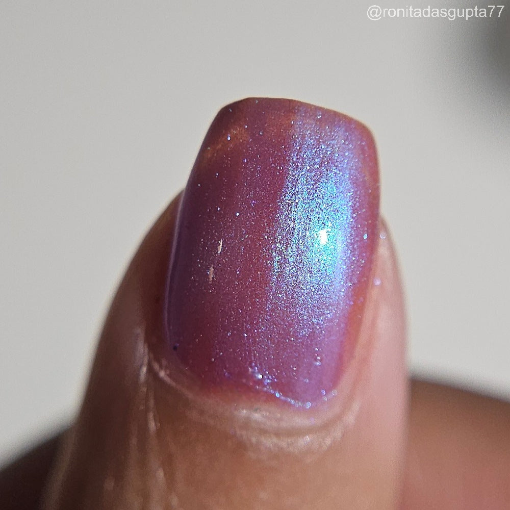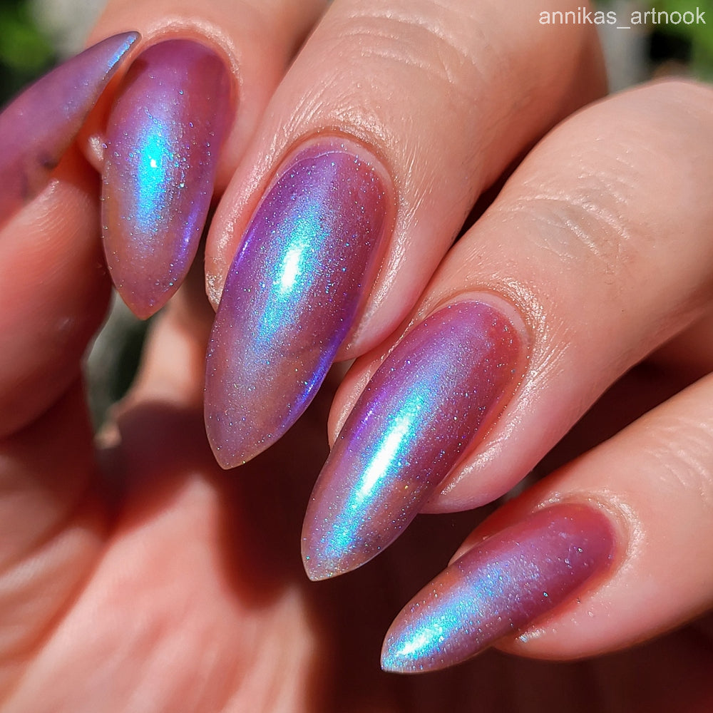 Semi-sheer light purple base with strong electric blue shimmer.