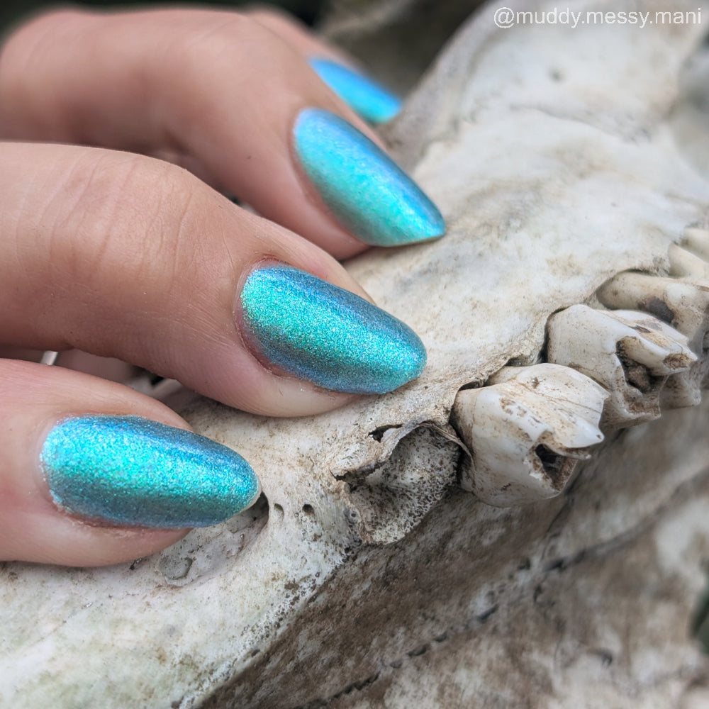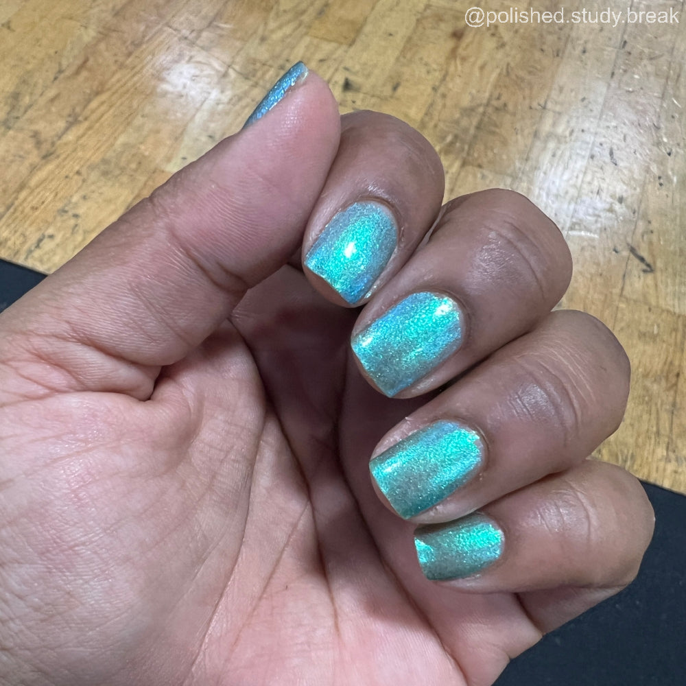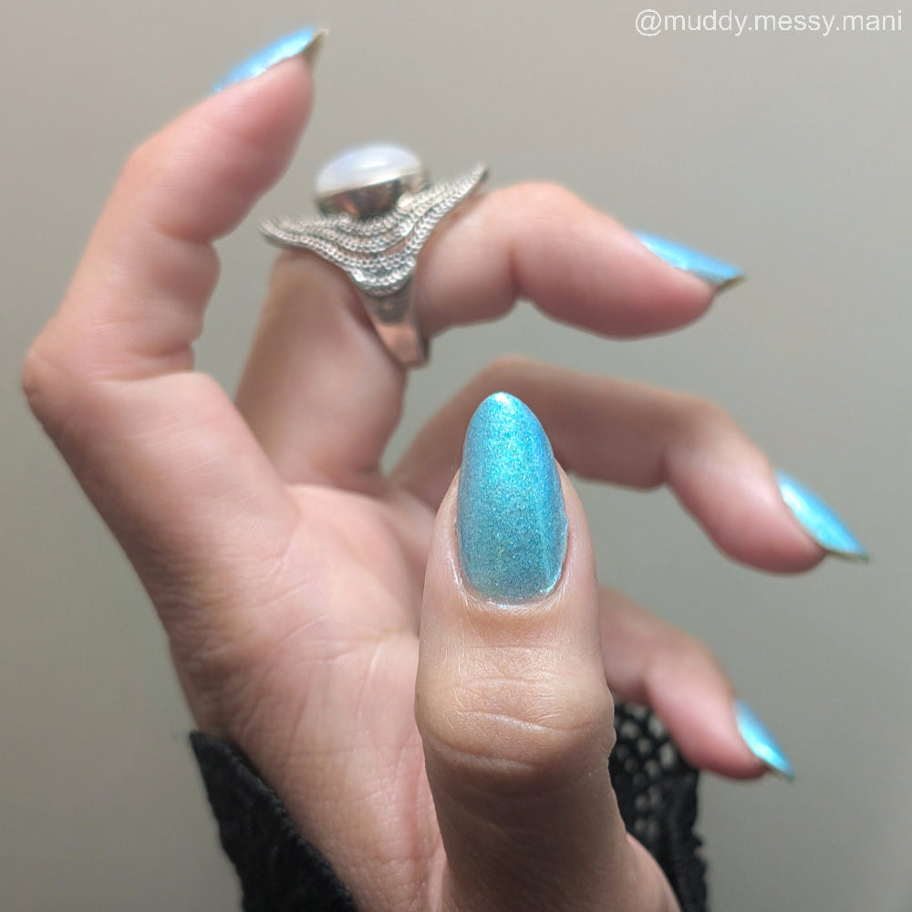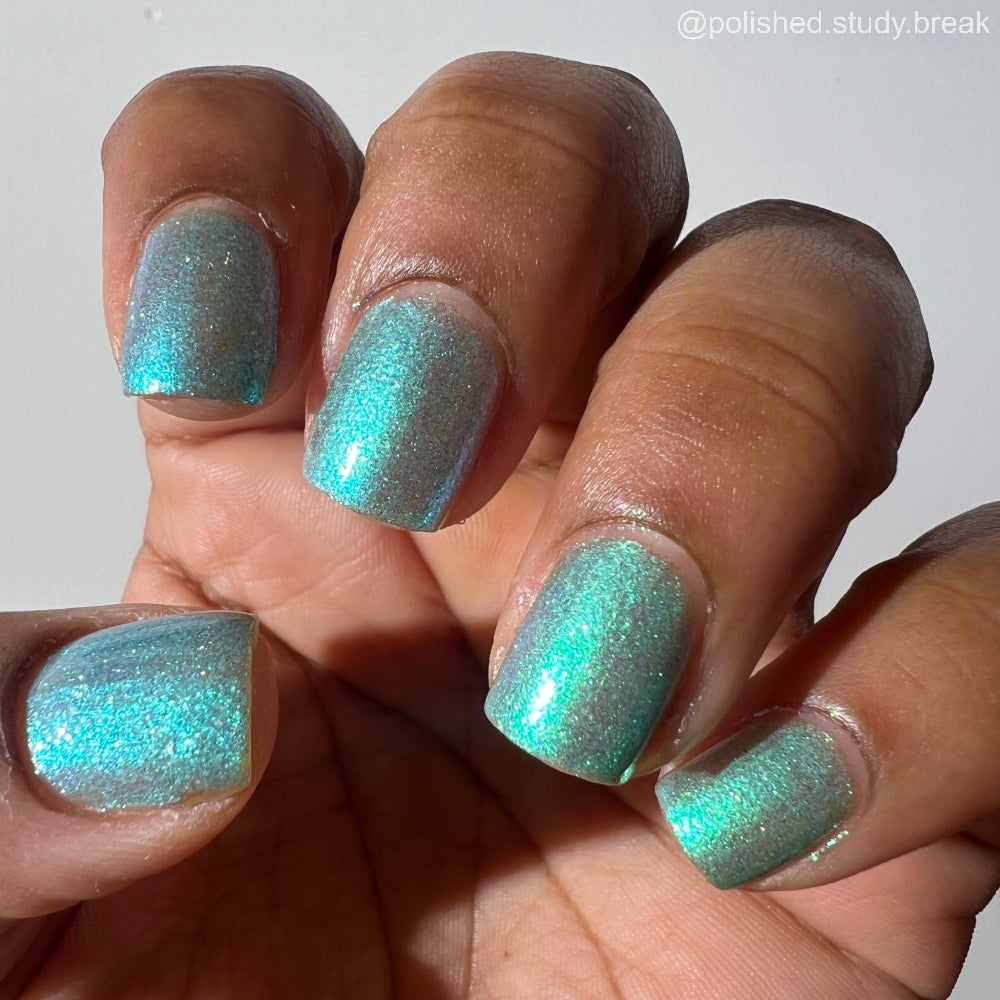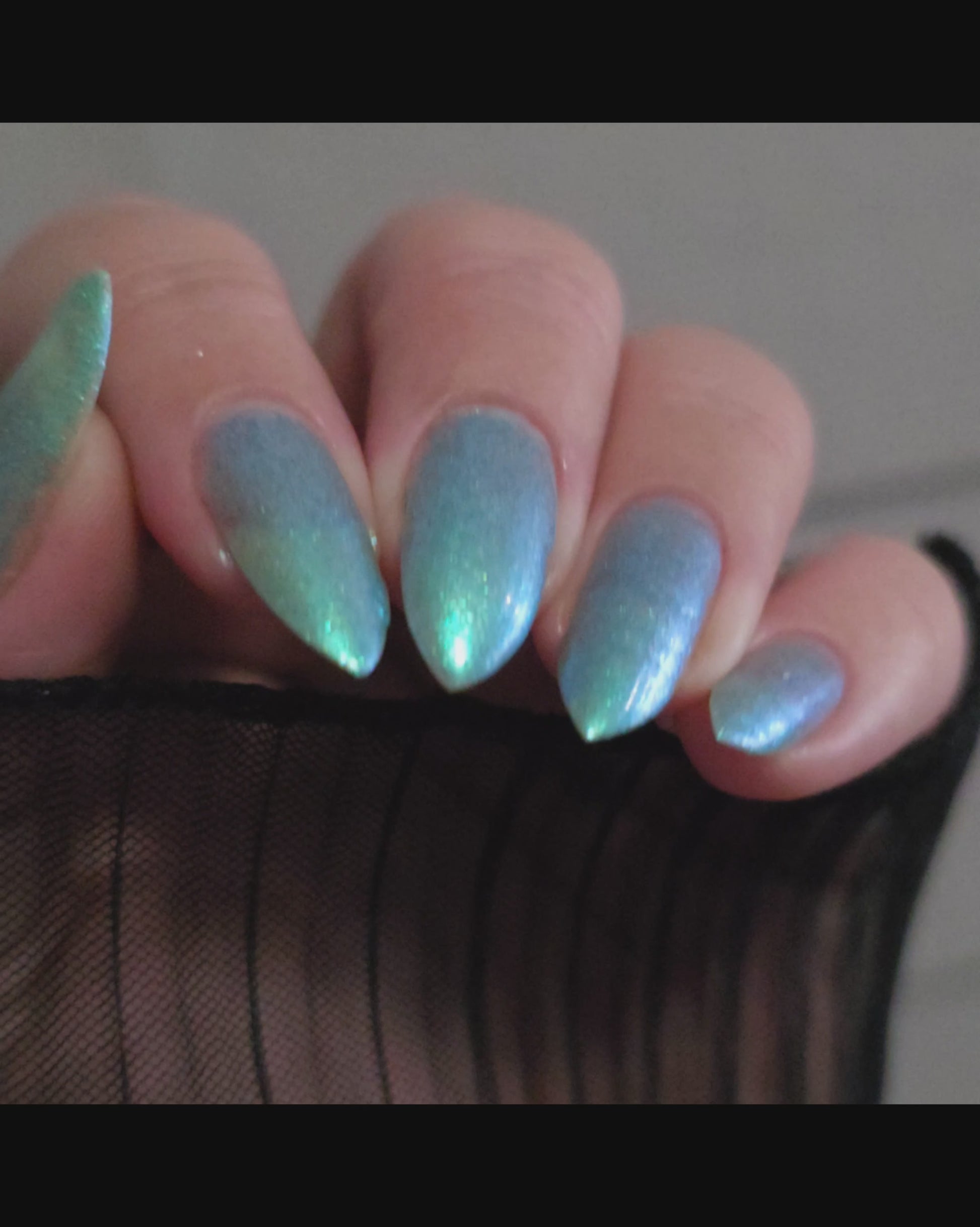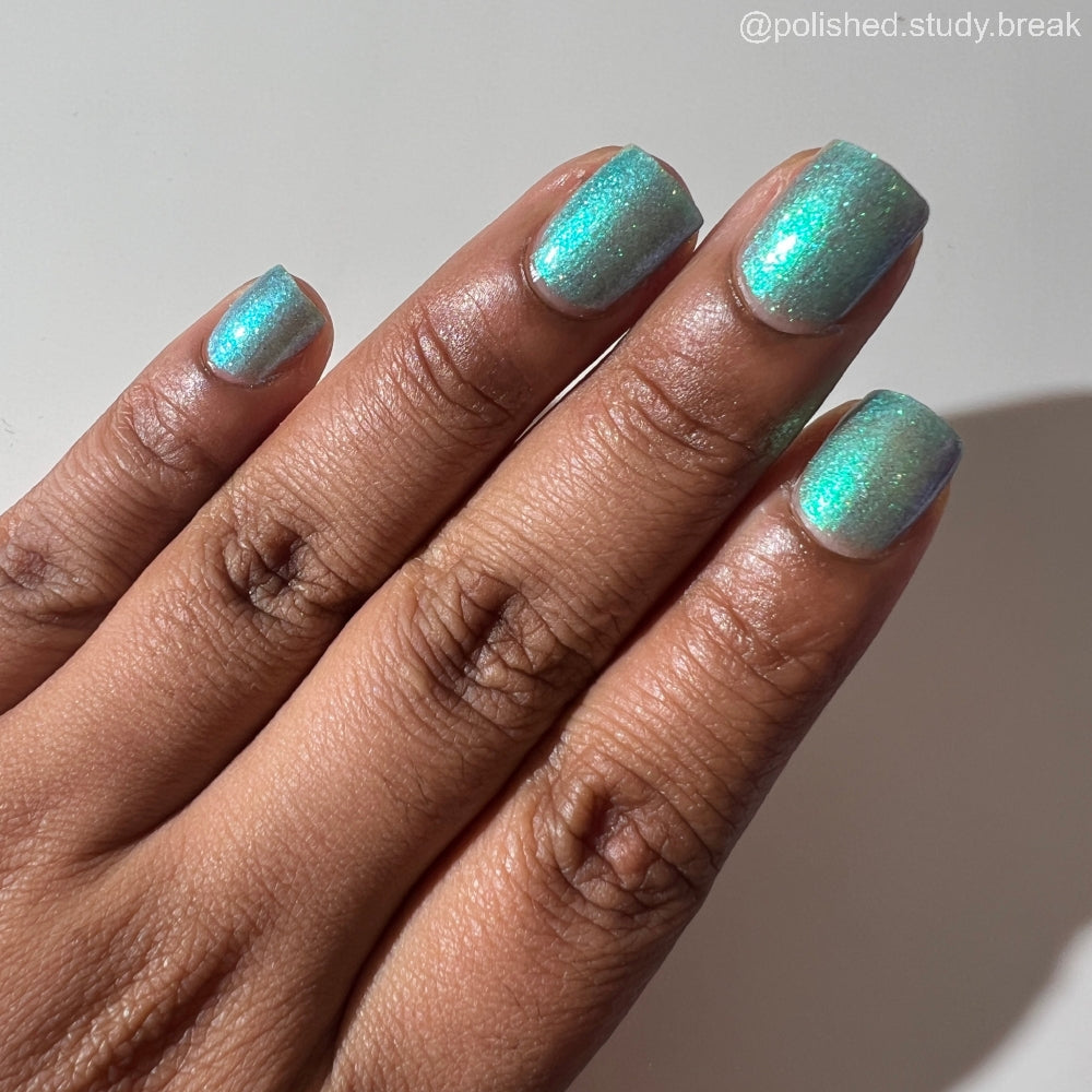 Phlegmatic has an aqua base with shimmering blue and green micro flakes and blue-green metallic-like shifting shimmer. The flakes may settle at the bottom of the bottle. Shake well or leave upside down for 2-3 minutes before applying.