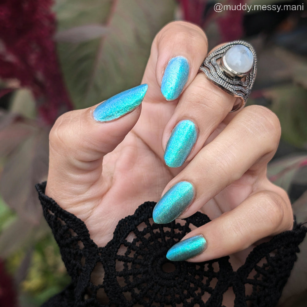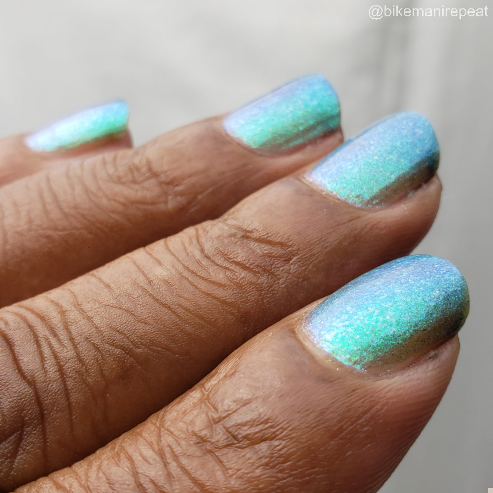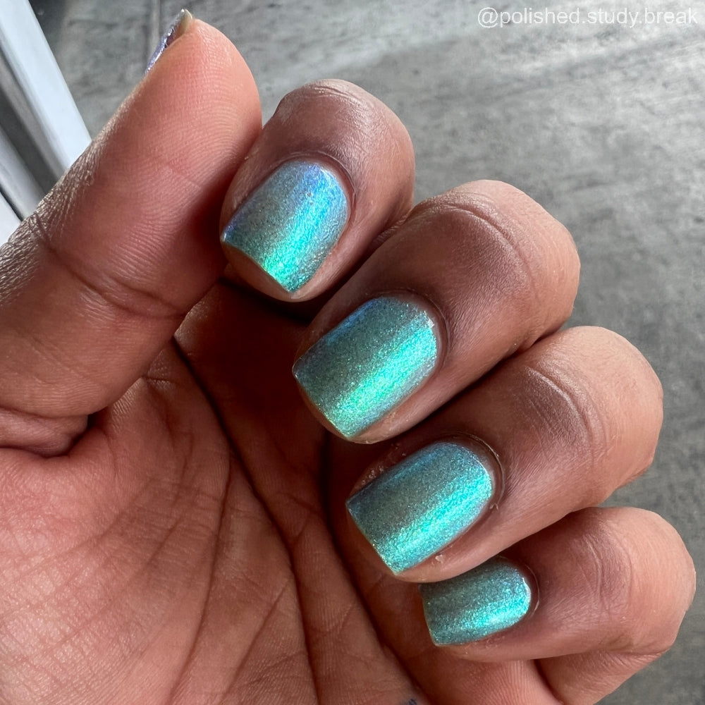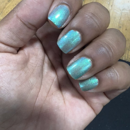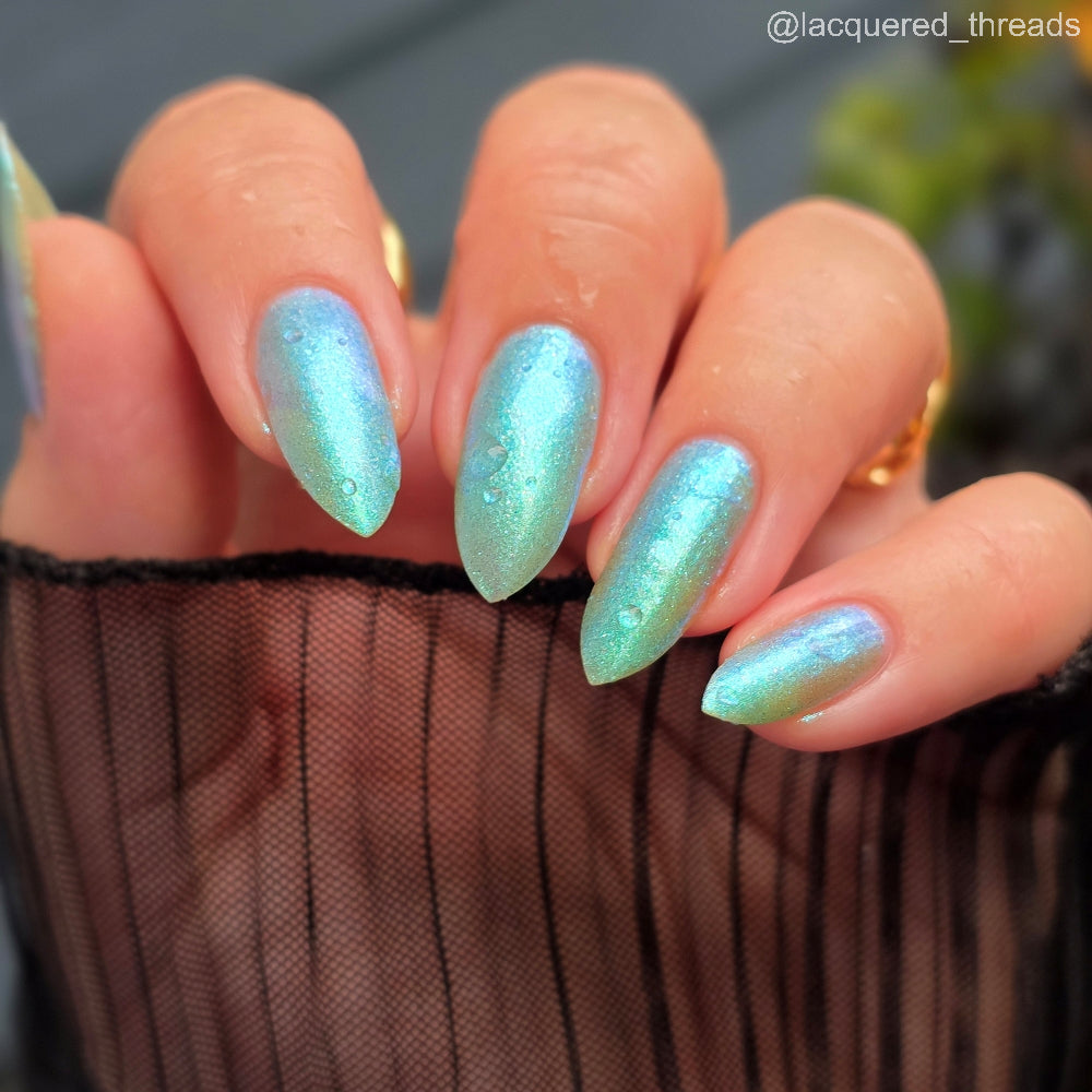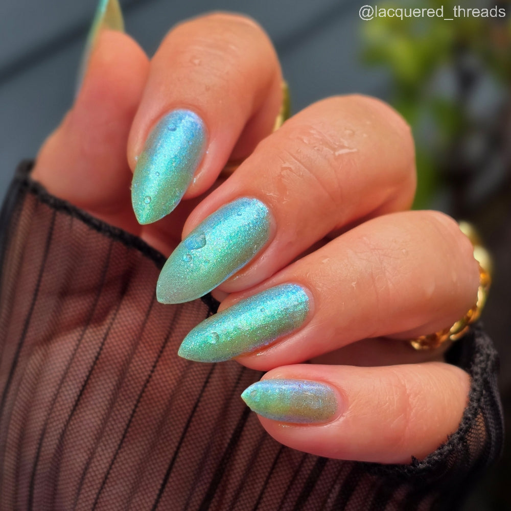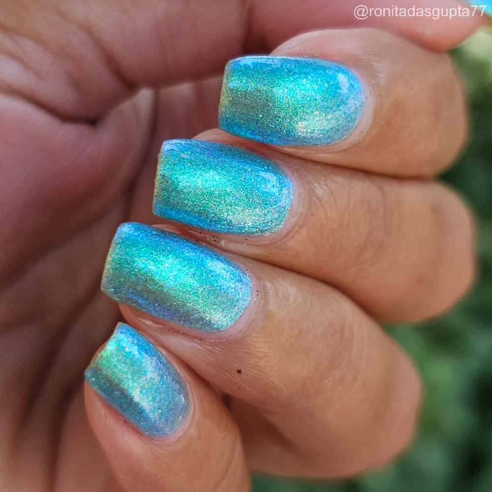 Phlegmatic has an aqua base with shimmering blue and green micro flakes and blue-green metallic-like shifting shimmer. The flakes may settle at the bottom of the bottle. Shake well or leave upside down for 2-3 minutes before applying.