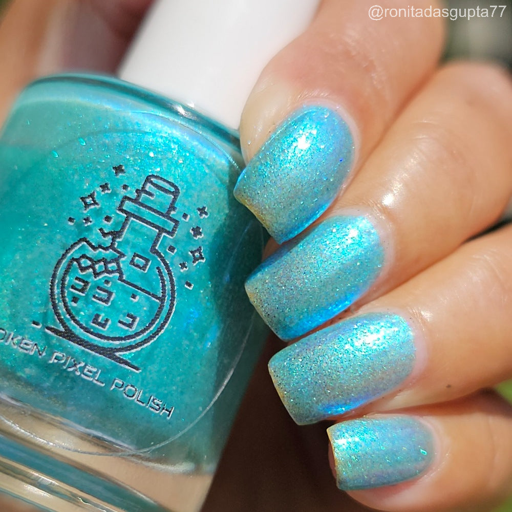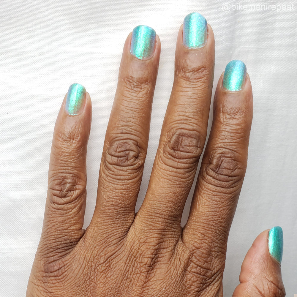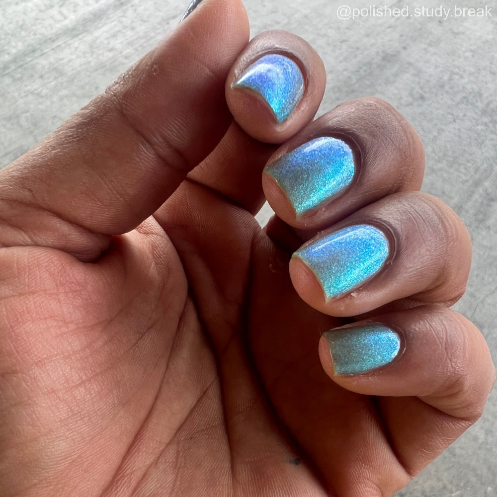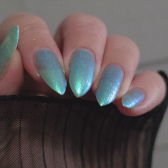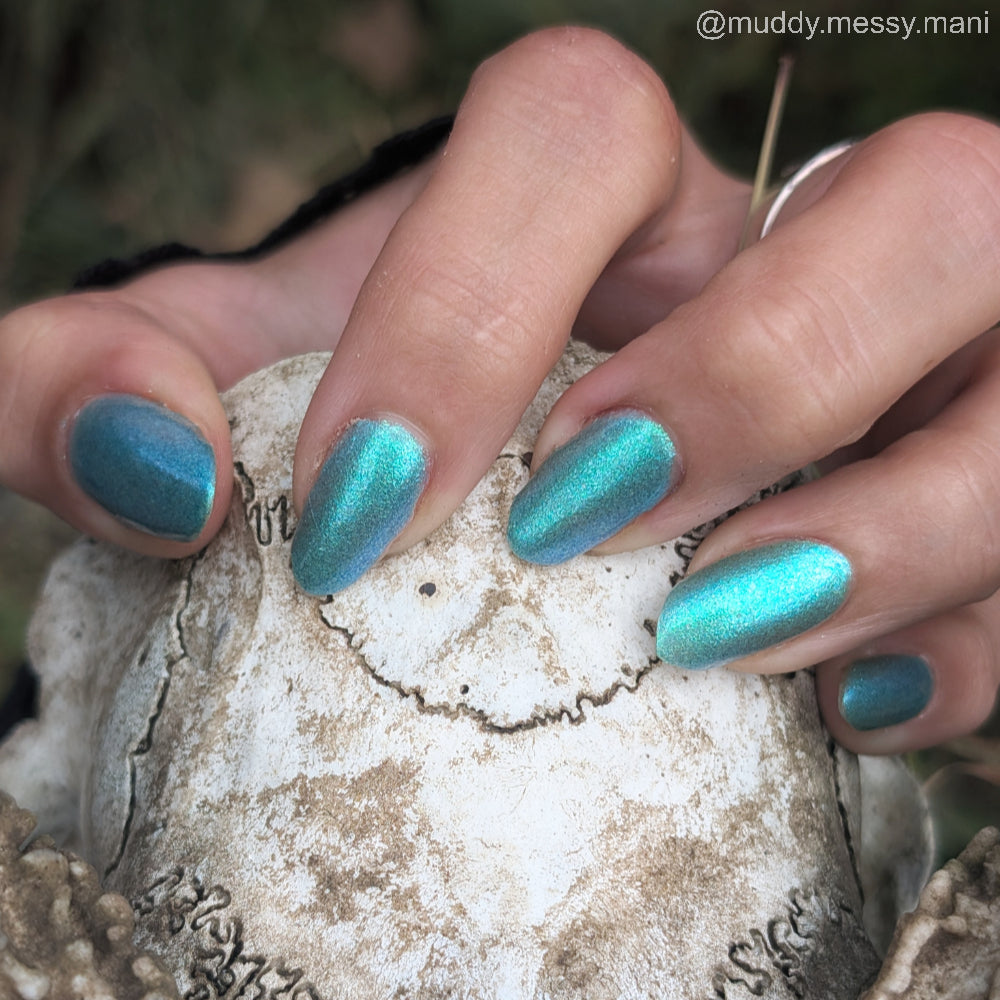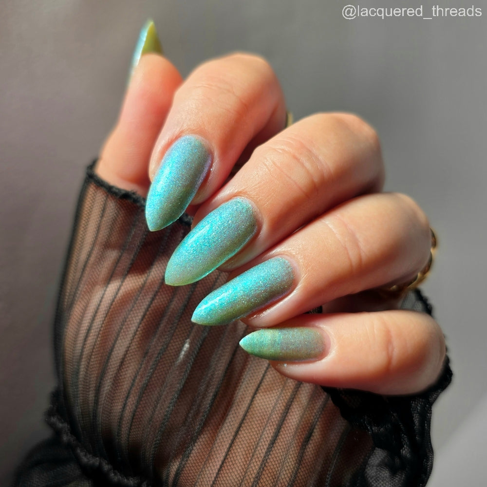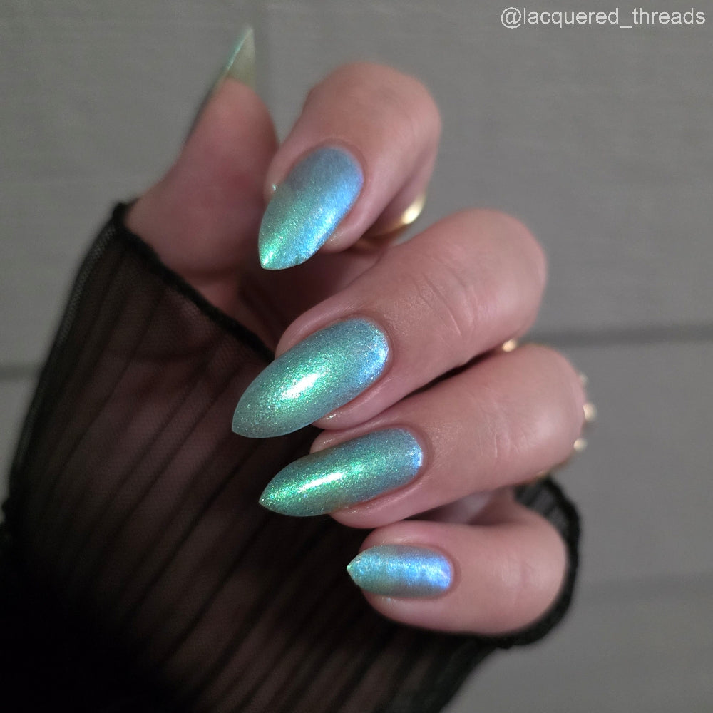 Phlegmatic has an aqua base with shimmering blue and green micro flakes and blue-green metallic-like shifting shimmer. The flakes may settle at the bottom of the bottle. Shake well or leave upside down for 2-3 minutes before applying.
