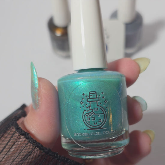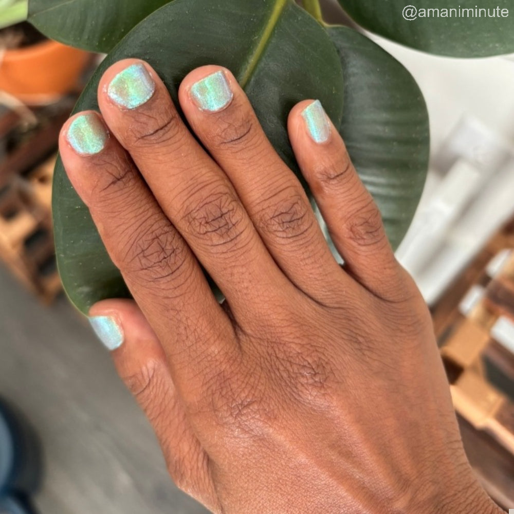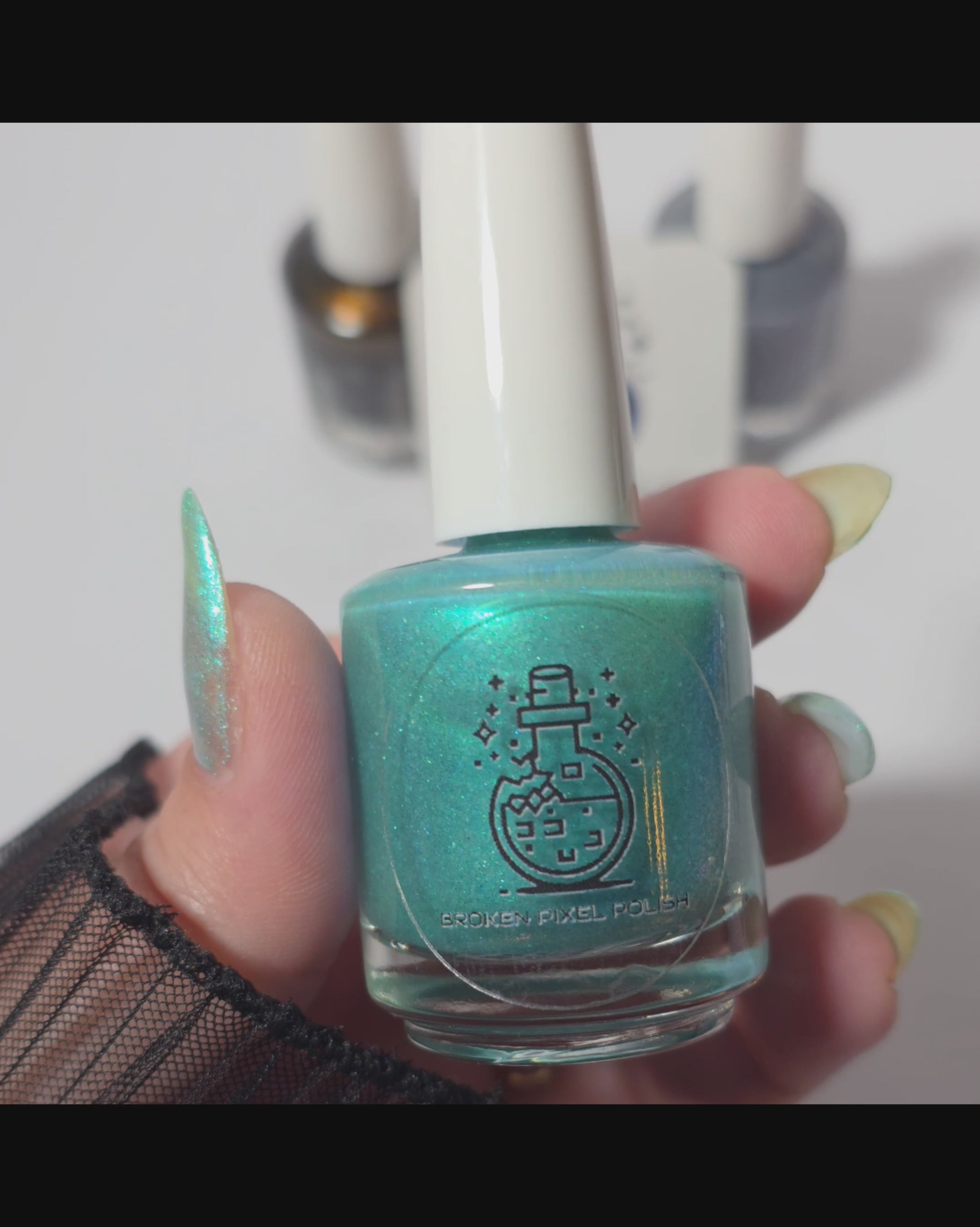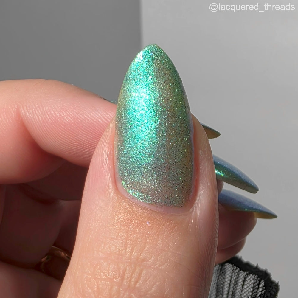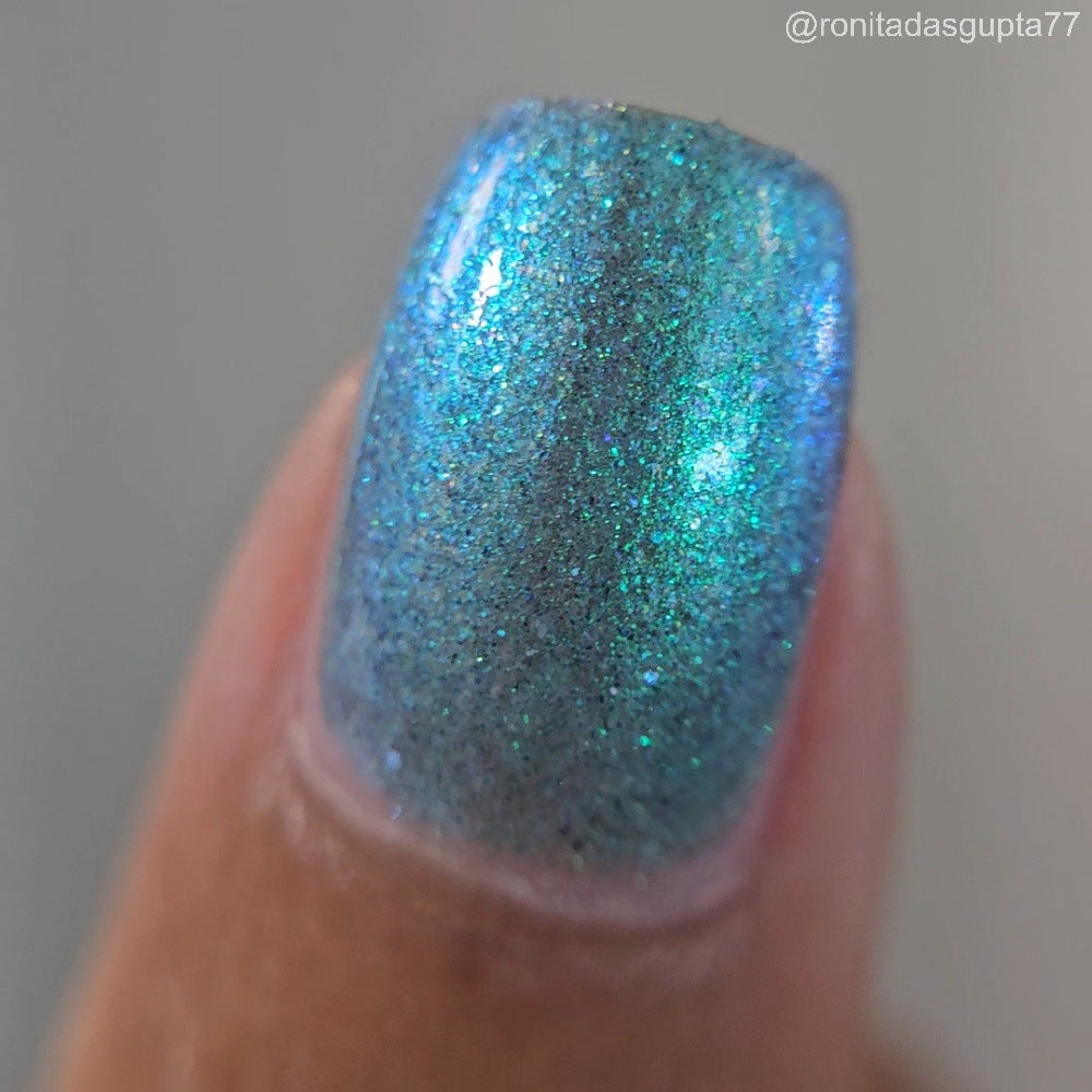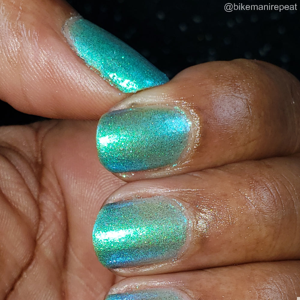 Phlegmatic has an aqua base with shimmering blue and green micro flakes and blue-green metallic-like shifting shimmer. The flakes may settle at the bottom of the bottle. Shake well or leave upside down for 2-3 minutes before applying.