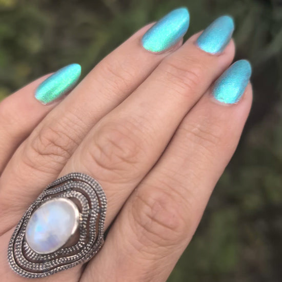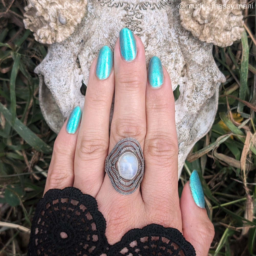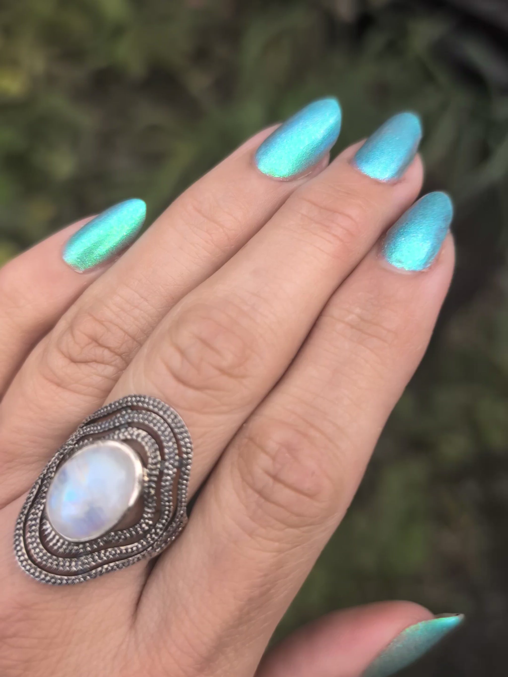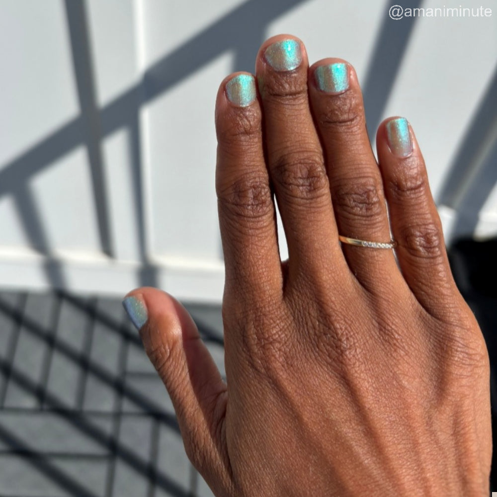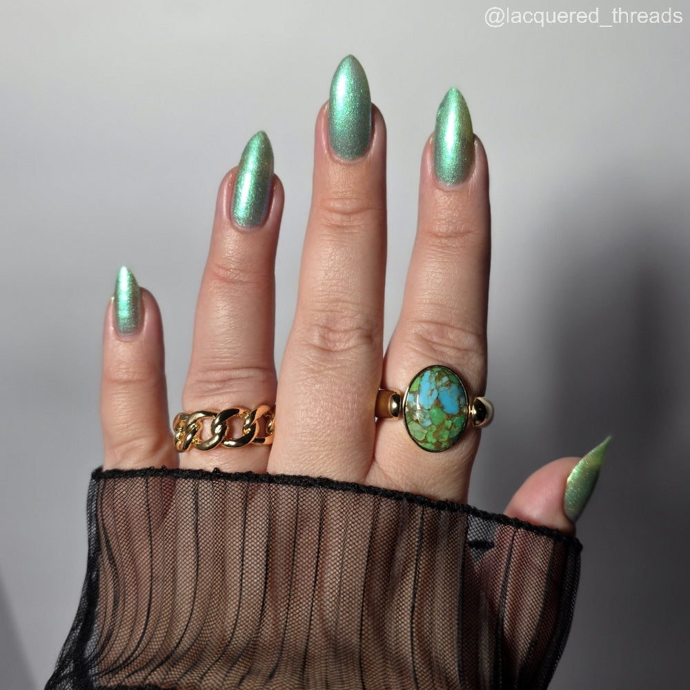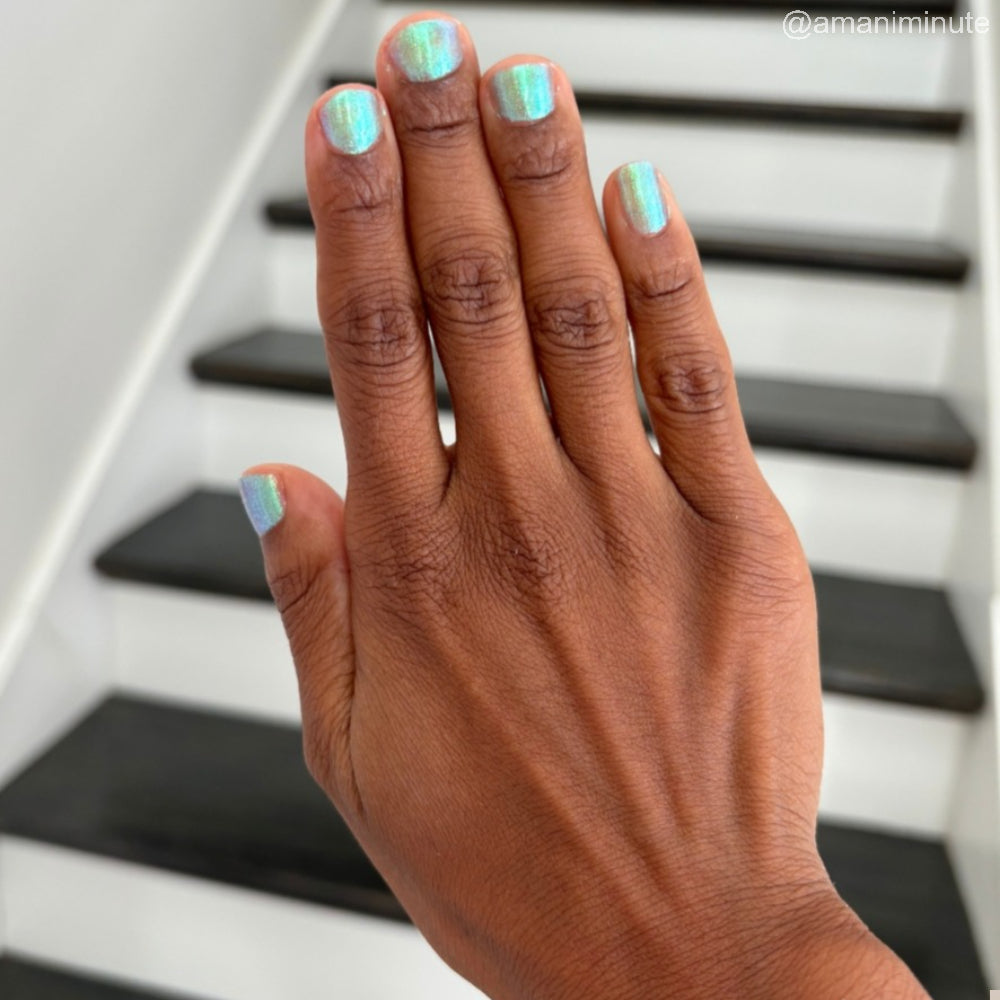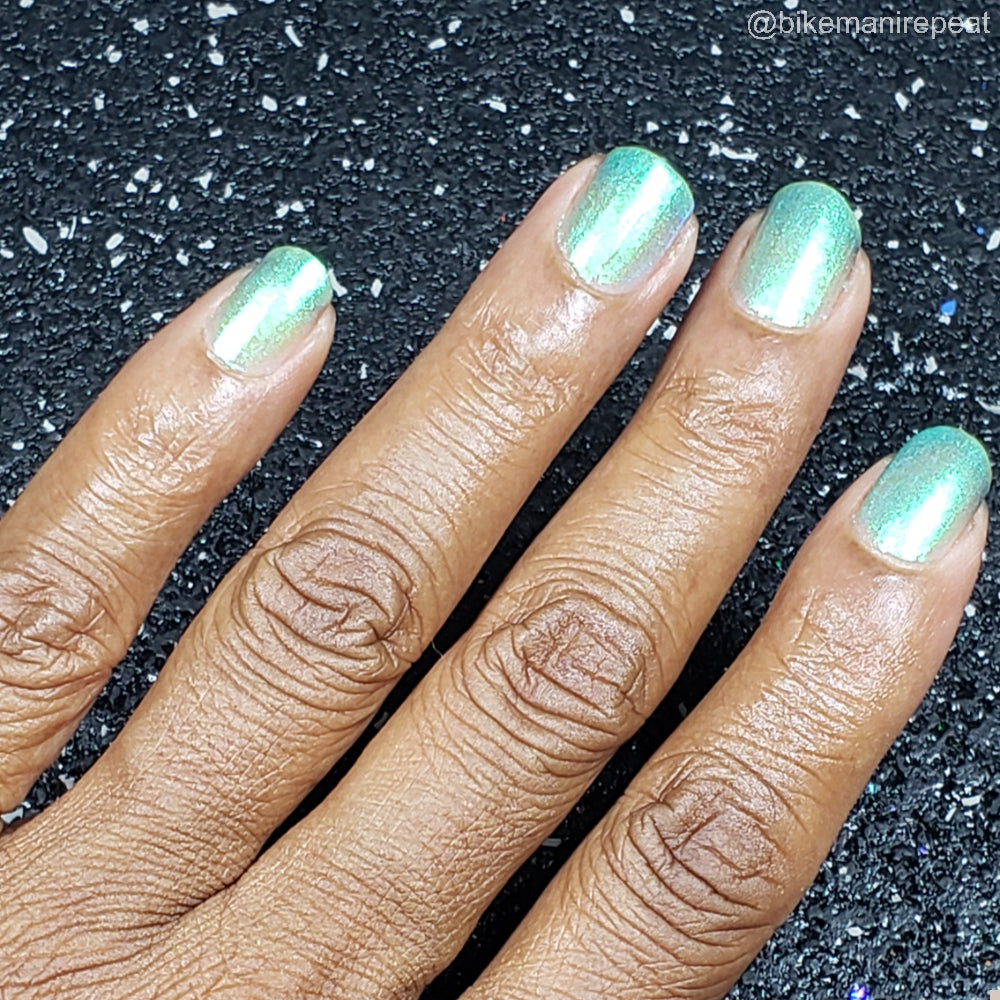 Phlegmatic has an aqua base with shimmering blue and green micro flakes and blue-green metallic-like shifting shimmer. The flakes may settle at the bottom of the bottle. Shake well or leave upside down for 2-3 minutes before applying.