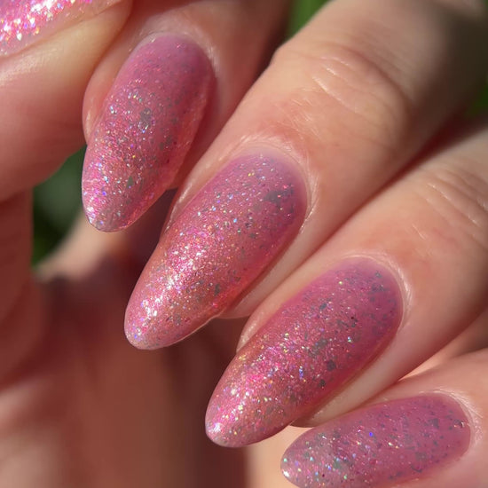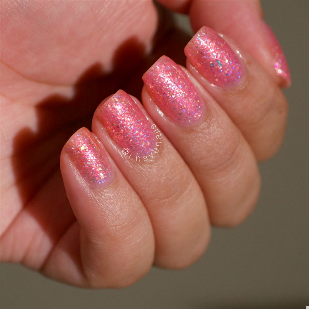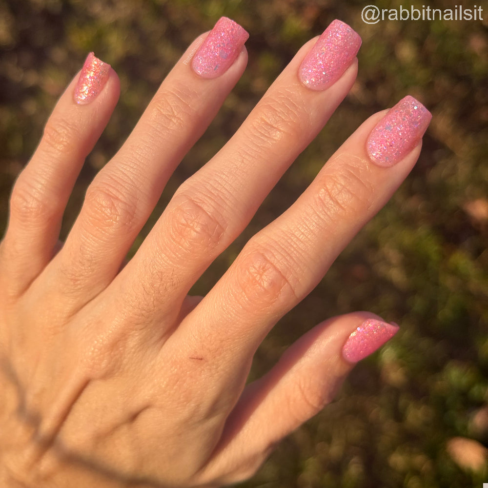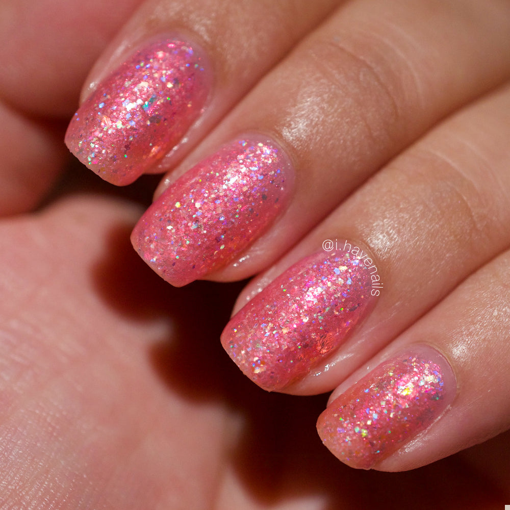 Bubblegum pink base packed with clear holographic glitter and rainbow micro glitters, with red-orange-green iridescent shimmer and large red-pink iridescent flakes. Blacklight reactive. Inspired by Sailor Chibi Moon.
