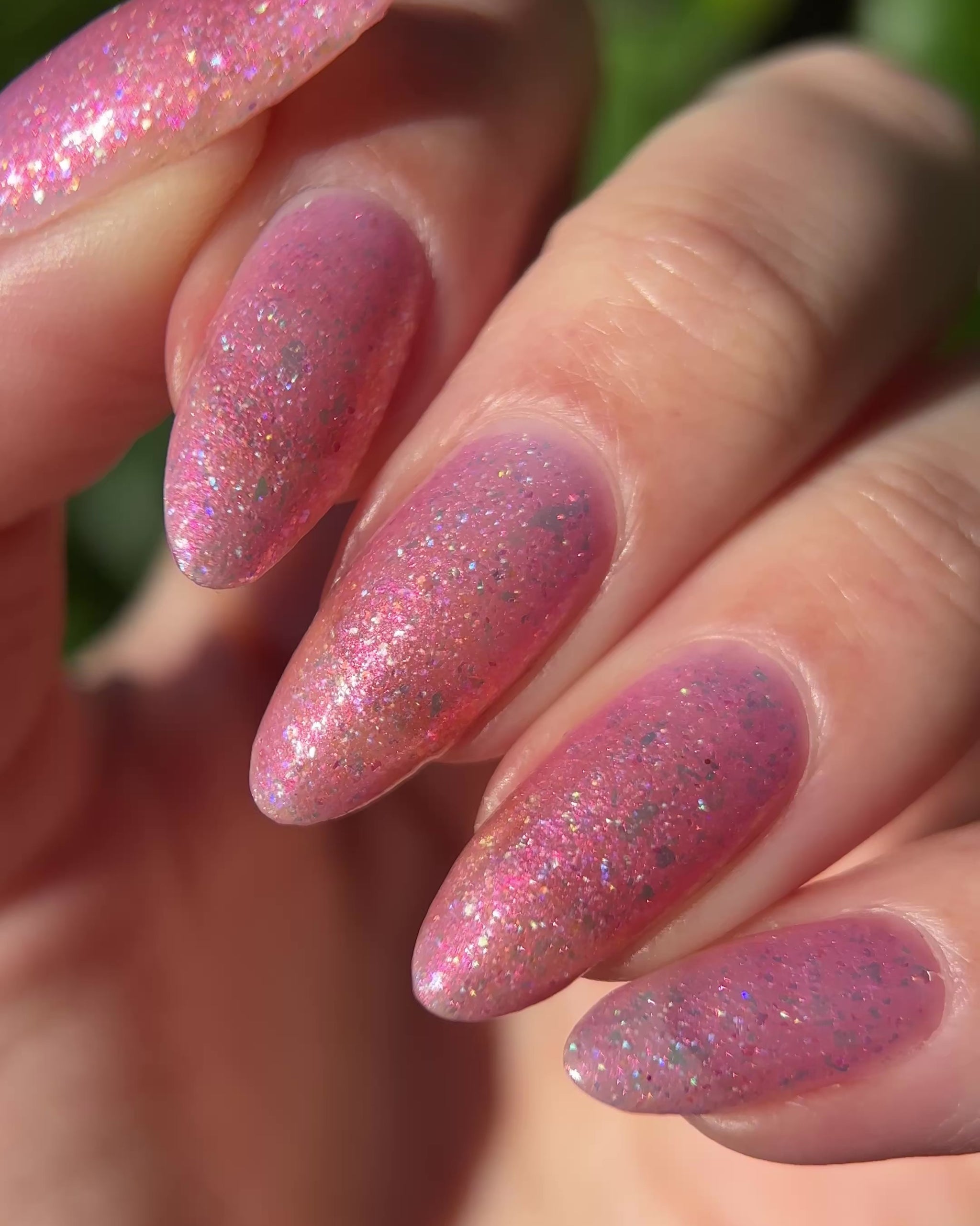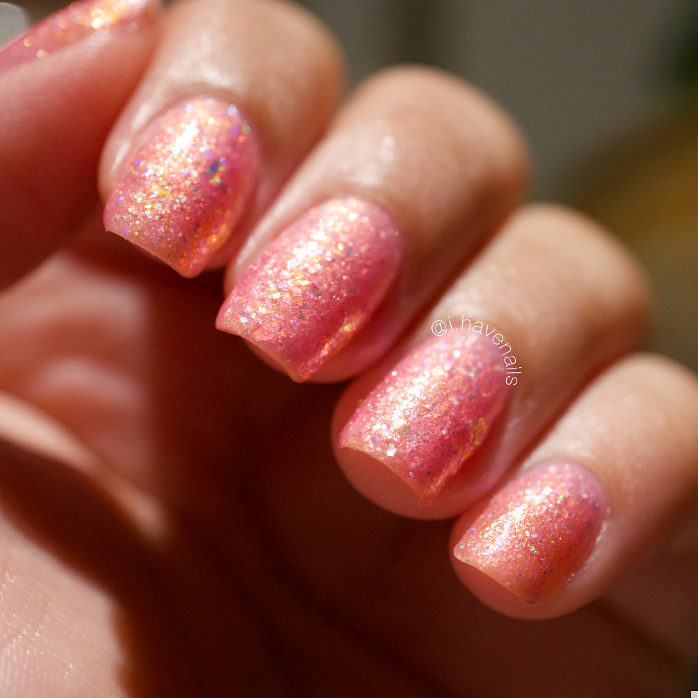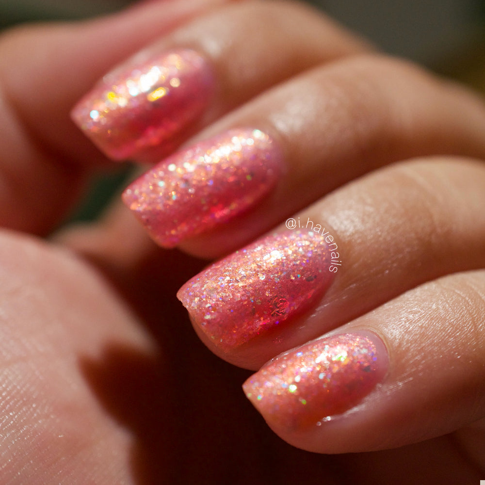 Bubblegum pink base packed with clear holographic glitter and rainbow micro glitters, with red-orange-green iridescent shimmer and large red-pink iridescent flakes. Blacklight reactive. Inspired by Sailor Chibi Moon.