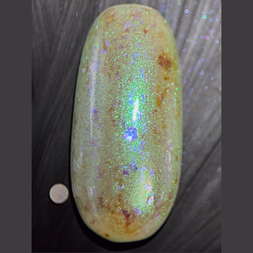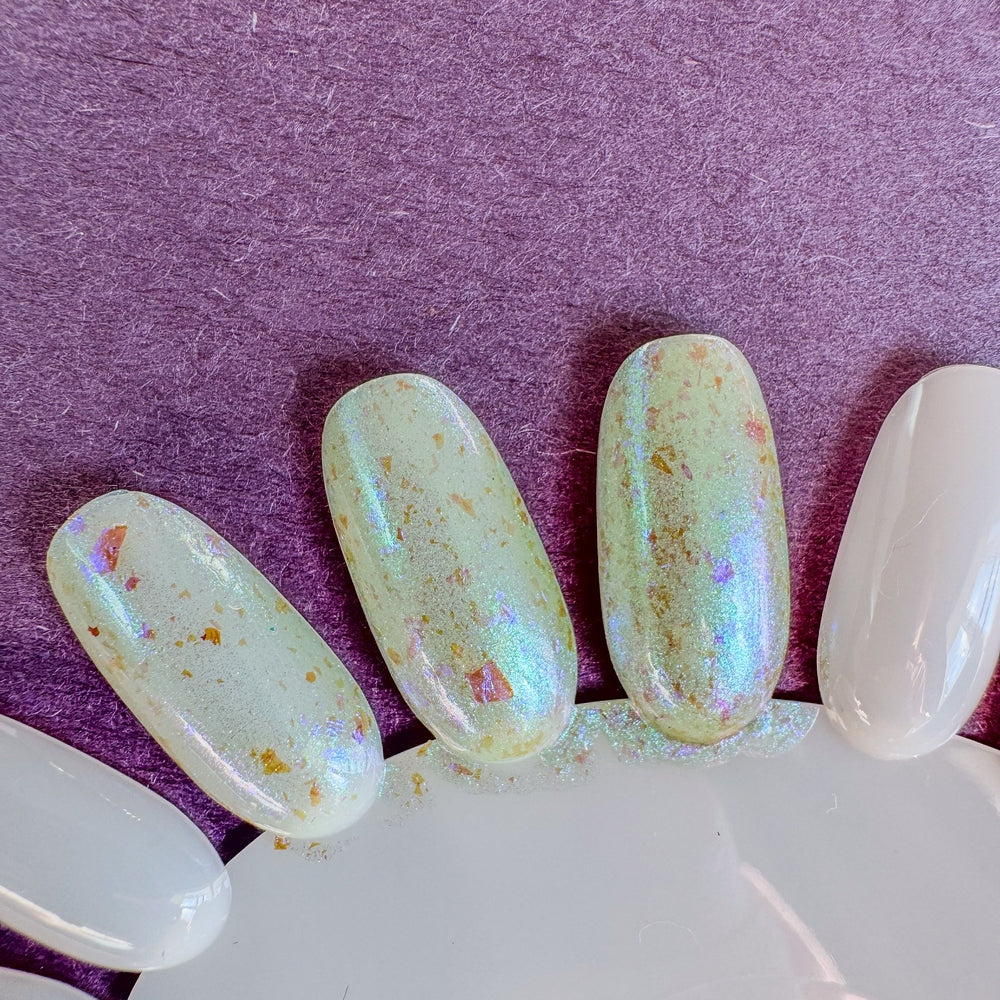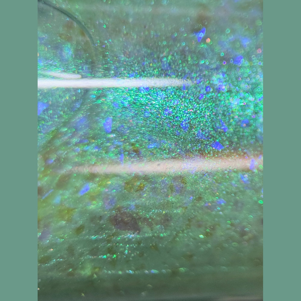 Sheer clear base with light shimmering green aurora and large blue-magenta-violet shifting chameleon flakes.
