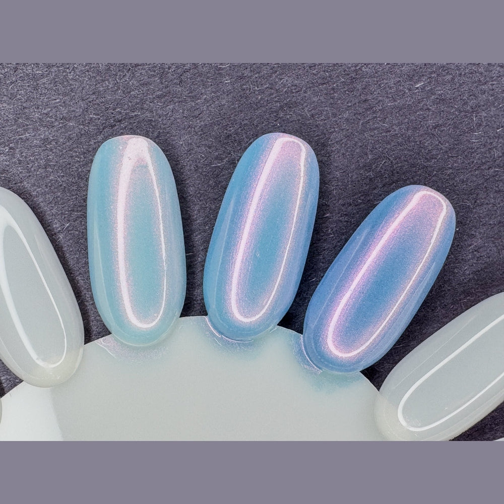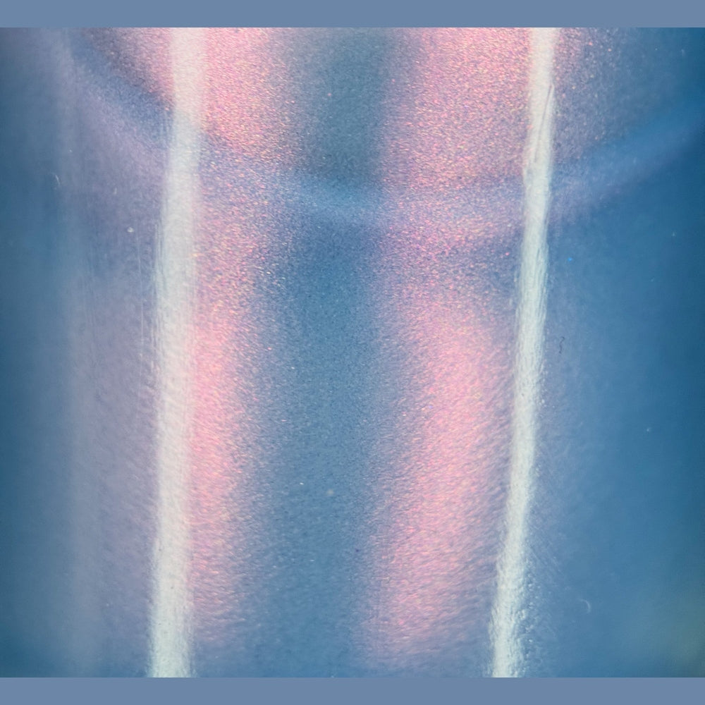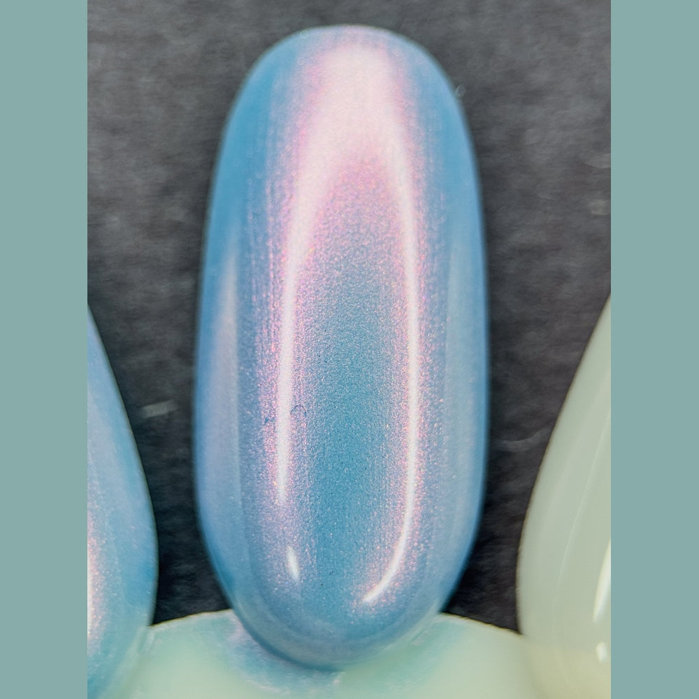 Light blue base with pink-red aurora shimmer that’s reminiscent of spring morning rain or fog.