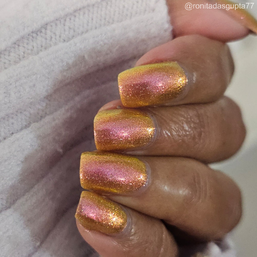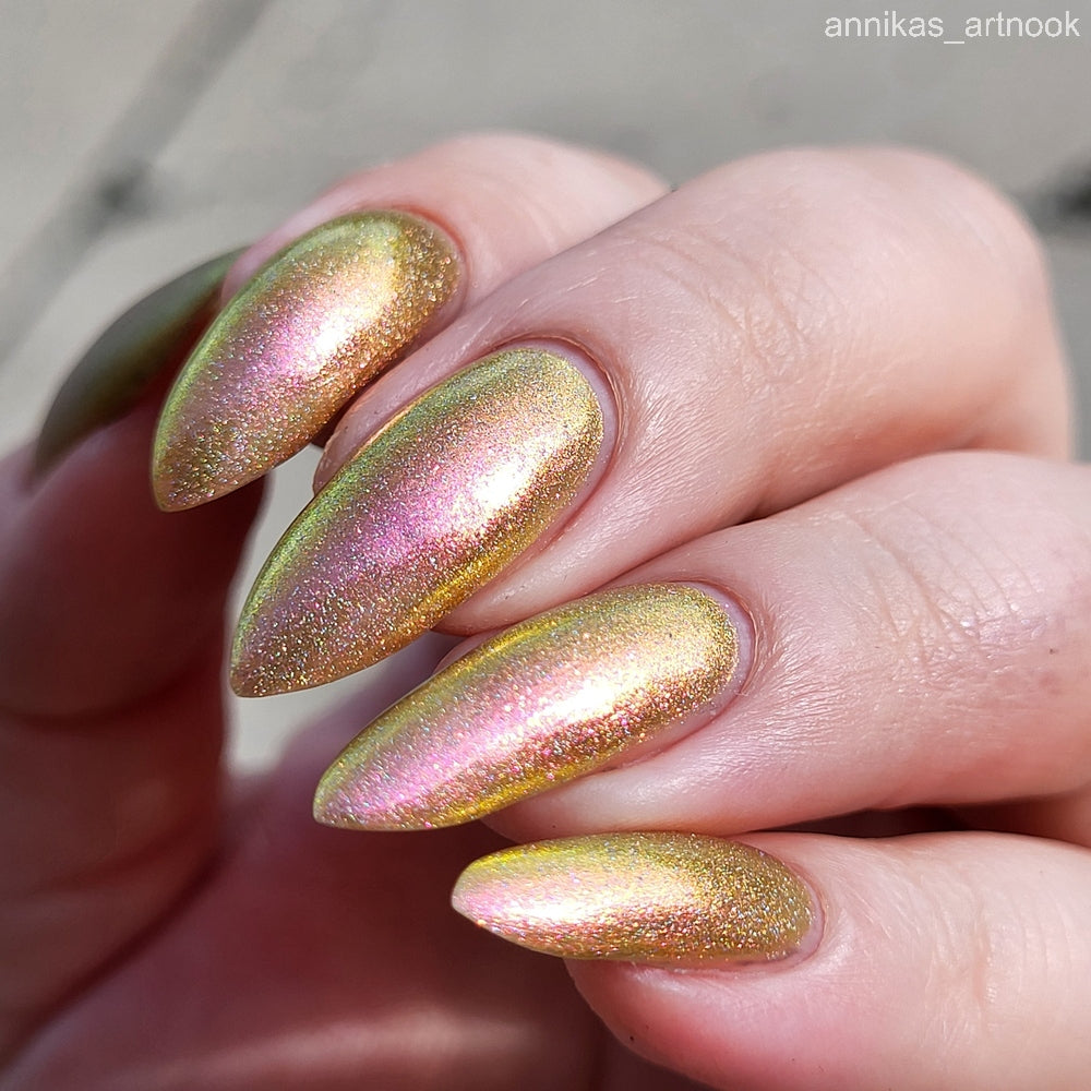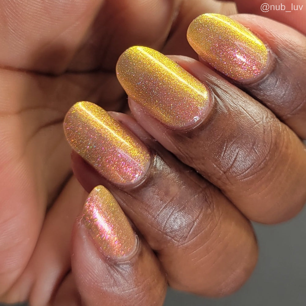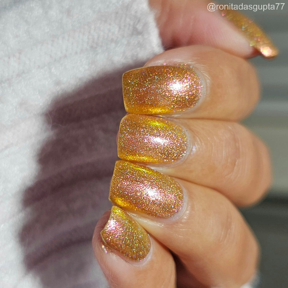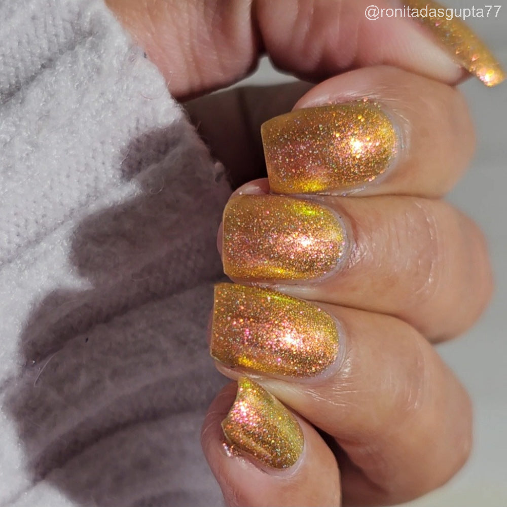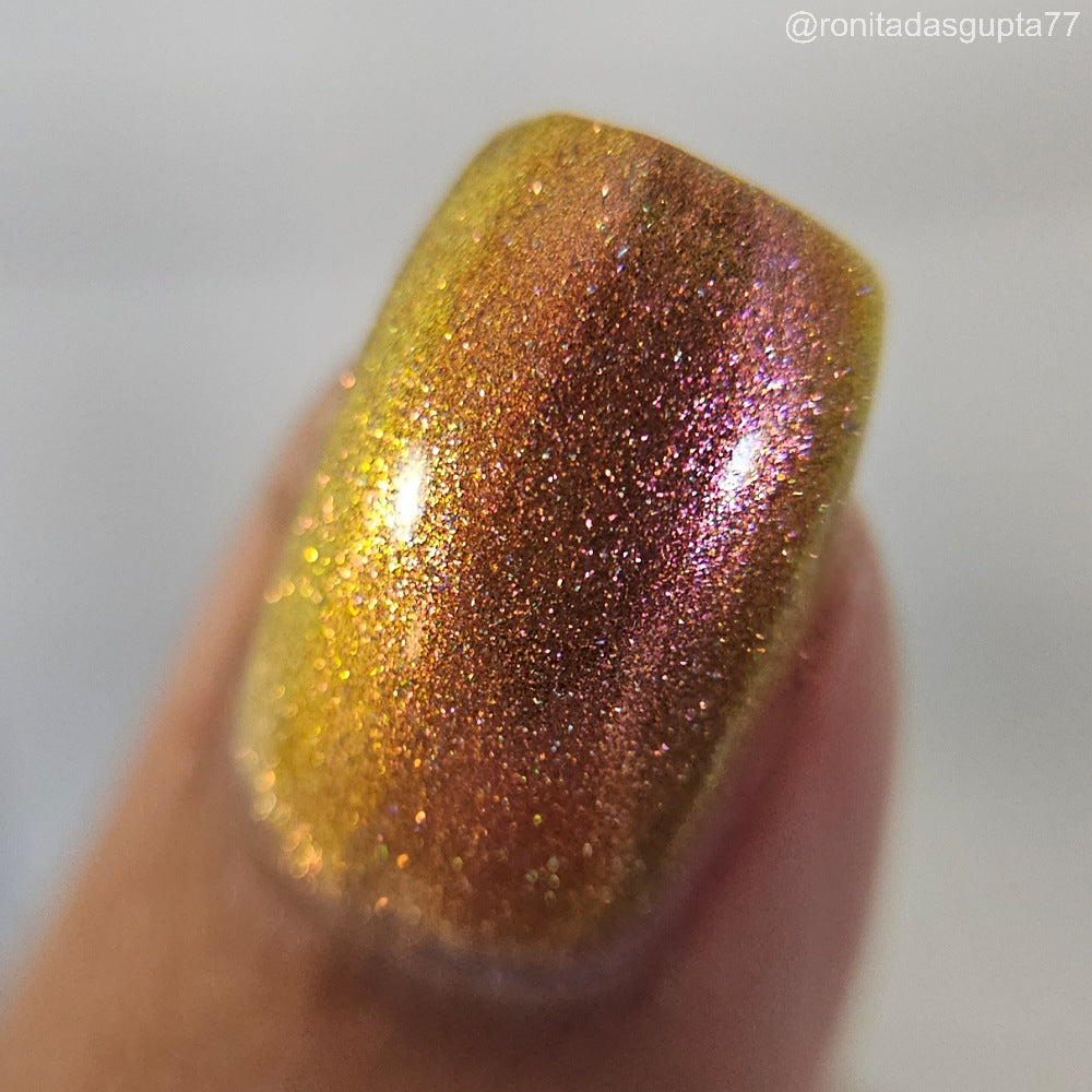 Orange-yellow-pink shifting chameleon base packed with scattered holographic pigment.