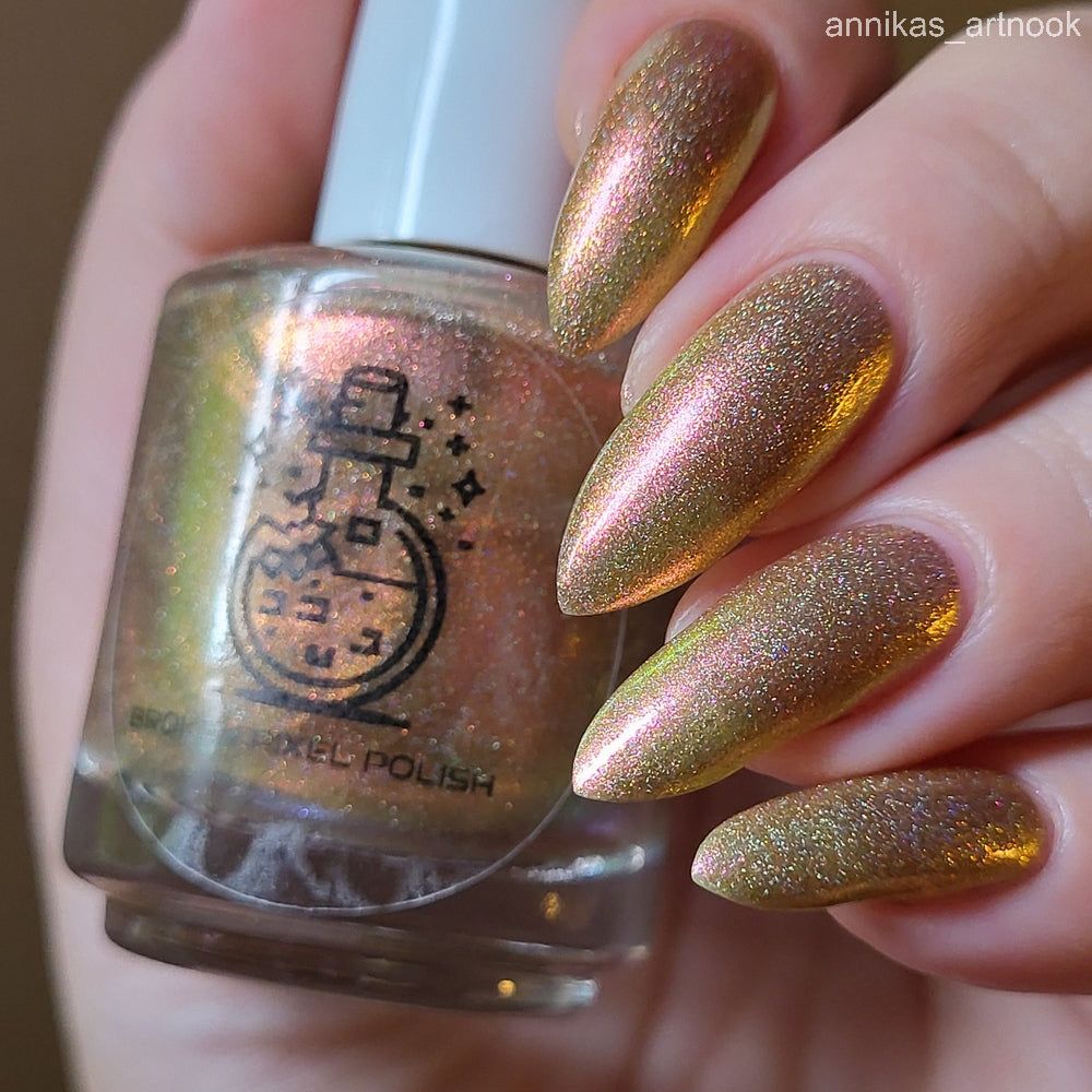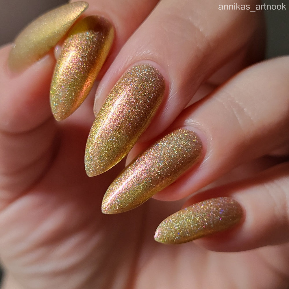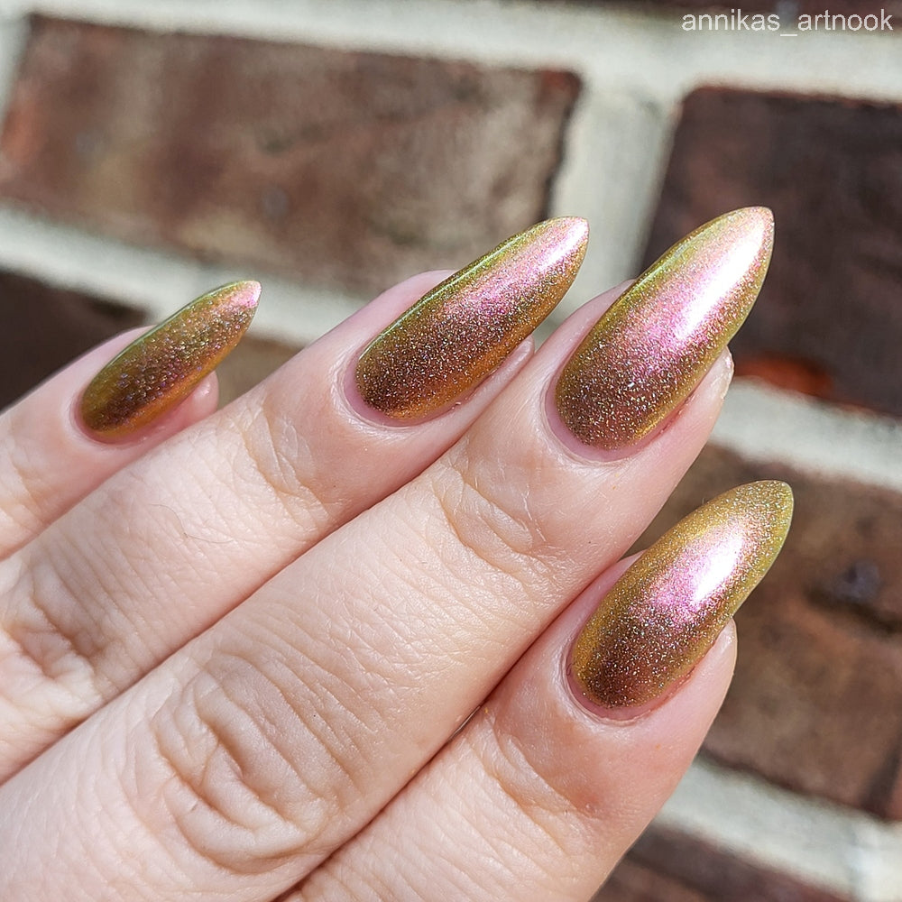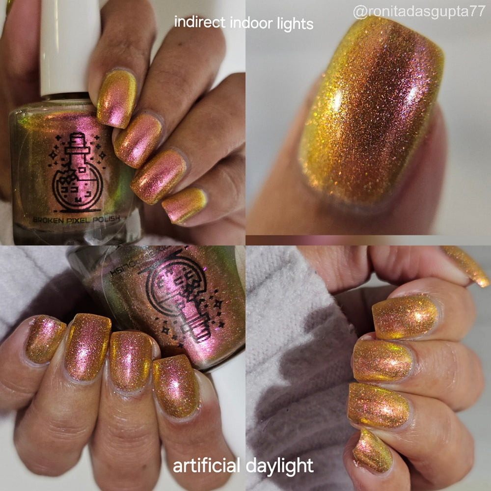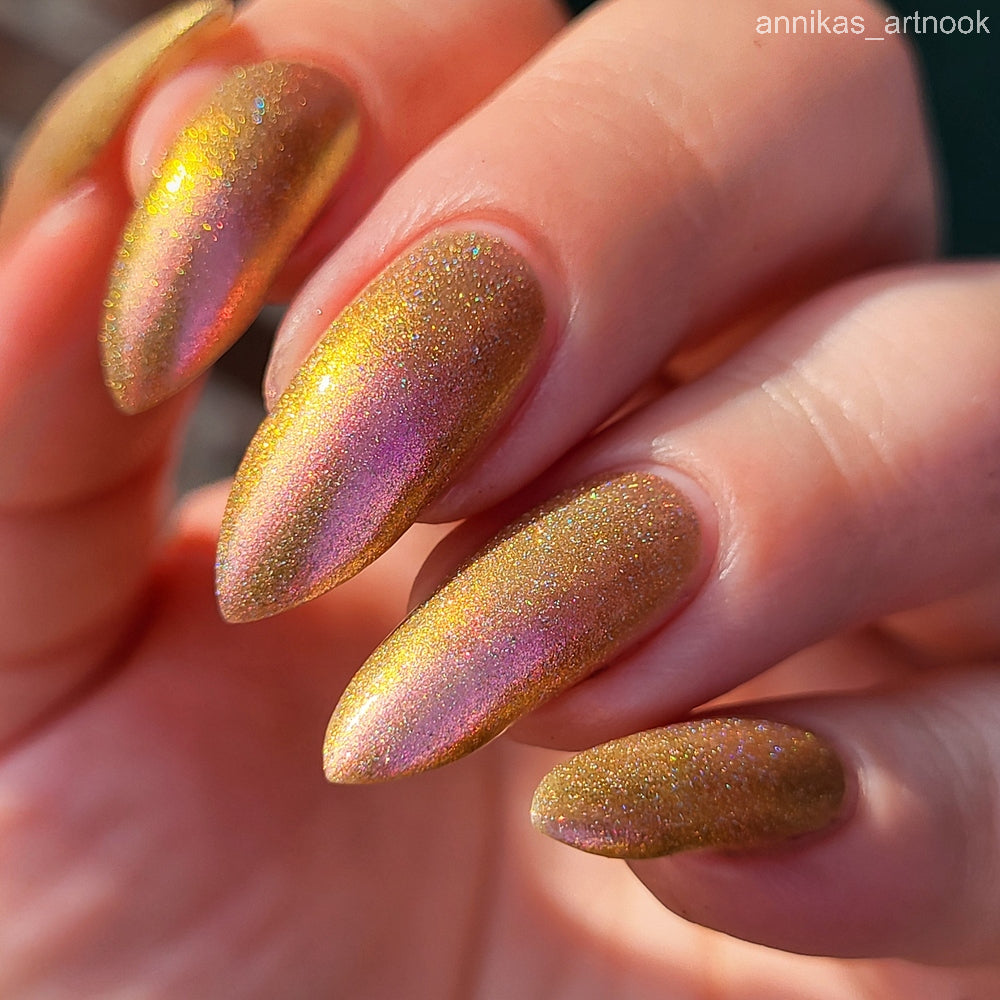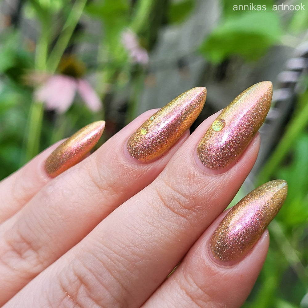 Orange-yellow-pink shifting chameleon base packed with scattered holographic pigment.