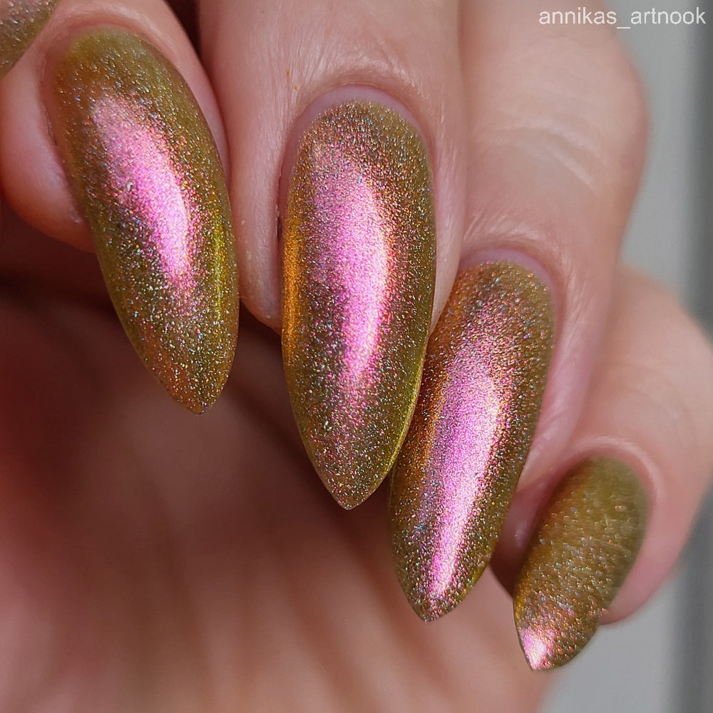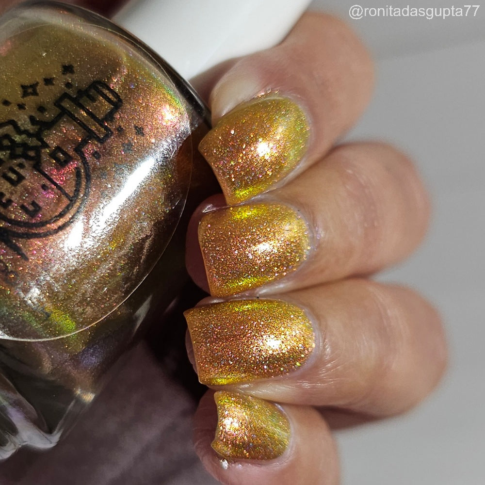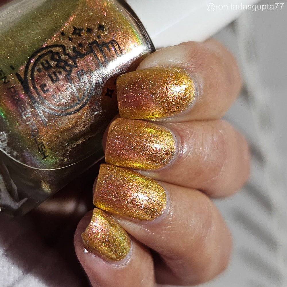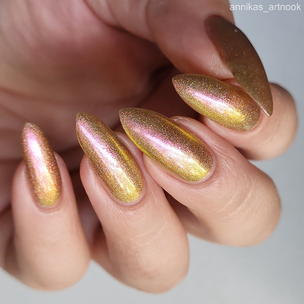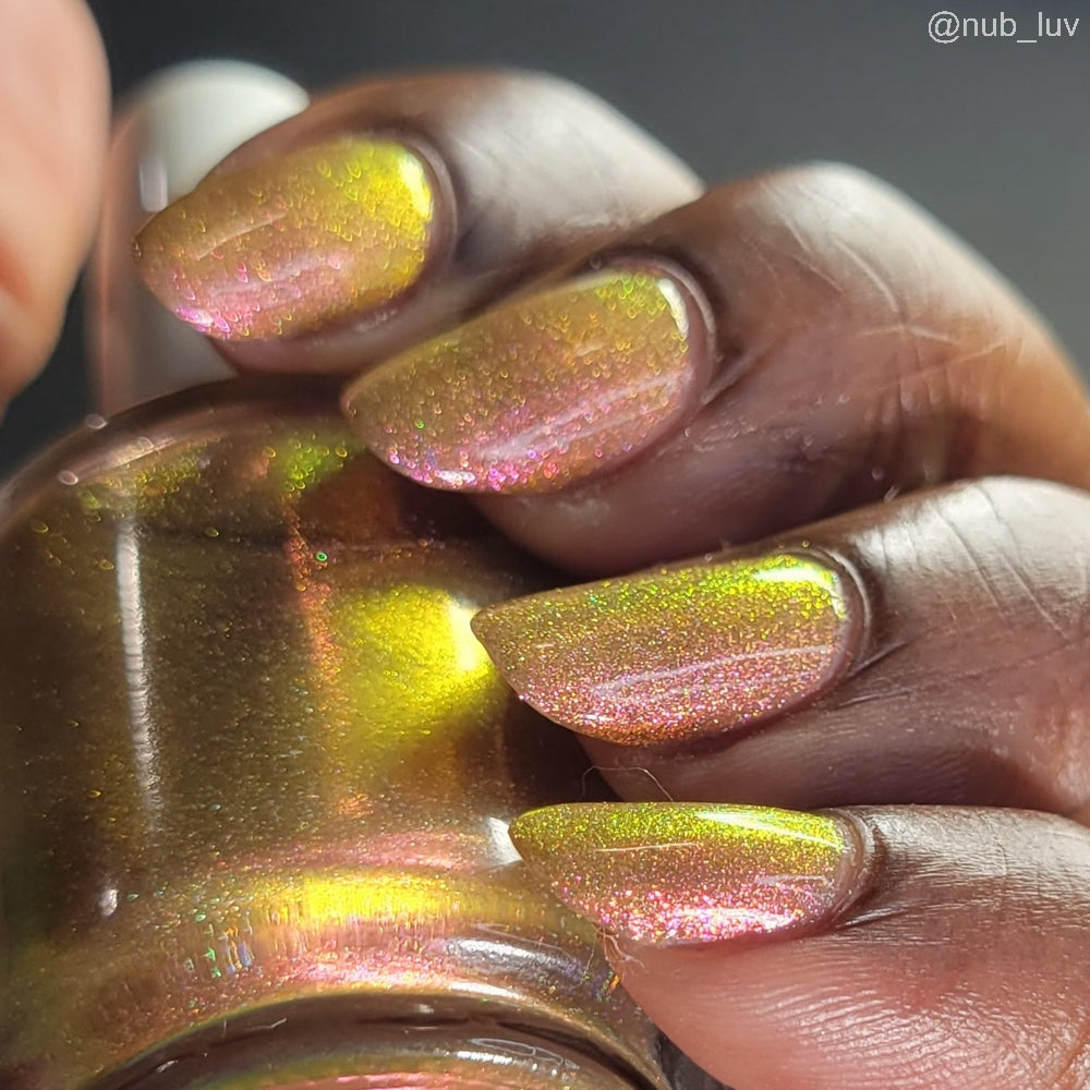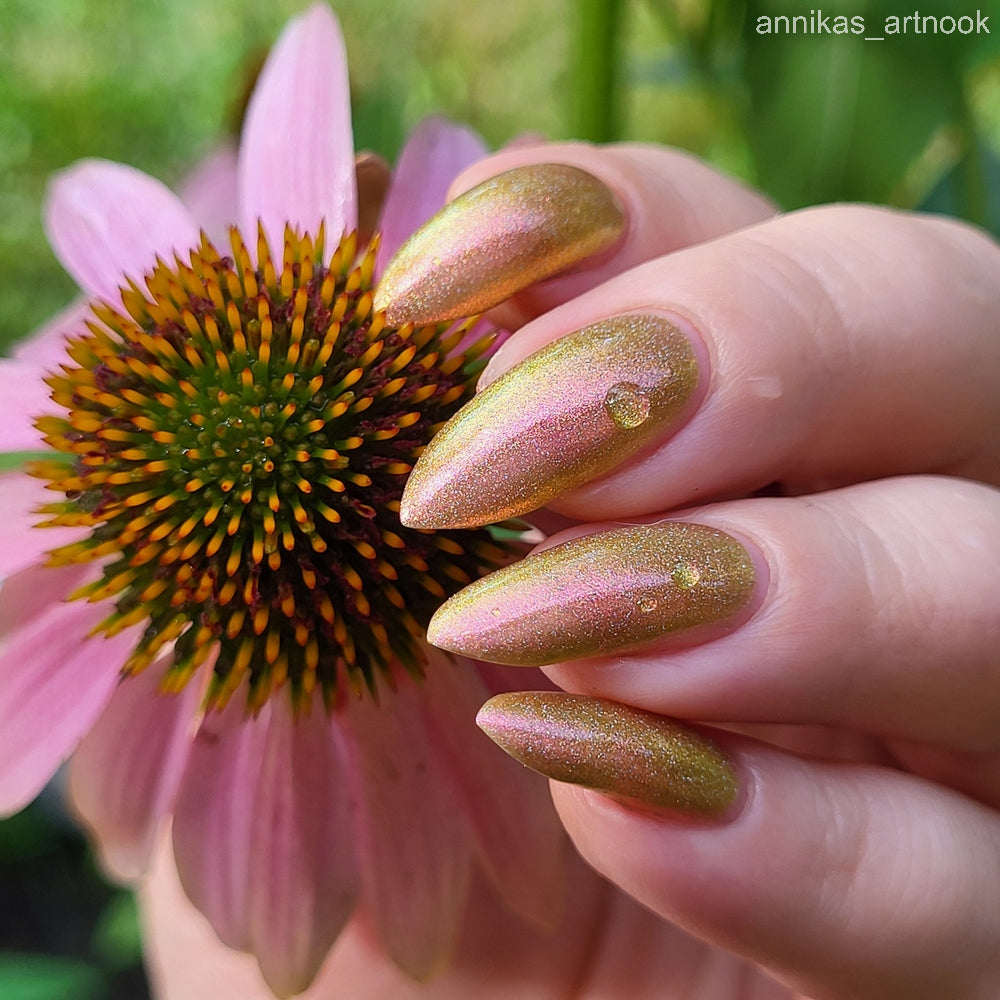 Orange-yellow-pink shifting chameleon base packed with scattered holographic pigment.