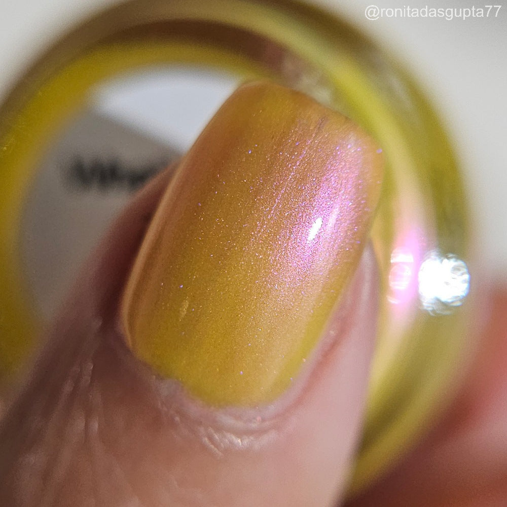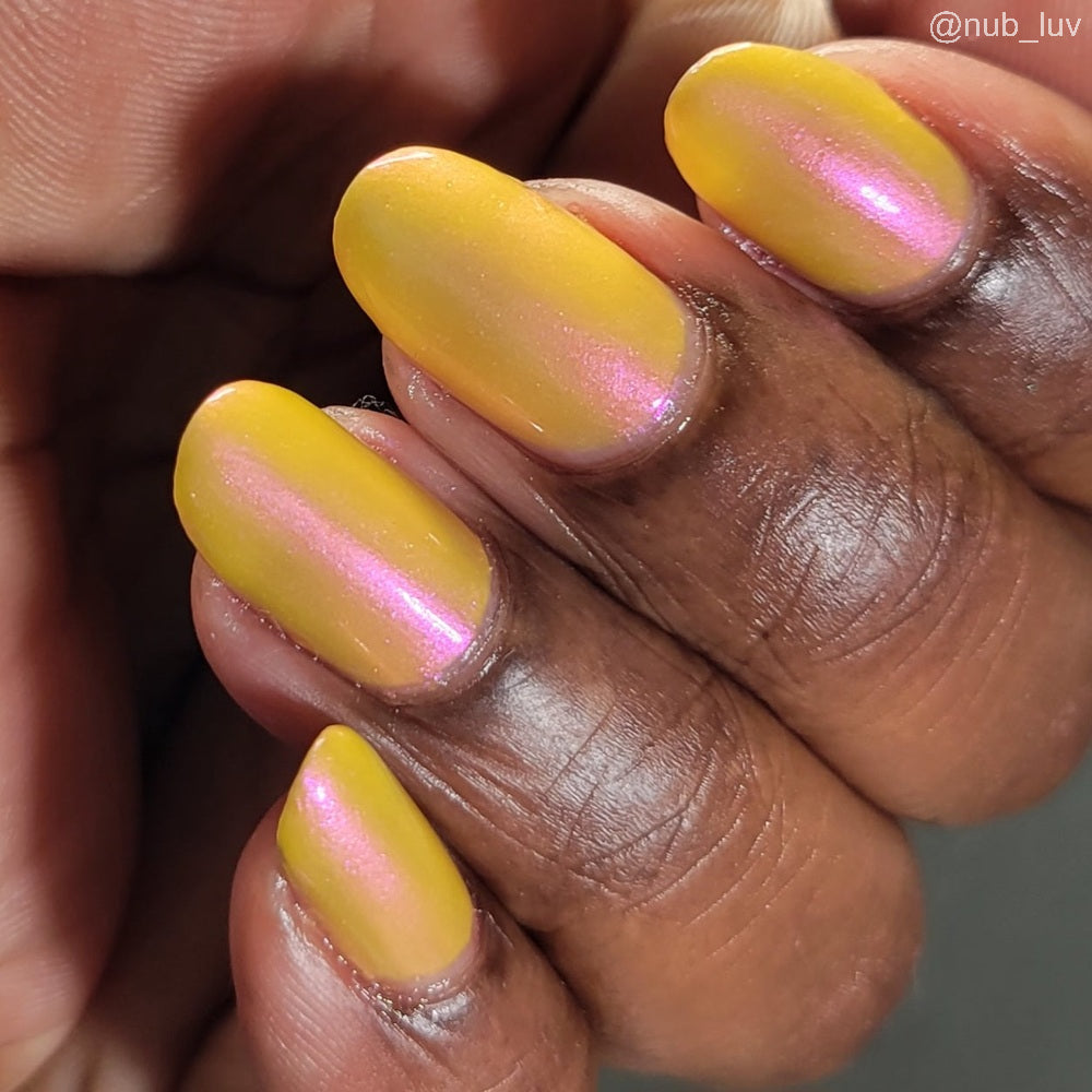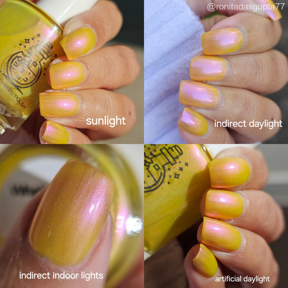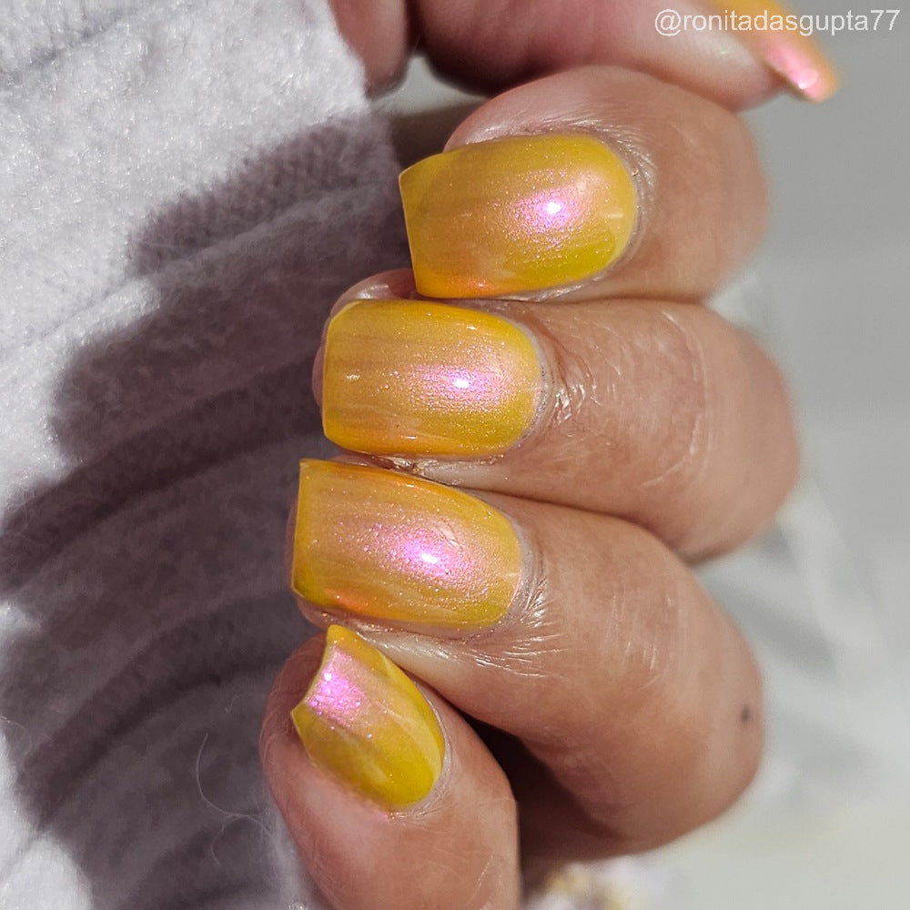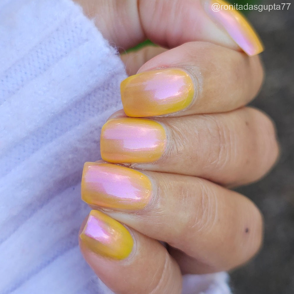 Sheer mustard yellow base with a soft violet aurora. In the sun the violet shines through. In indoor light and shade, the polish transforms and may appear more yellow, or even pink-orange (depending on lighting).