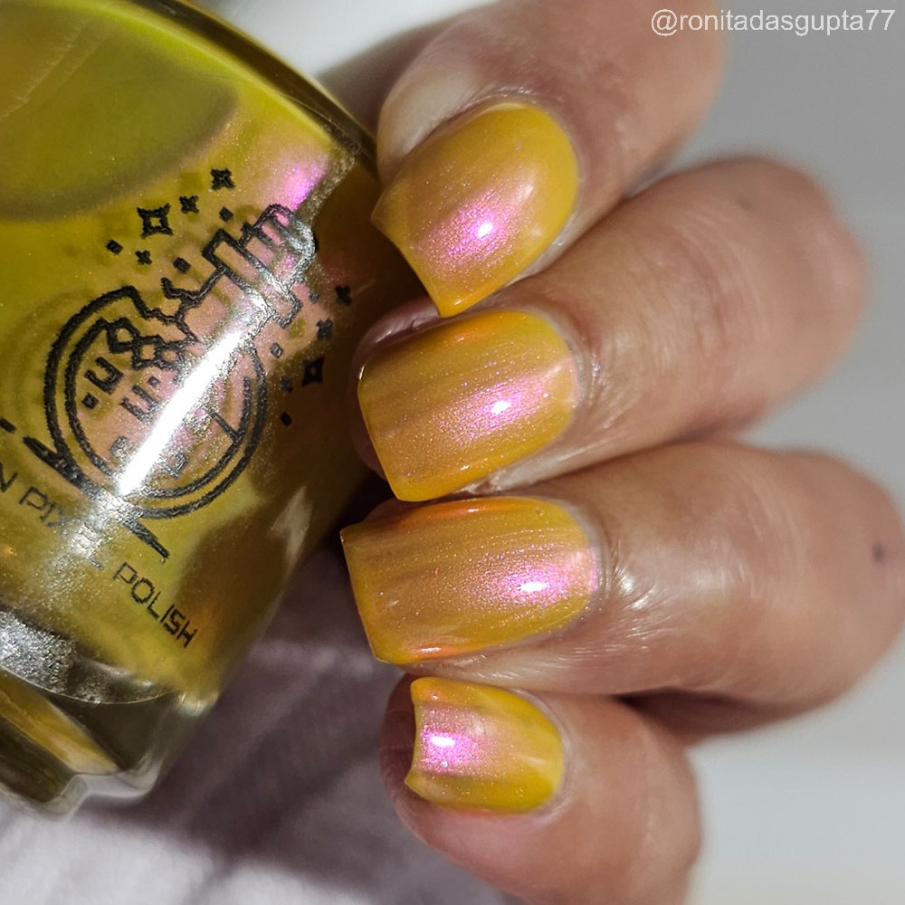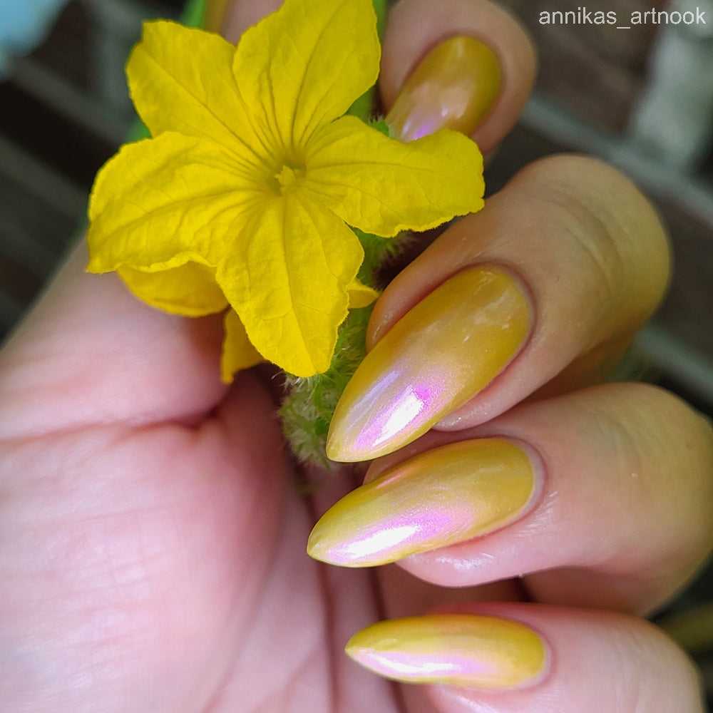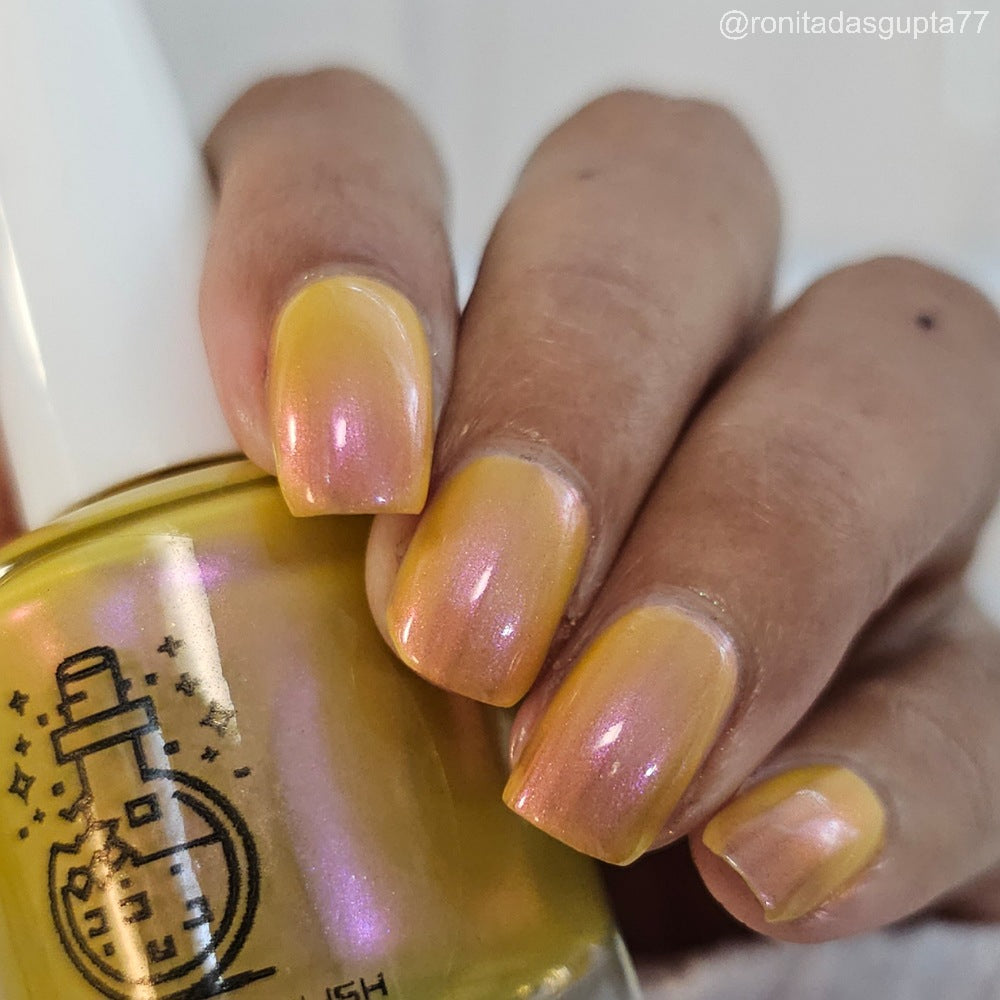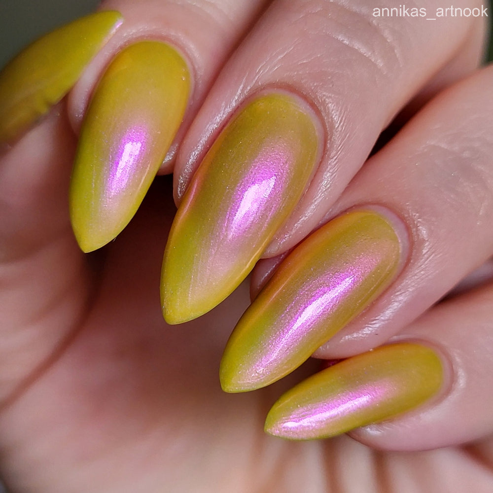 Sheer mustard yellow base with a soft violet aurora. In the sun the violet shines through. In indoor light and shade, the polish transforms and may appear more yellow, or even pink-orange (depending on lighting).