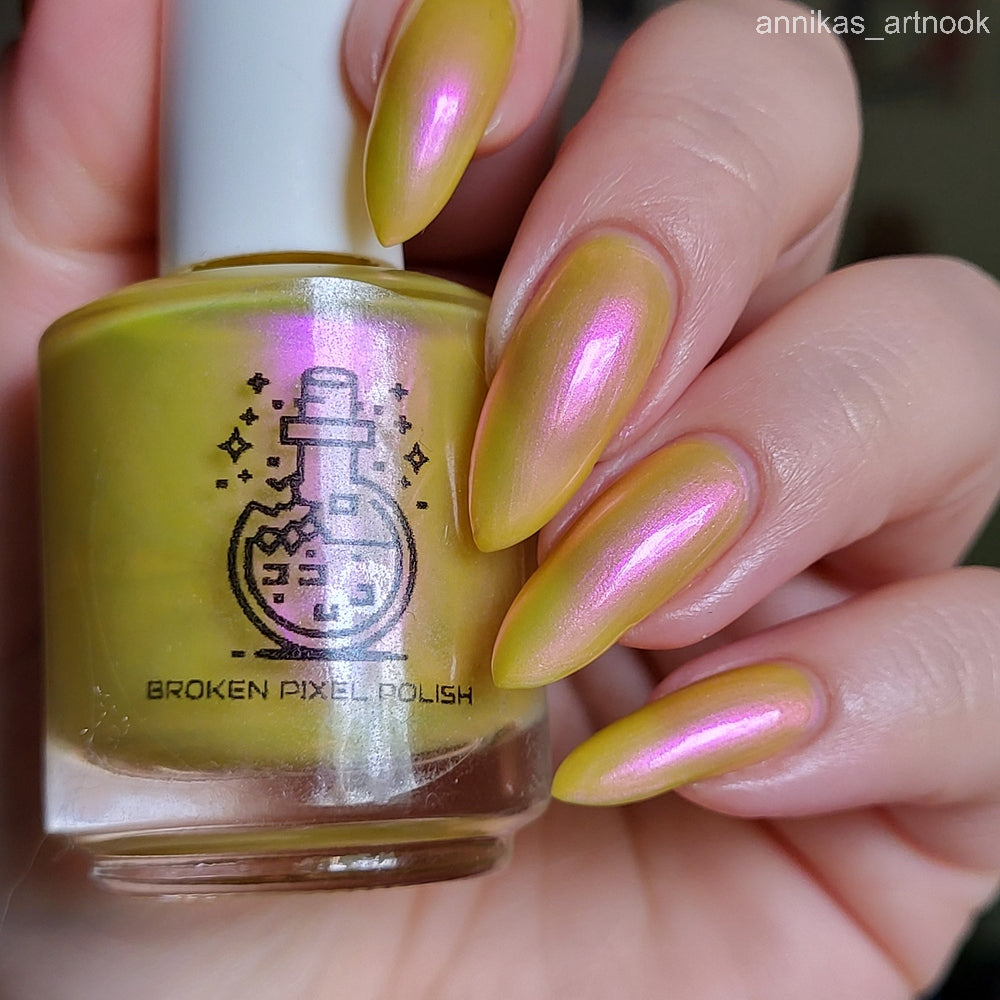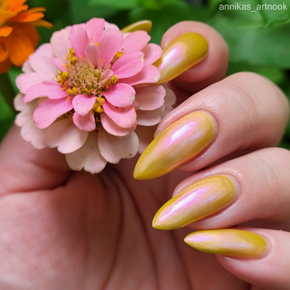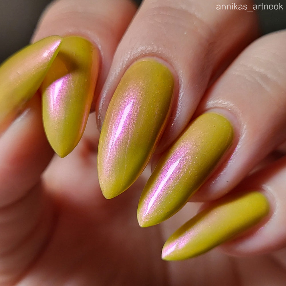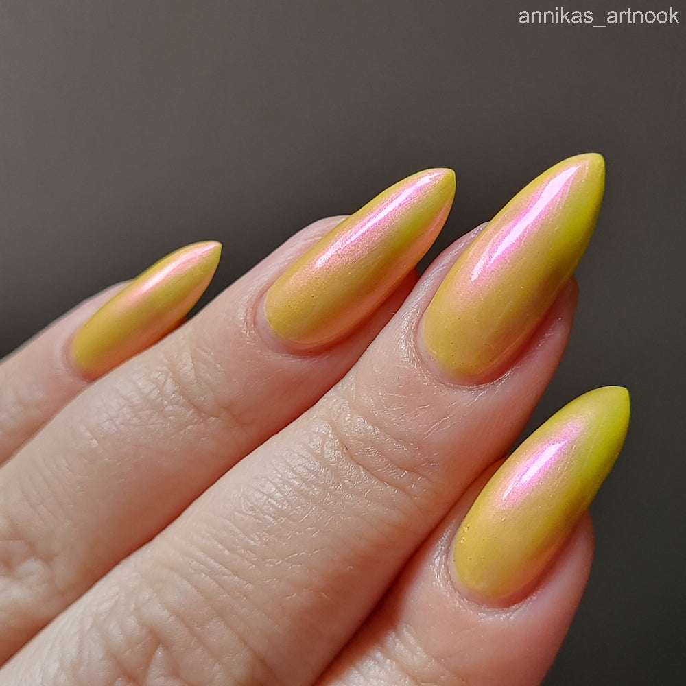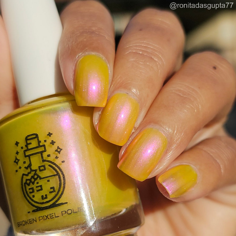 Sheer mustard yellow base with a soft violet aurora. In the sun the violet shines through. In indoor light and shade, the polish transforms and may appear more yellow, or even pink-orange (depending on lighting).